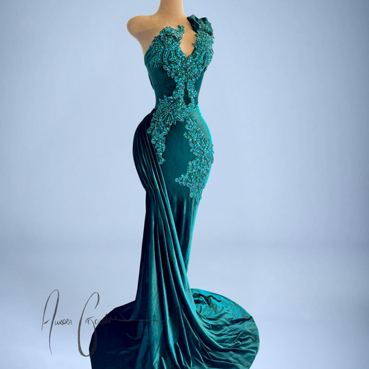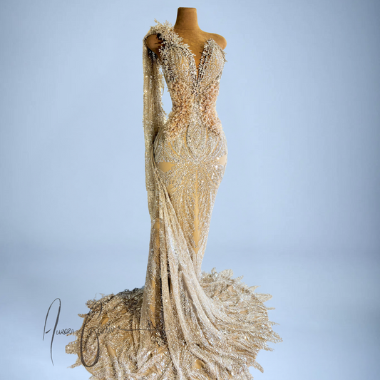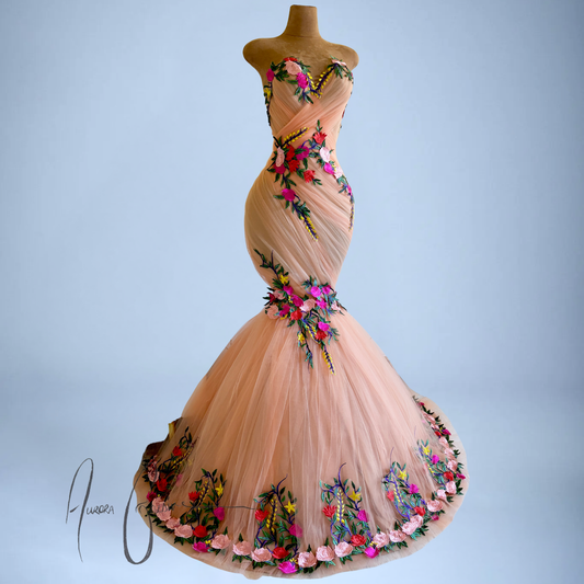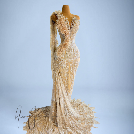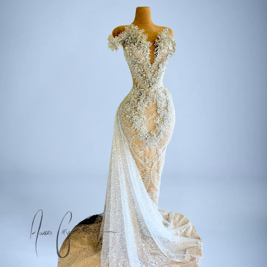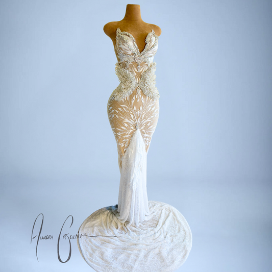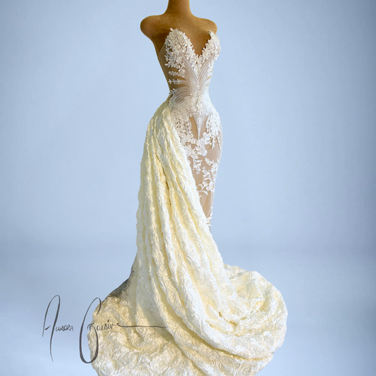 Made from the finest materials, our bespoke, handcrafted dresses. Debrena designs all the dresses in studio in the United States. She chooses every bead, every rhinestone and curates every piece of fabric. We’ve adapted a sustainable technique of using 100% of the materials we purchase once the fabric is cut. We utilize every part of our fabrics using smaller pieces to create flounces, handmade flowers and embellishments of all kinds. All dresses are hand beaded or have handmade flowers. We take pride in making our bride feel as if she’s the most beautiful woman in the room. Selecting the best fabrics that will suit her skin tone, by adding the right amount of lace or beading to create an hour glass silhouette. This is luxury, this is Aurora Goldiv.