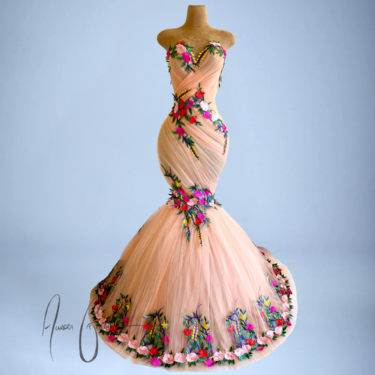 Made from the finest materials, our bespoke, handcrafted dresses. Debrena designs all the dresses in studio in the United States. She chooses every bead, every rhinestone and curates every piece of fabric. We’ve adapted a sustainable technique of using 100% of the materials we purchase once the fabric is cut. We utilize every part of our fabrics using smaller pieces to create flounces, handmade flowers and embellishments of all kinds. All dresses are hand beaded or have handmade flowers. We take pride in making our bride feel as if she’s the most beautiful woman in the room. Selecting the best fabrics that will suit her skin tone, by adding the right amount of lace or beading to create an hour glass silhouette. This is luxury, this is Aurora Goldiv.