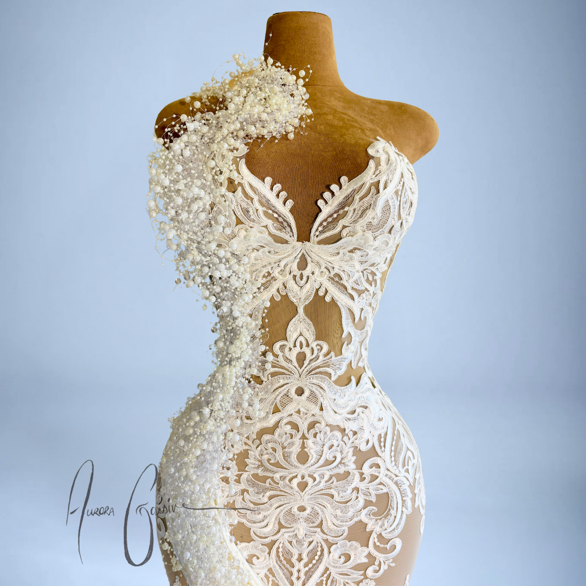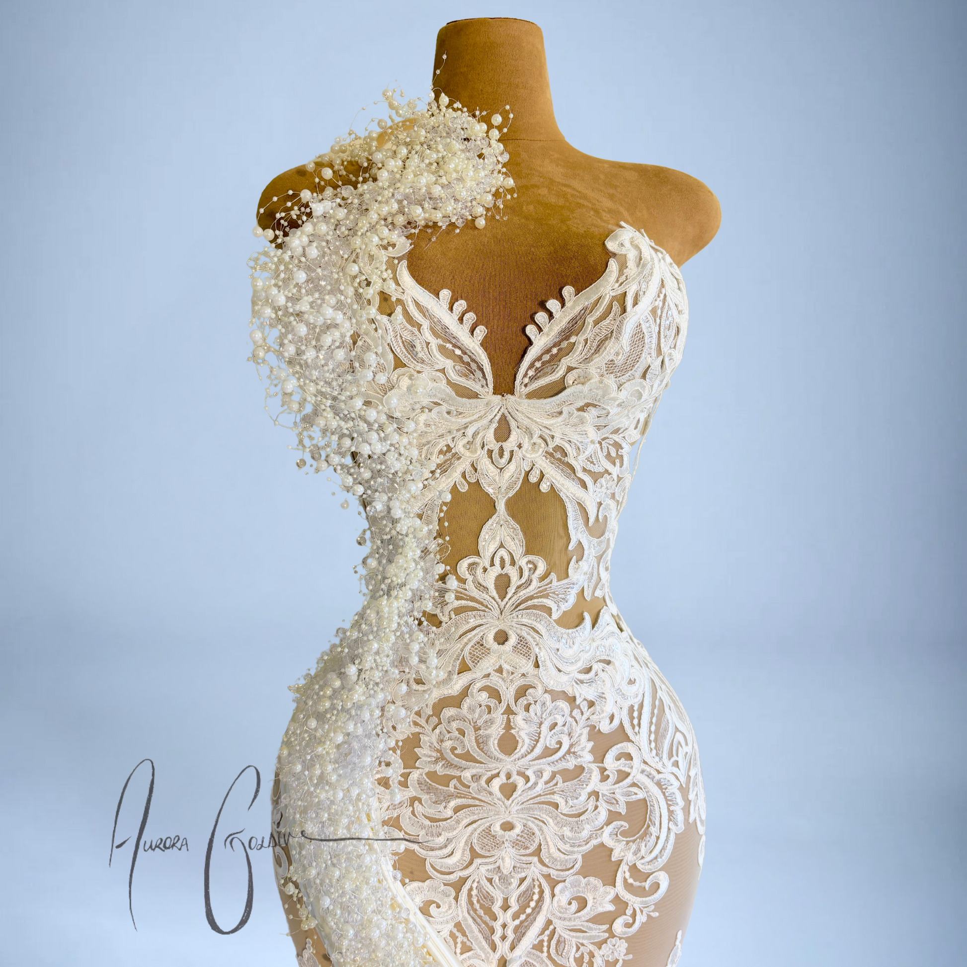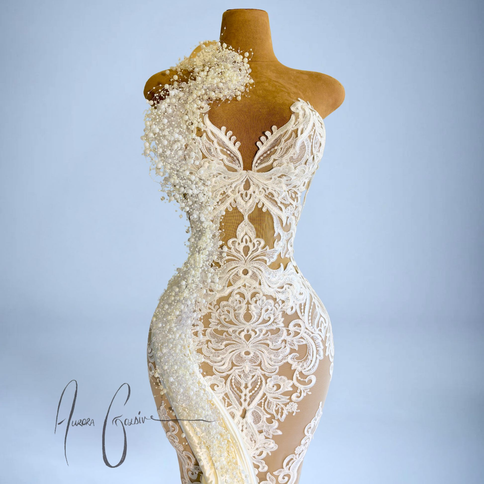 Aarisia is a stunning combination of modern bridal artistry and high fashion. For the fashion forward bride who wants to make a striking entrance and keep all eyes on her. The sweetheart neckline gives a subtle hint of sexy while the cascading side train is couture. The pearls flow effortlessly from the shoulder to the train of the dress giving a unique illusion of fluidity.