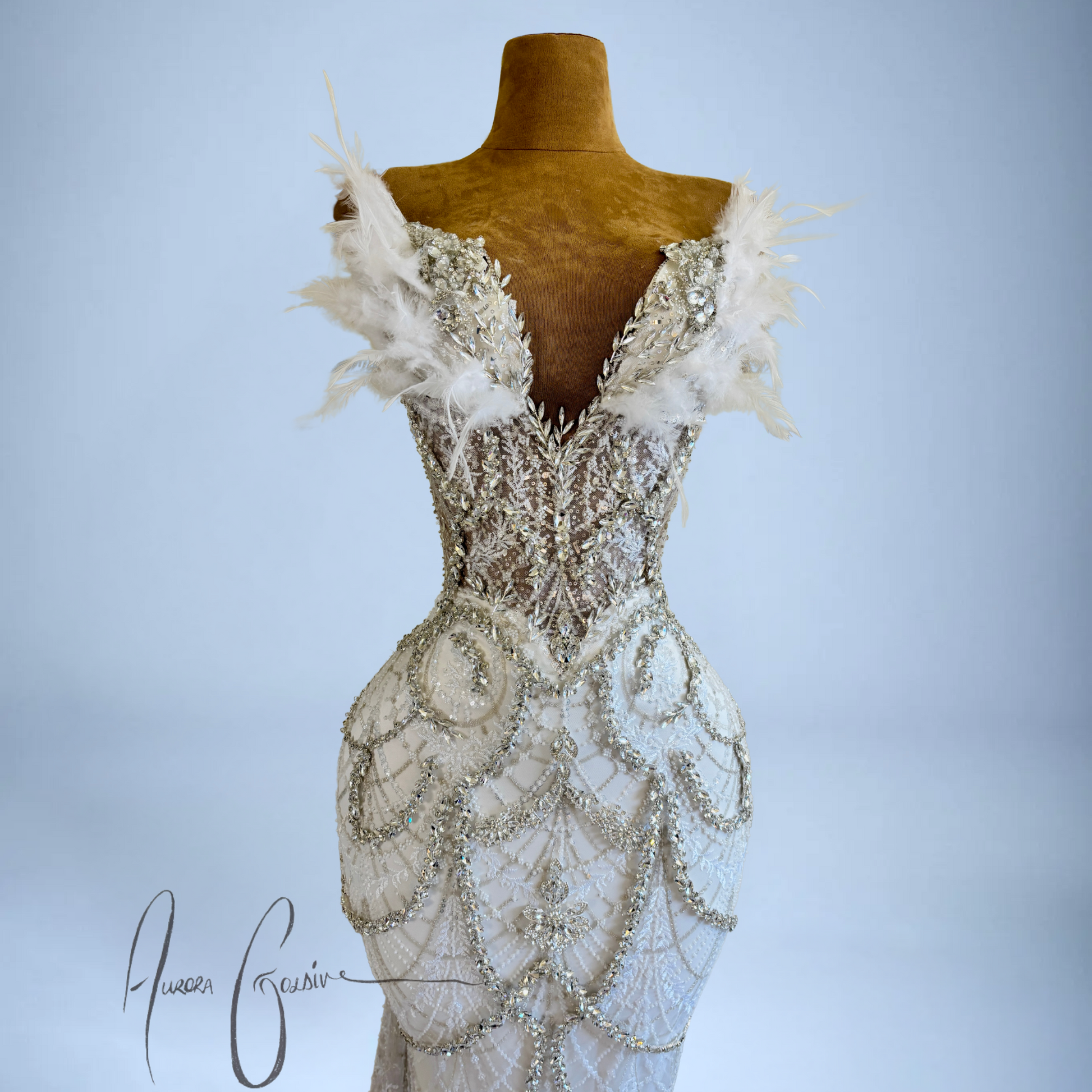• Features: Hand-embellished lace, gemstone adornment, dramatic feather embellishments