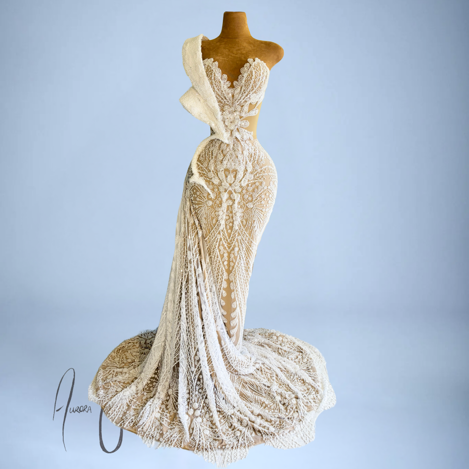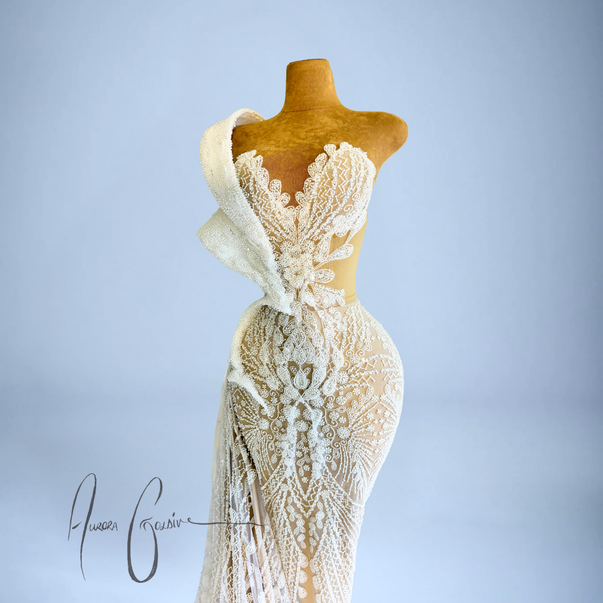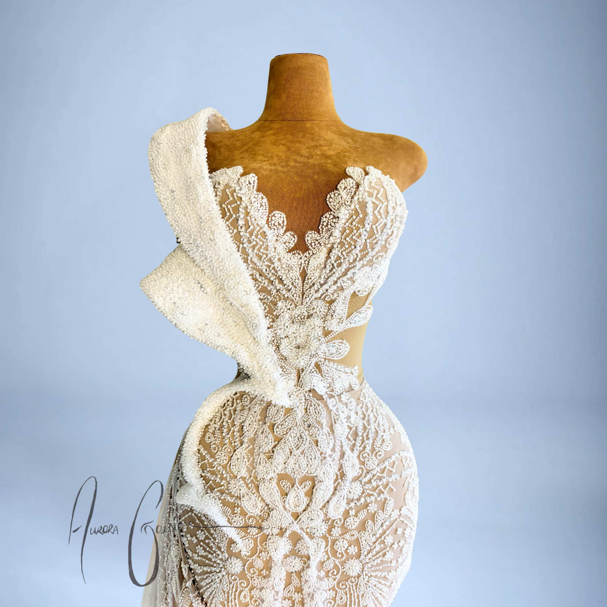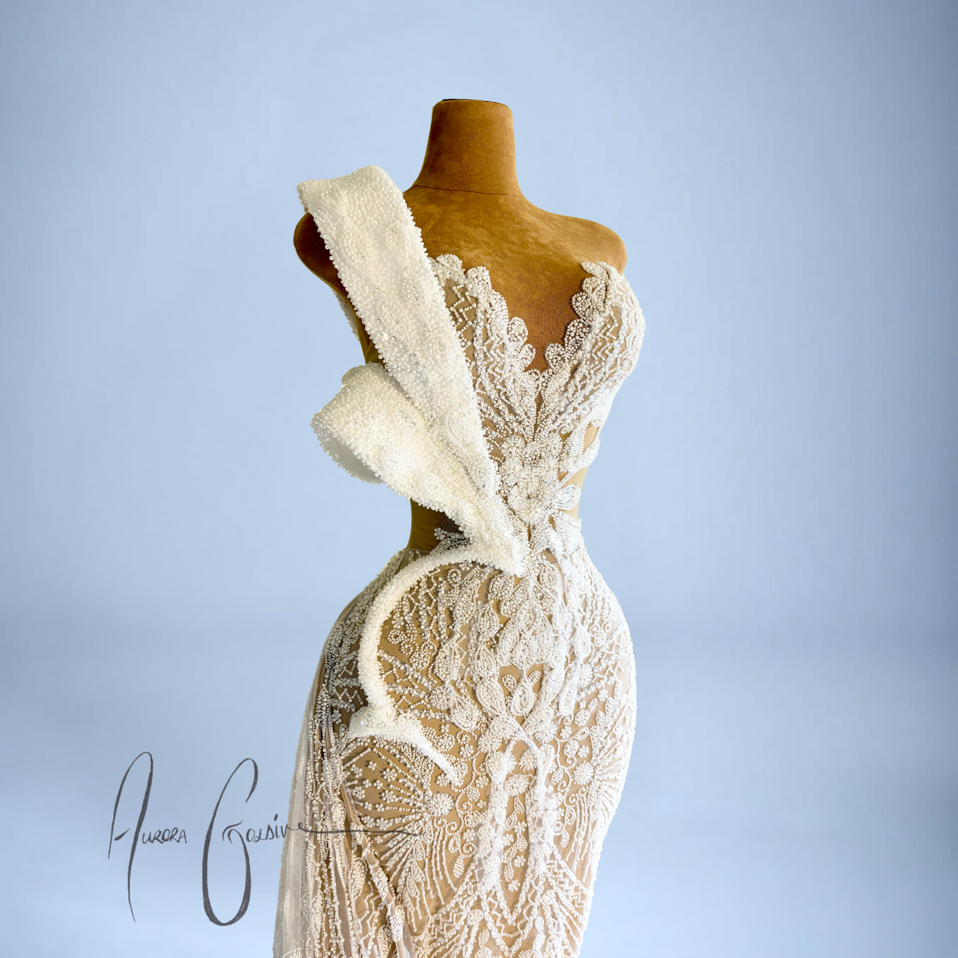 The most magical wedding dress you’ll ever behold. Alanis captures the pure essence of the modern bride. Covered in pearls from head to toe, carefully beaded and crafted with an hour glass silhouette in mind. With a touch of modern flair this beauty is perfection in every way.