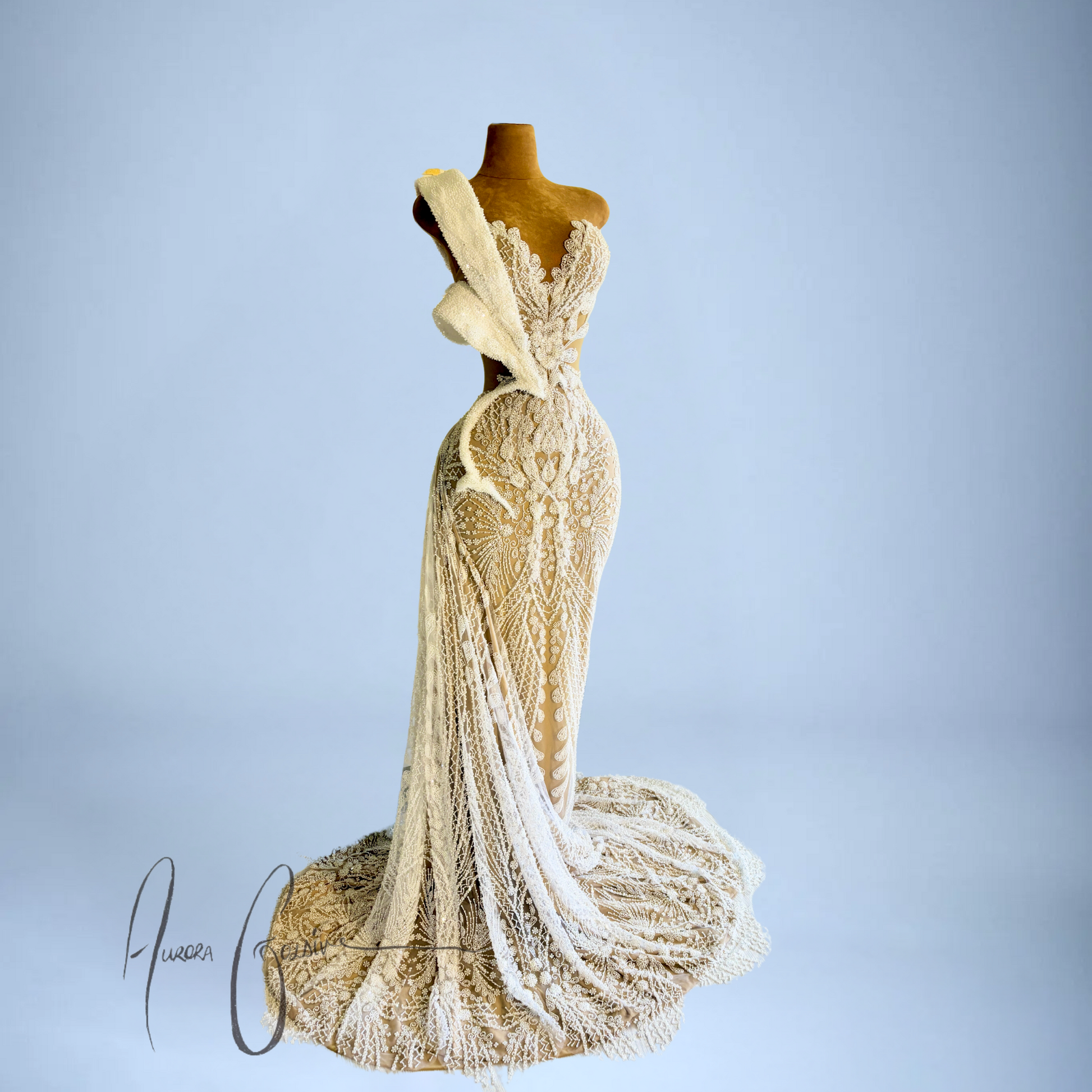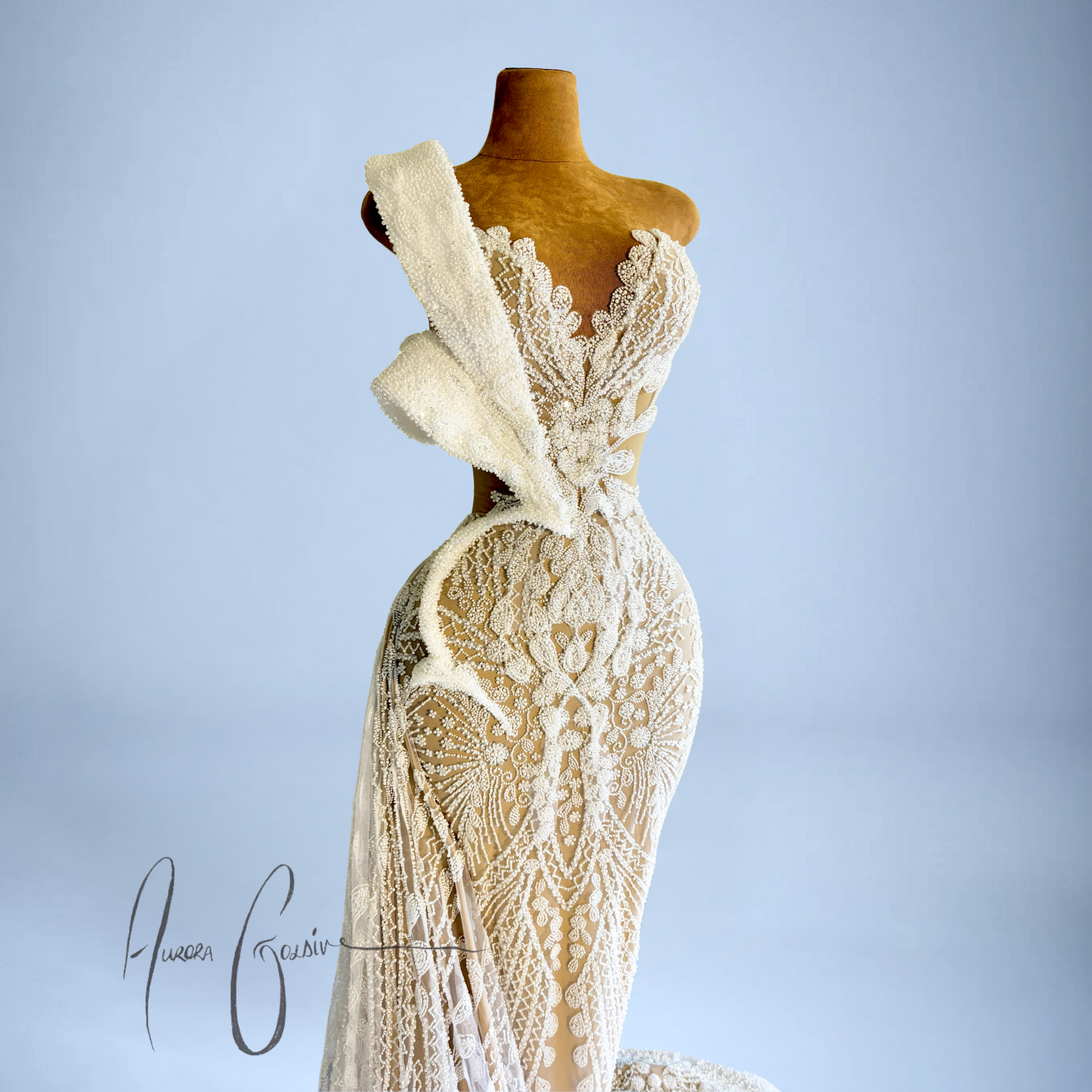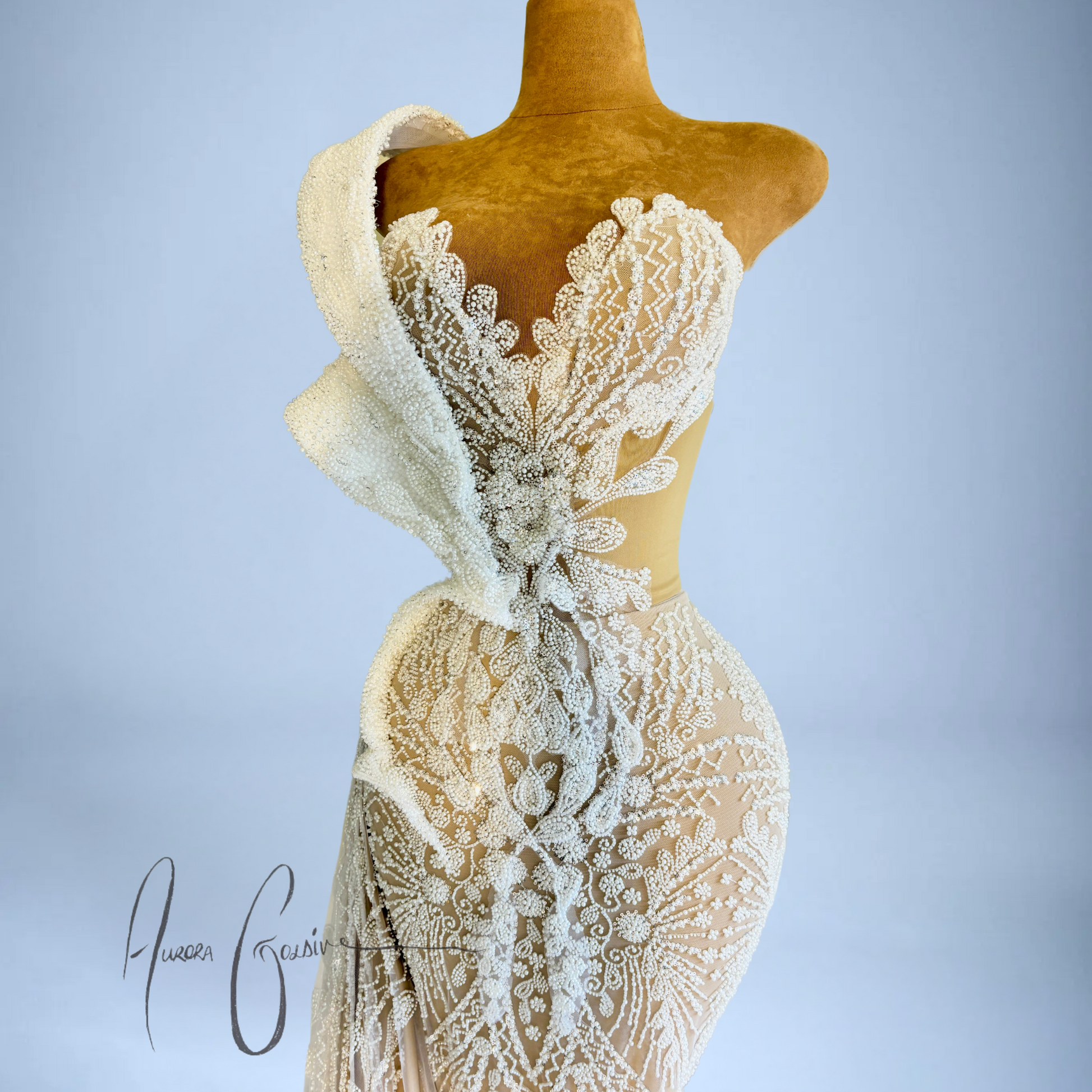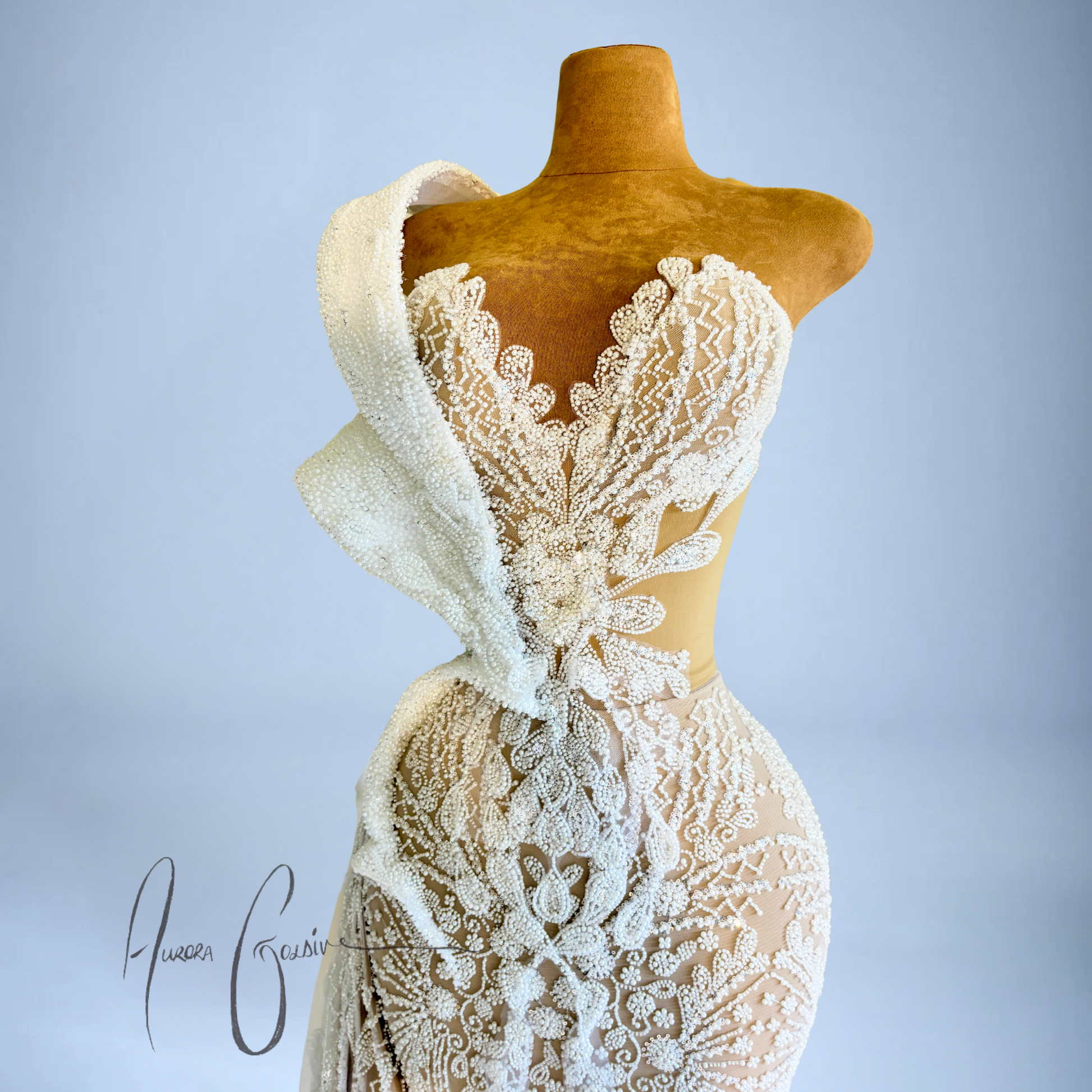The most magical wedding dress you’ll ever behold. Alanis captures the pure essence of the modern bride. Covered in pearls from head to toe, carefully beaded and crafted with an hour glass silhouette in mind. With a touch of modern flair this beauty is perfection in every way.