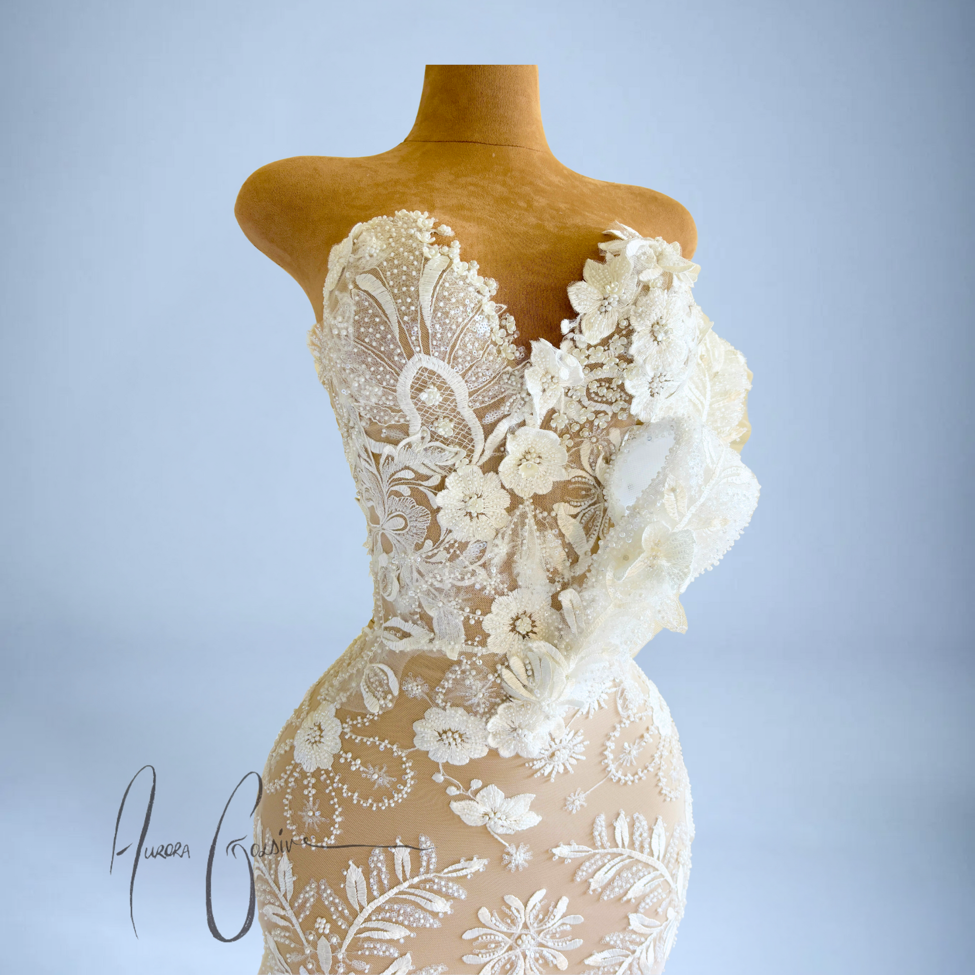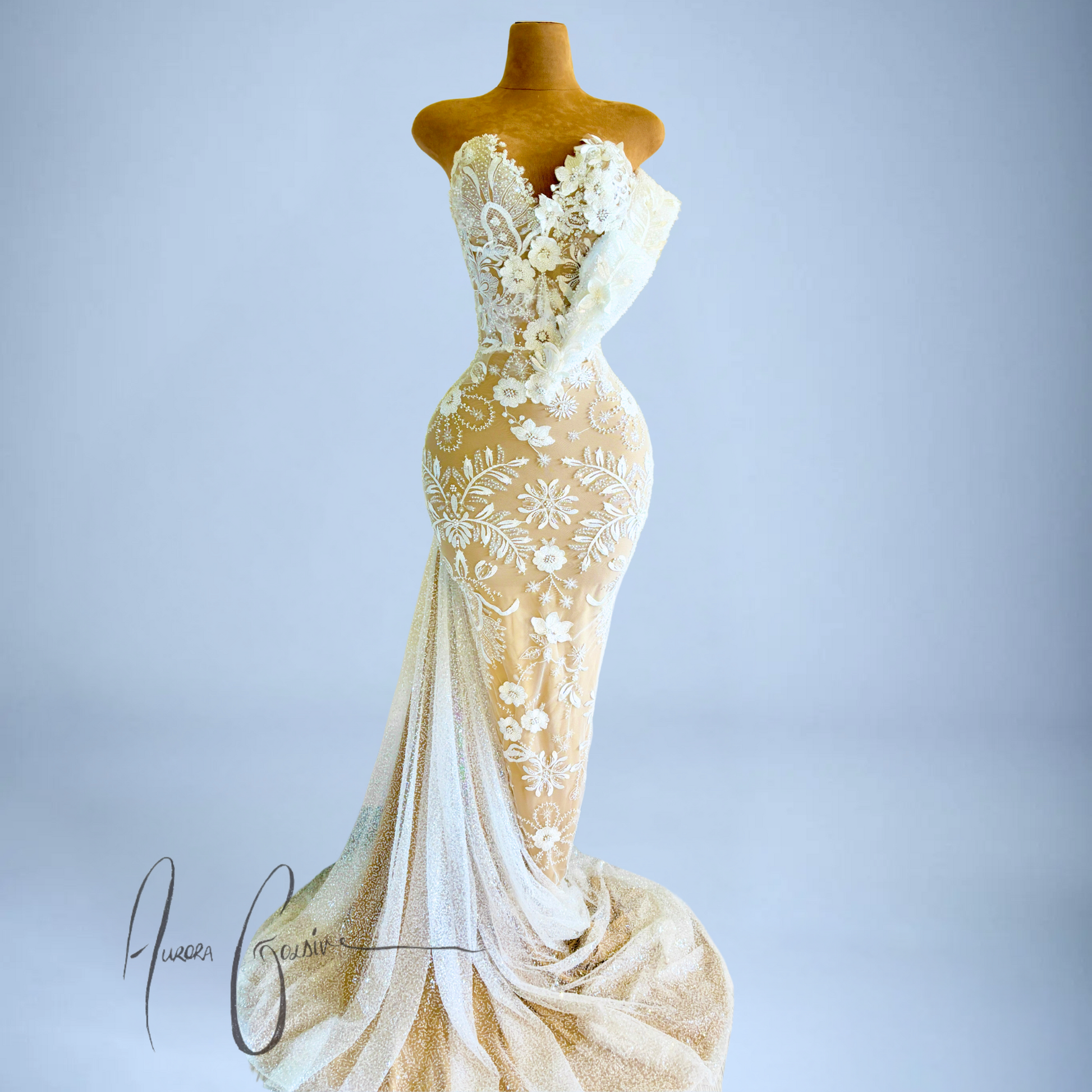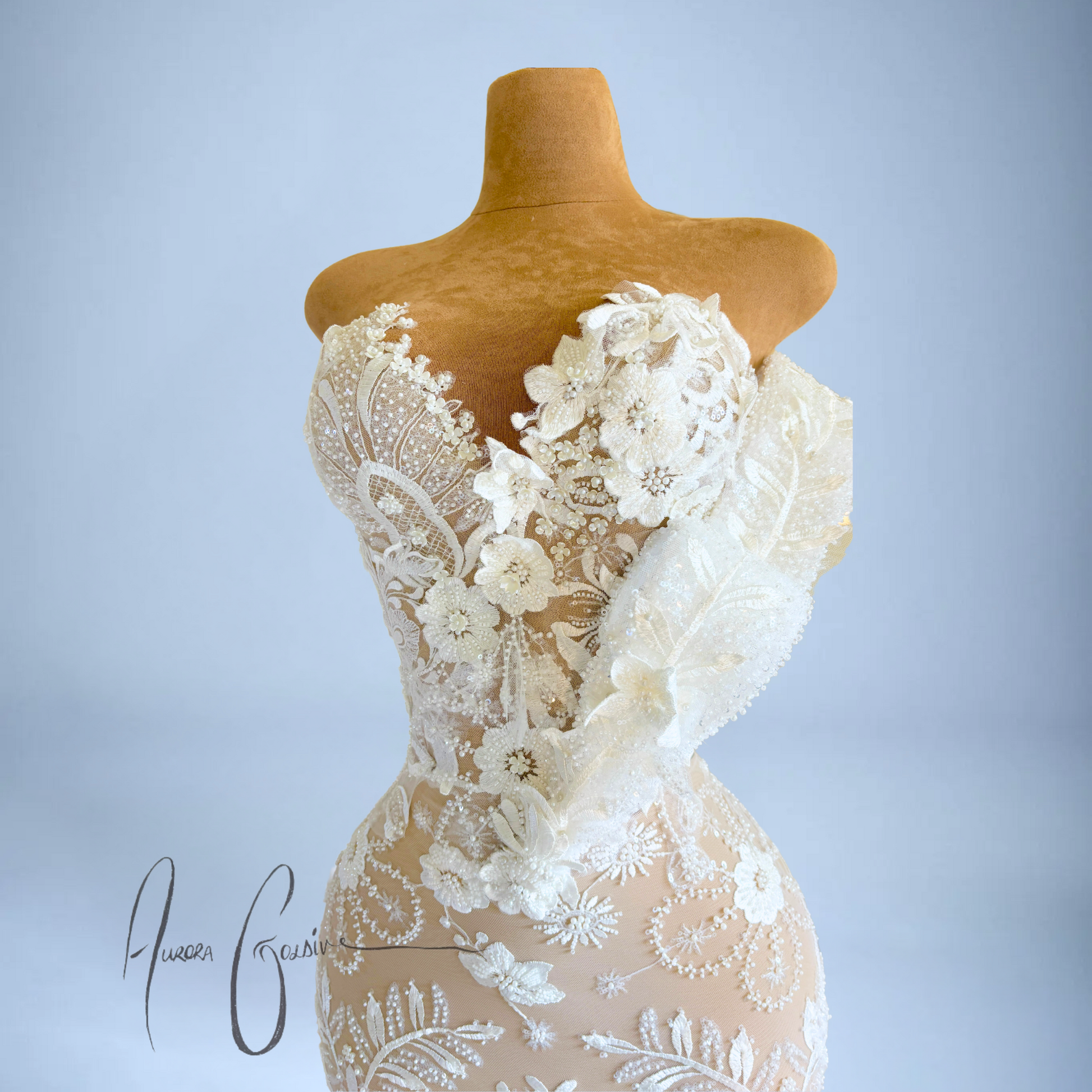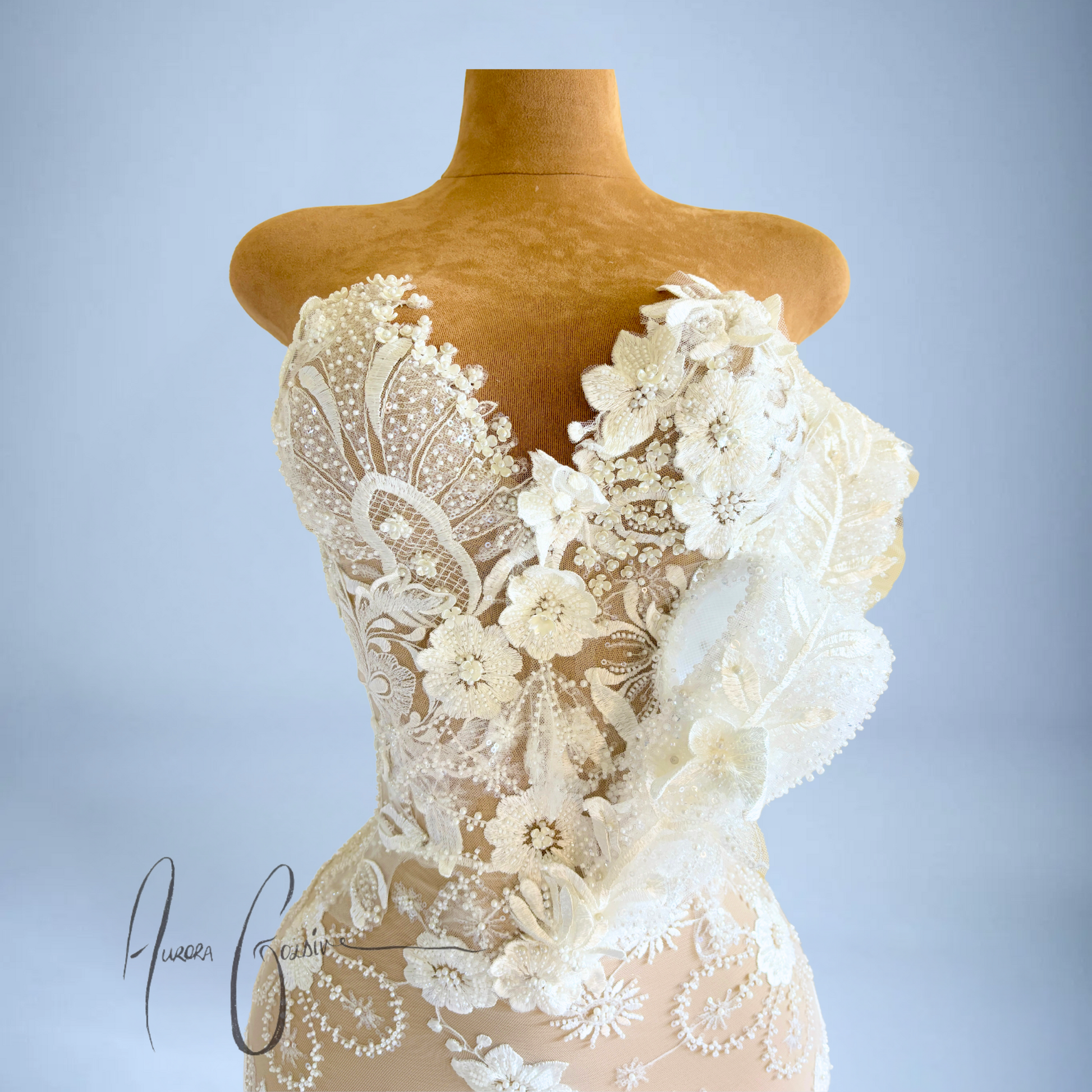 Materials: Skin Tone Mesh, Embroidered Lace, Satin, Pearls, Gems, Sequins