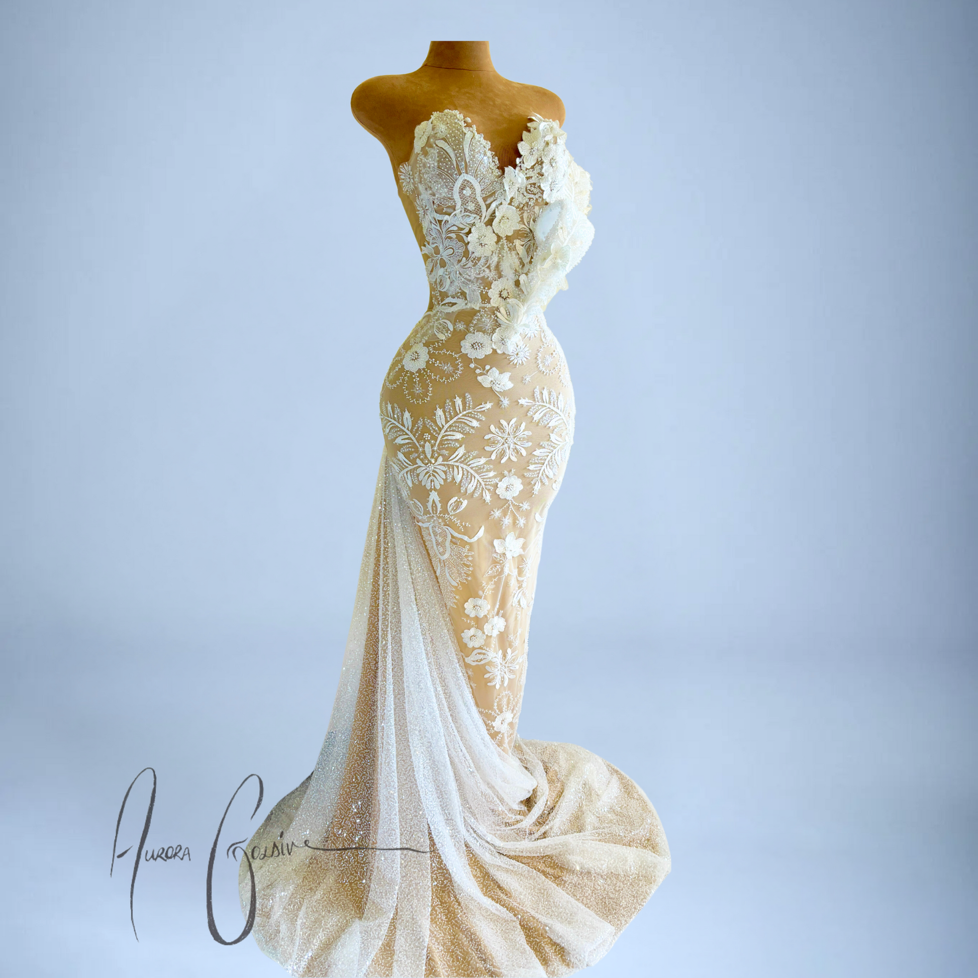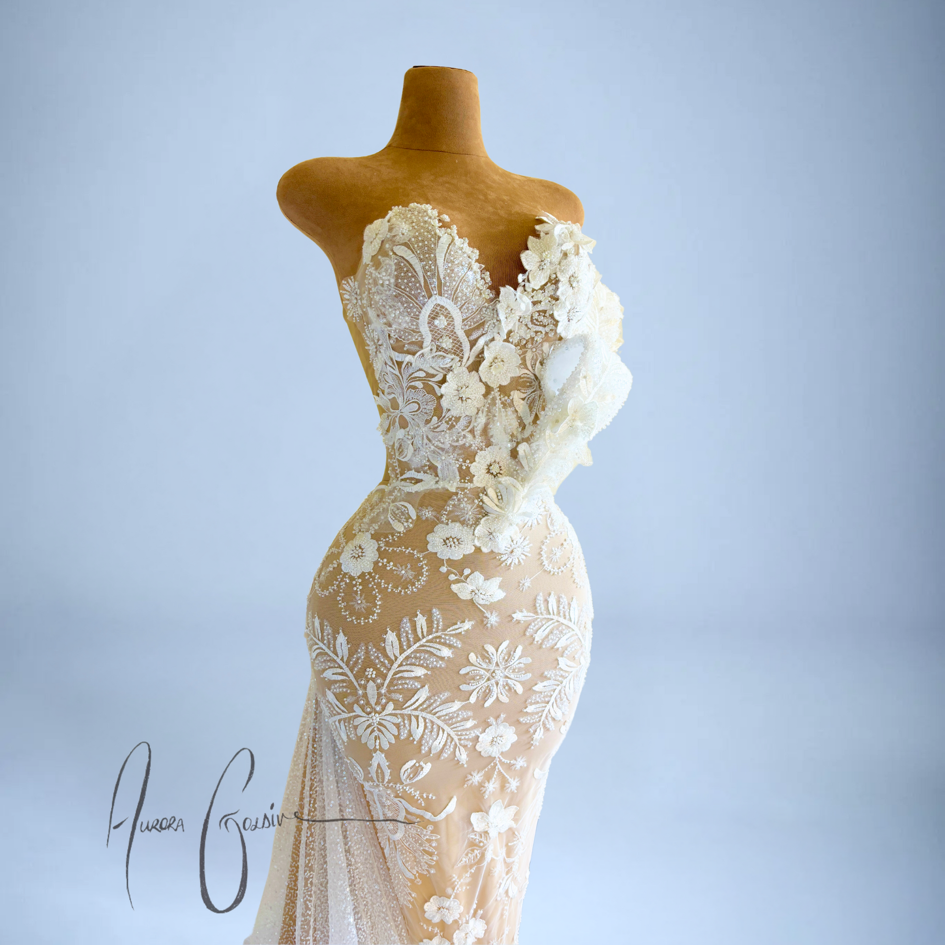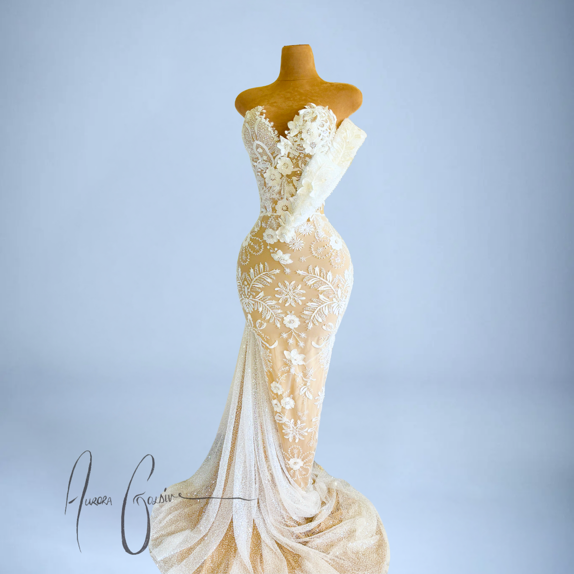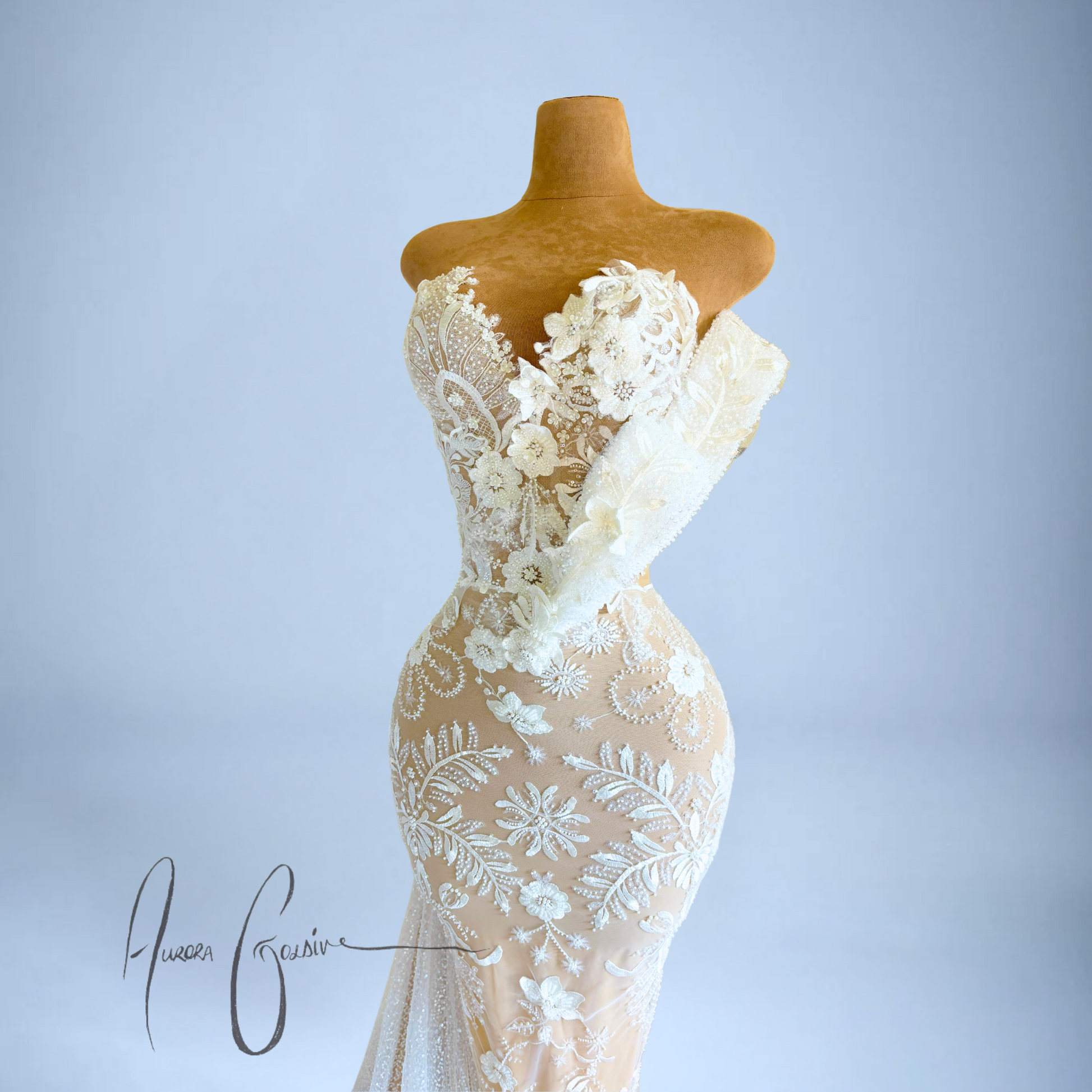 Materials: Skin Tone Mesh, Embroidered Lace, Satin, Pearls, Gems, Sequins