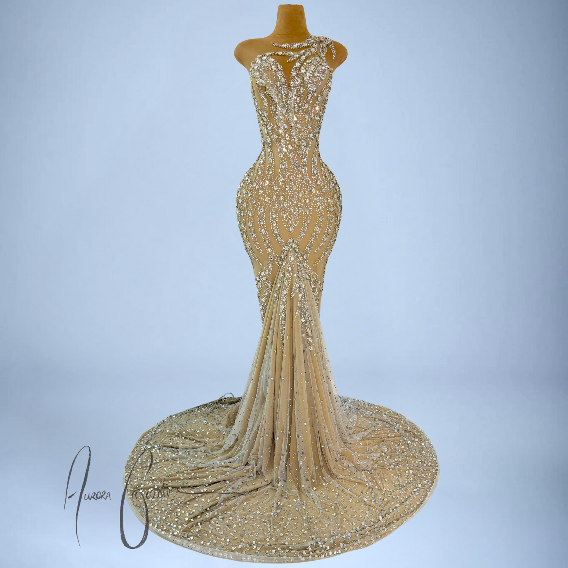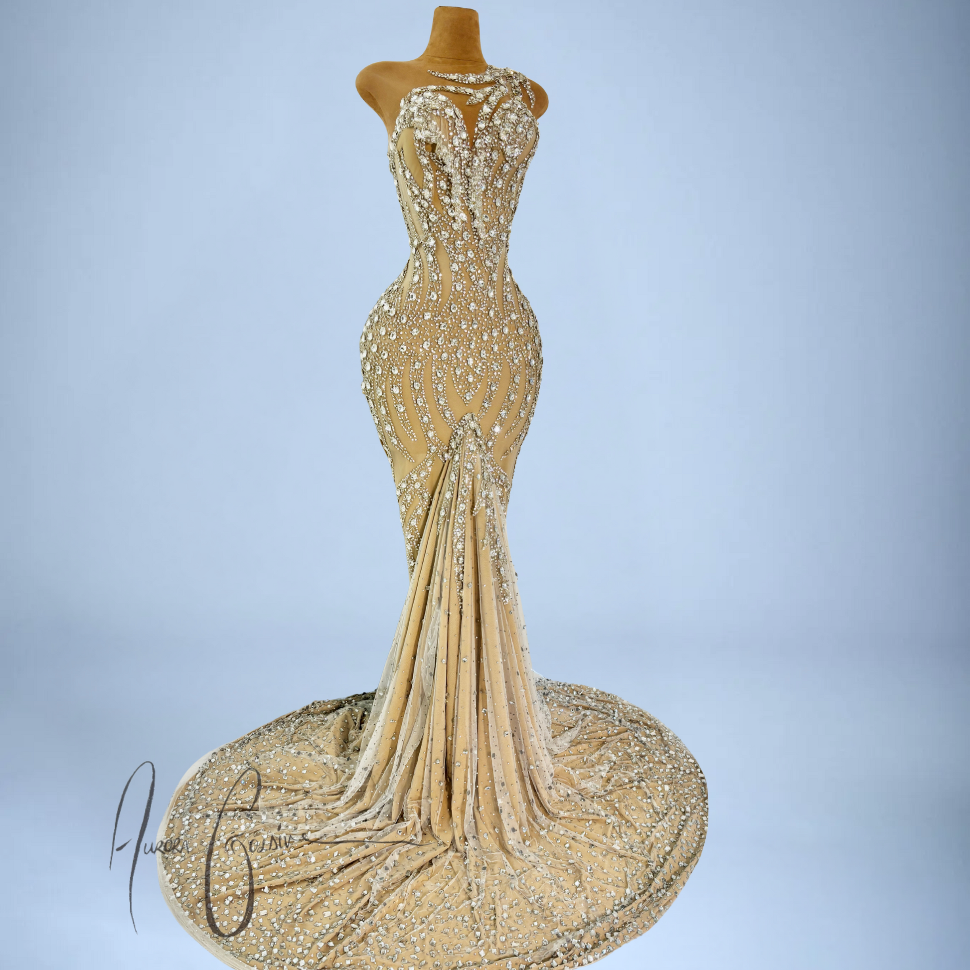 An exquisite fusion of elegance and sophistication, the China Rose Gown high-fashion allure with a soft, romantic twist. Designed for the modern bride, this masterpiece features a classic mermaid silhouette, hugging every curve before flowing into a graceful train adorned with shimmering brilliance.