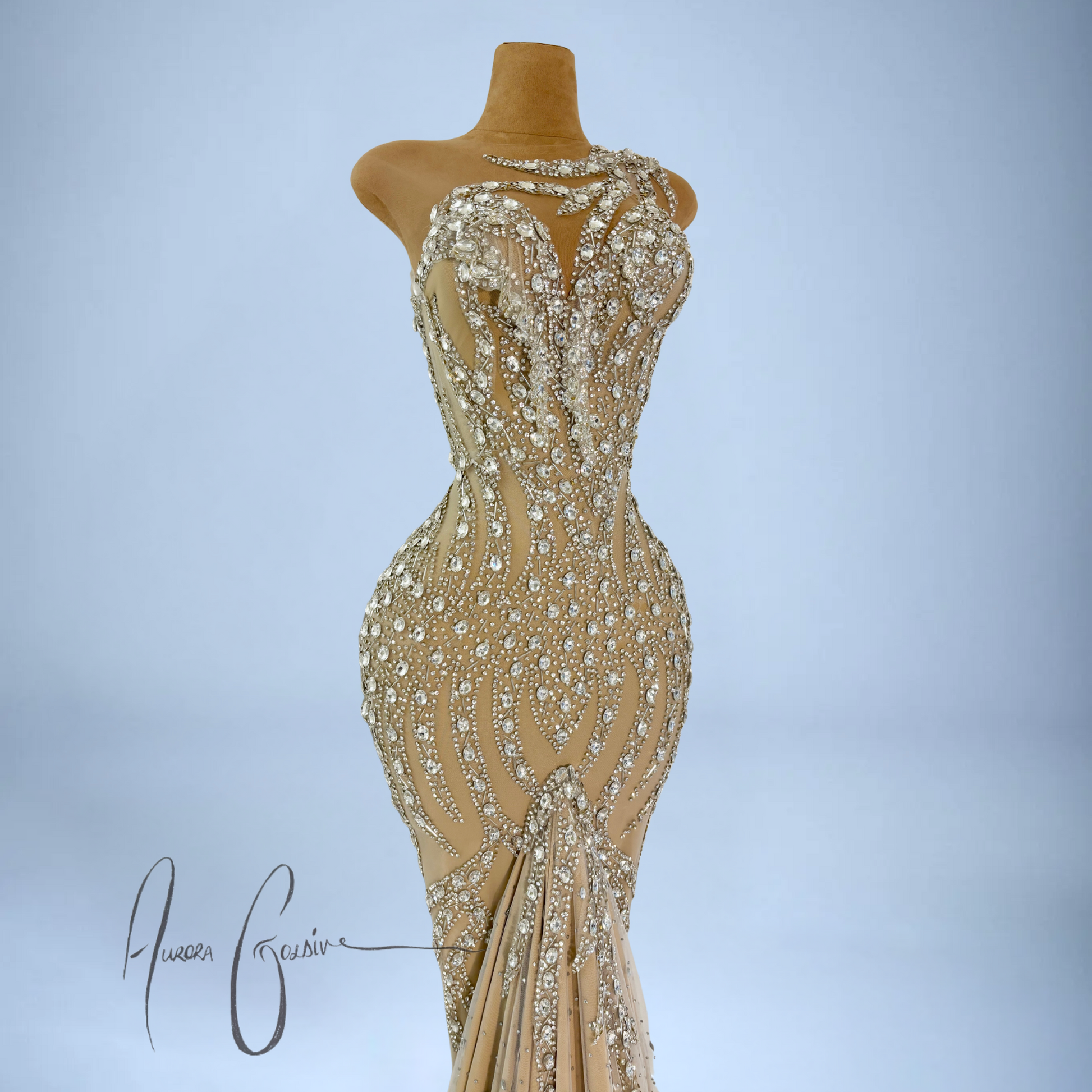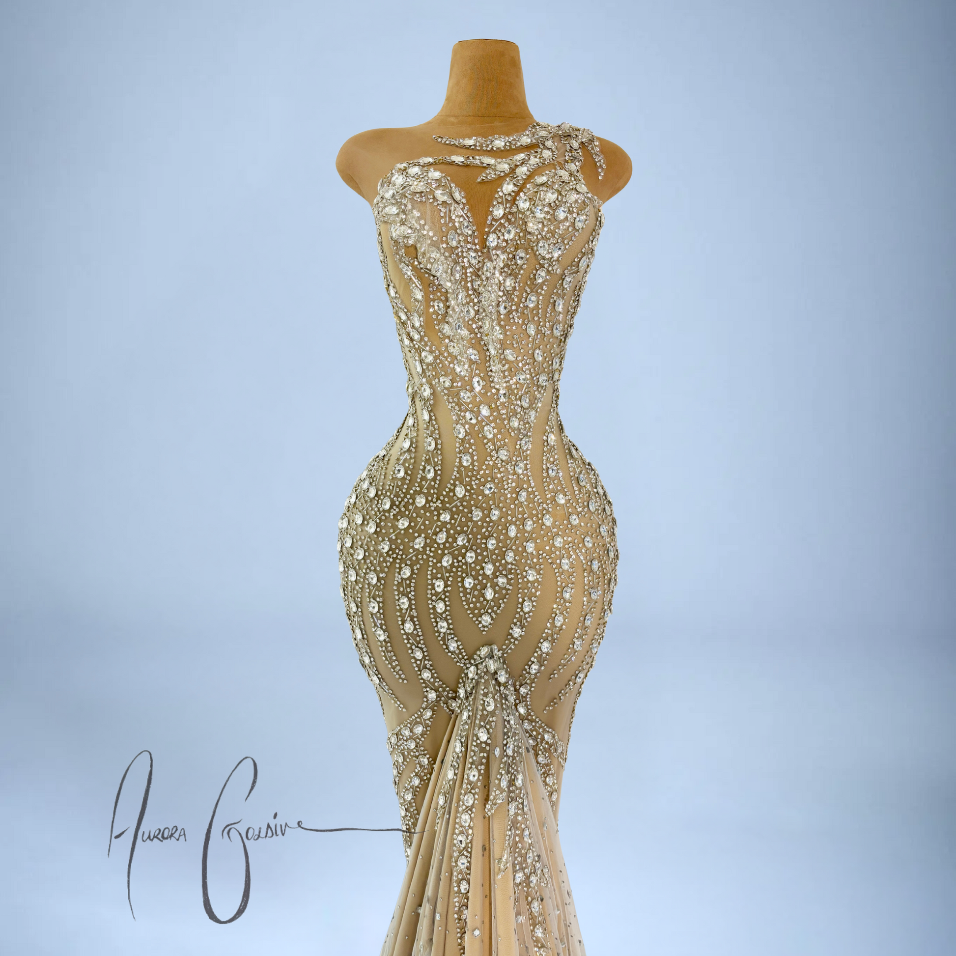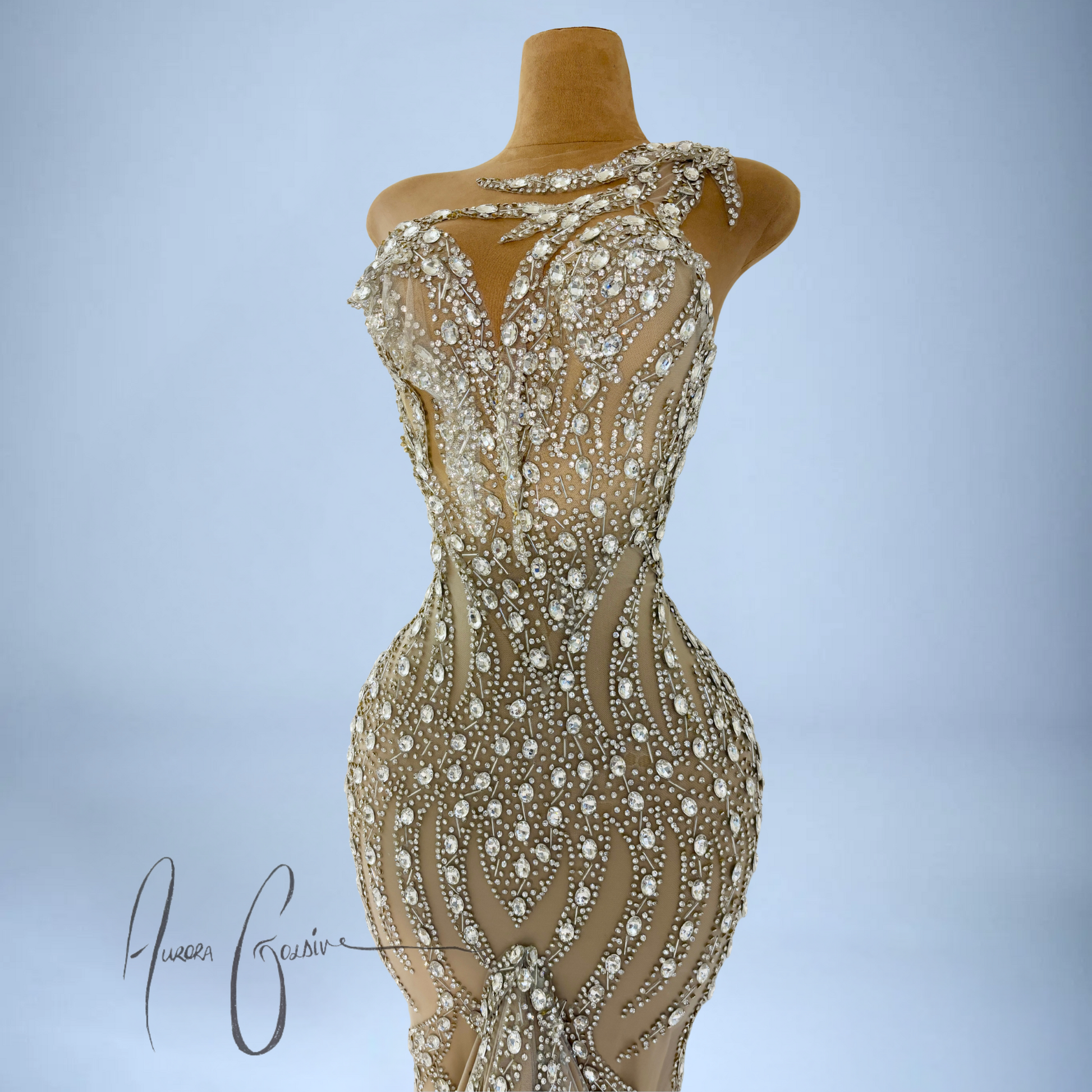Crafted from luxurious fabrics, the gown is hand-decorated with silver gemstones that create a fusion of patterns. A sculpted bodice with a unique asymmetrical neckline adds dimension and couture flair, while the intricate bead placement elongates the figure and sparkles from every angle.