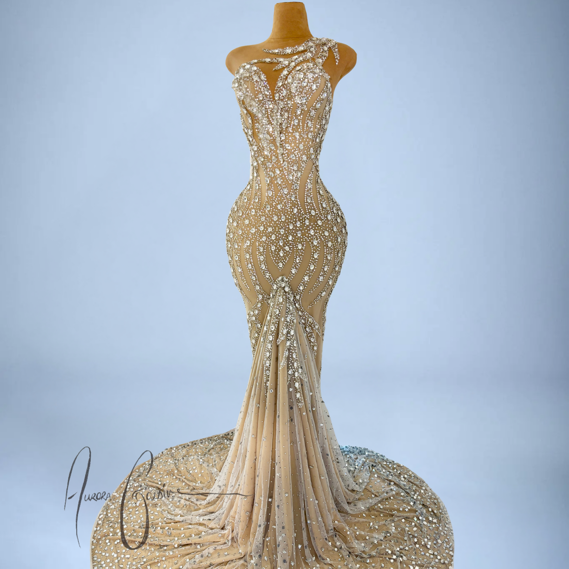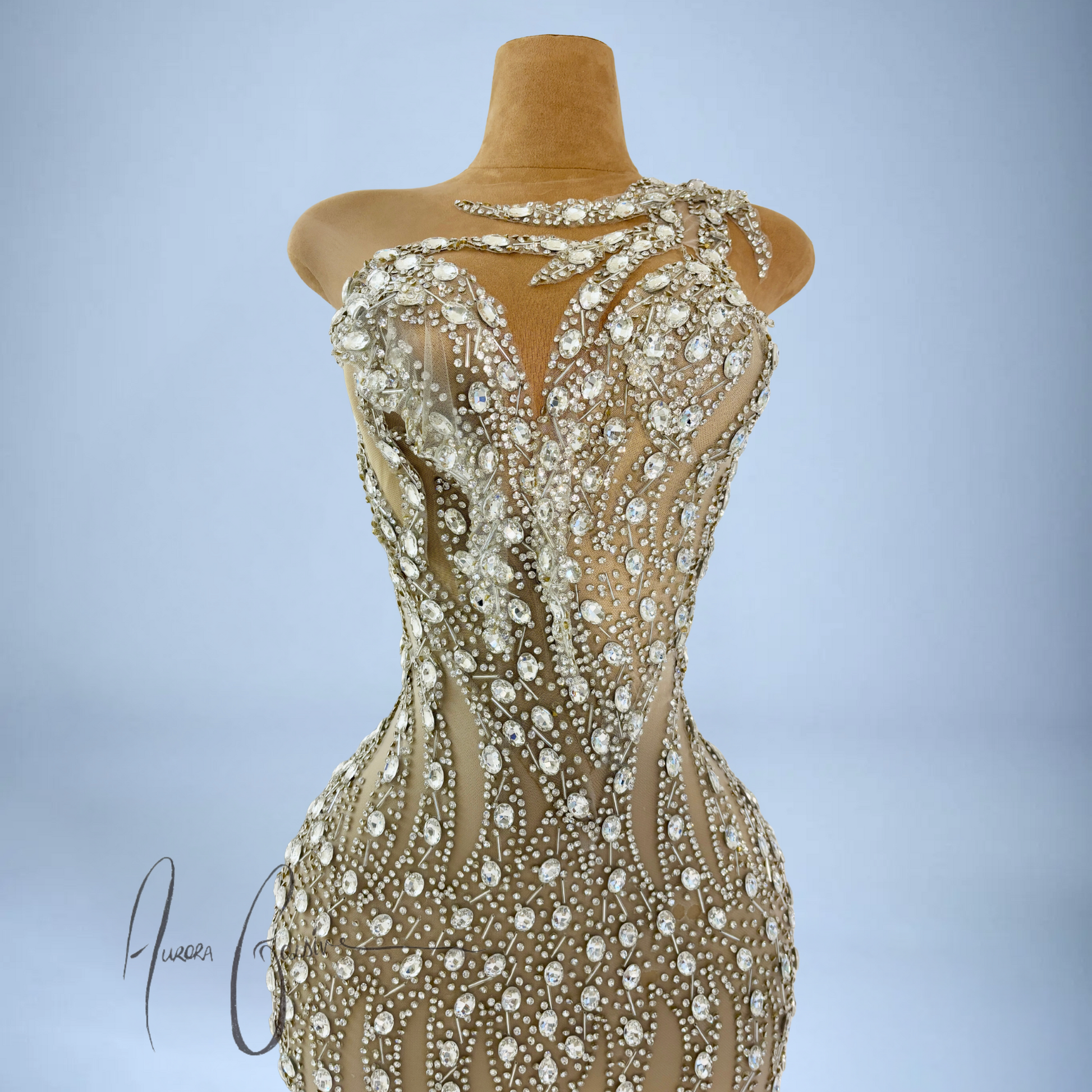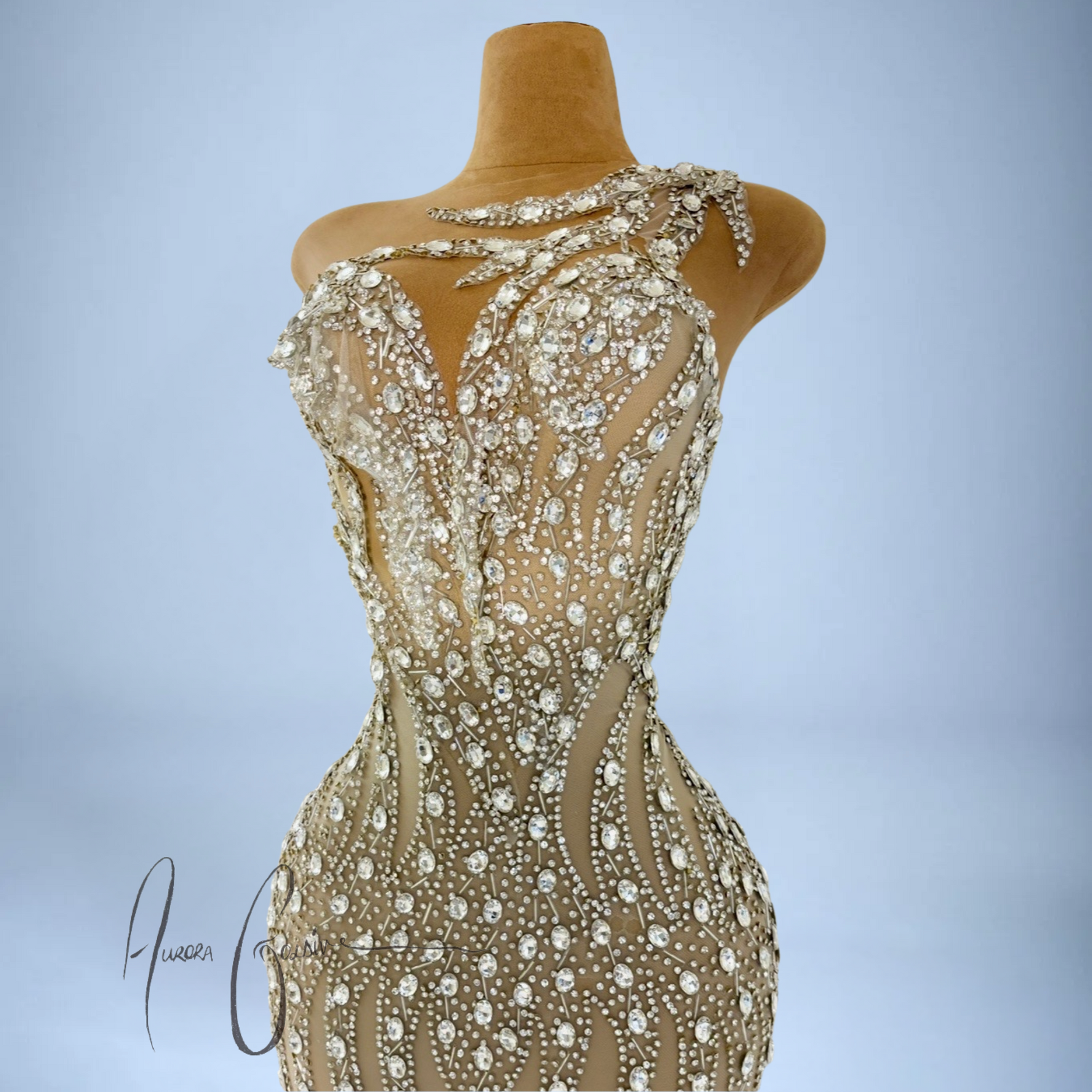 Crafted from luxurious fabrics, the gown is hand-decorated with silver gemstones that create a fusion of patterns. A sculpted bodice with a unique asymmetrical neckline adds dimension and couture flair, while the intricate bead placement elongates the figure and sparkles from every angle.