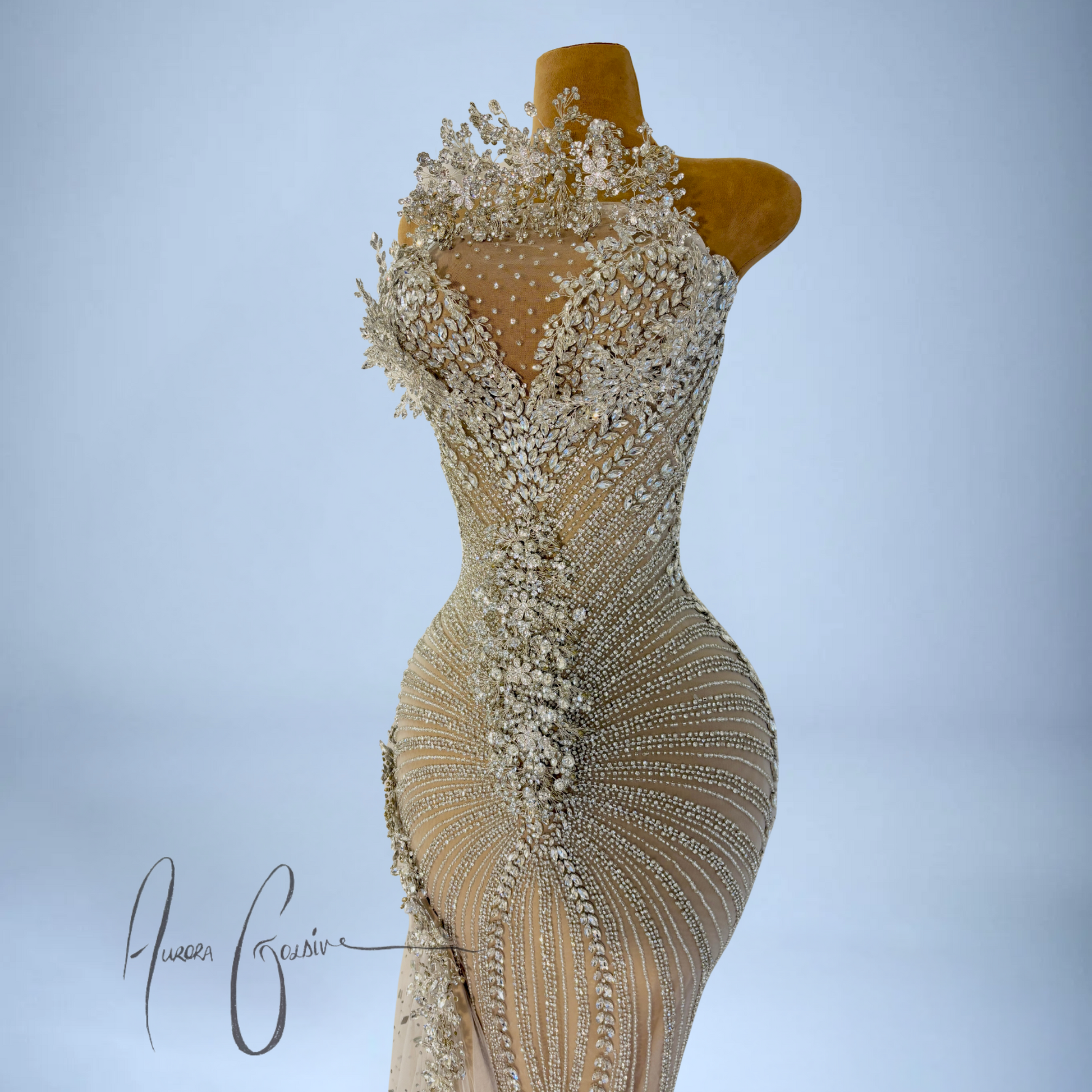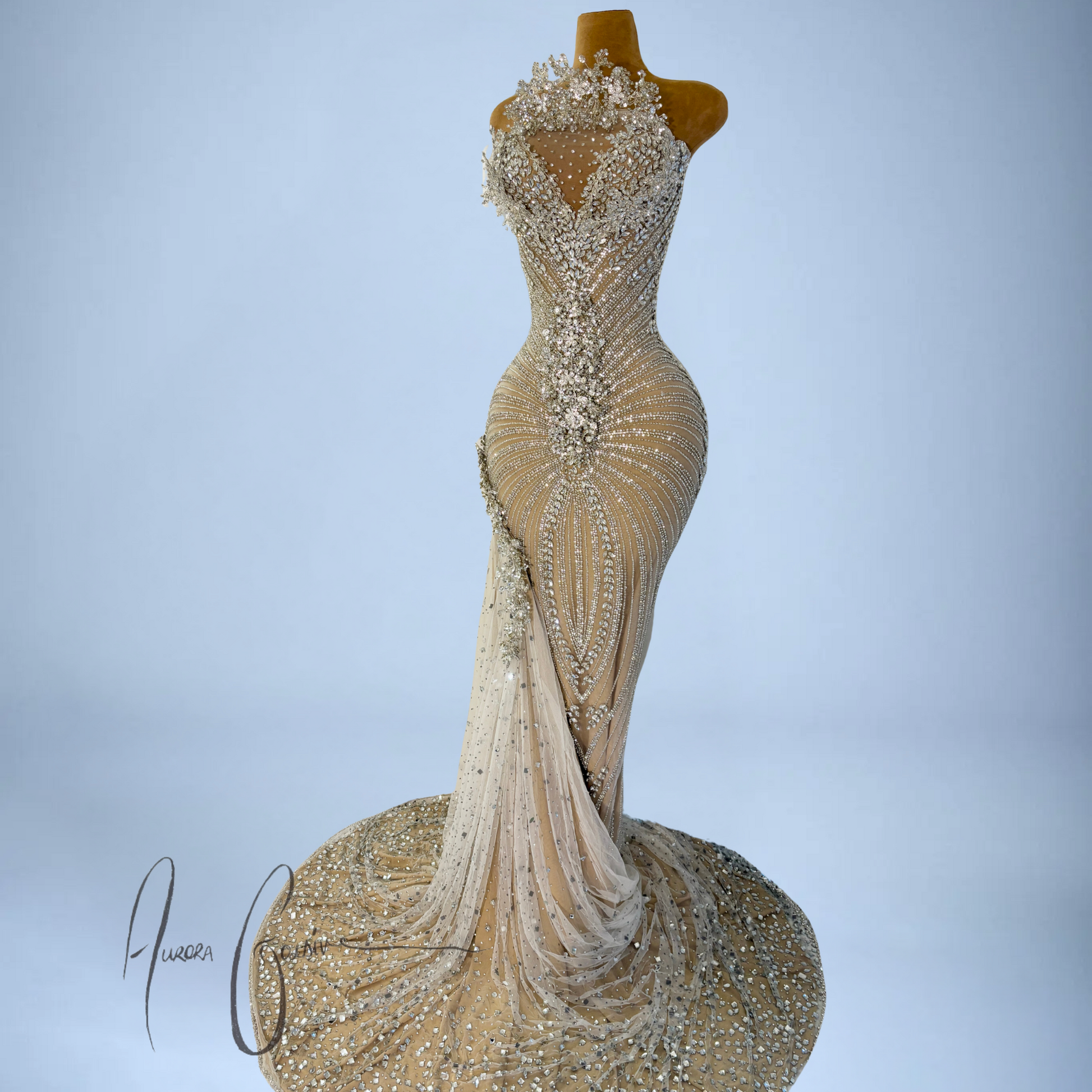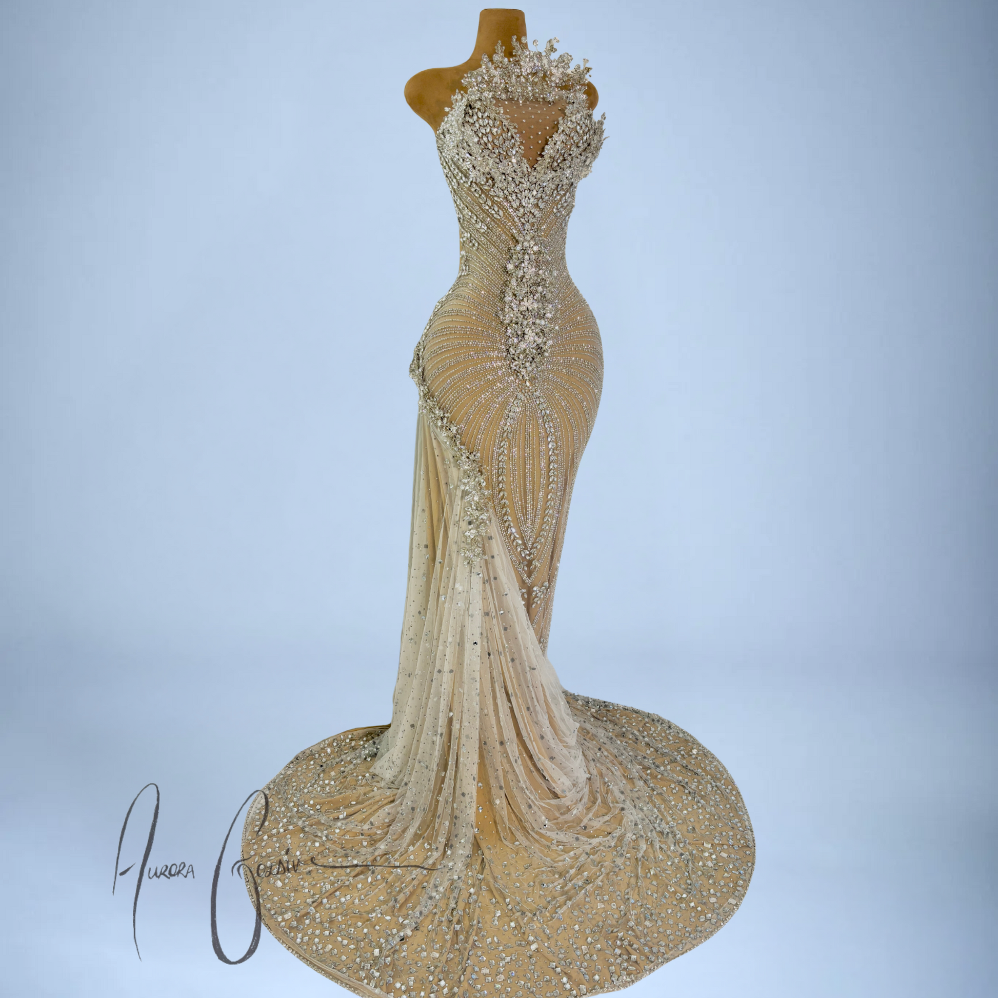 Richly sculpted and exquisitely adorned, the Courtney Gown is a celebration of opulence, femininity, and couture craftsmanship. Designed with a striking hourglass mermaid silhouette, it perfectly contours the body before flaring into a sparkling train that cascades to the floor with graceful elegance.