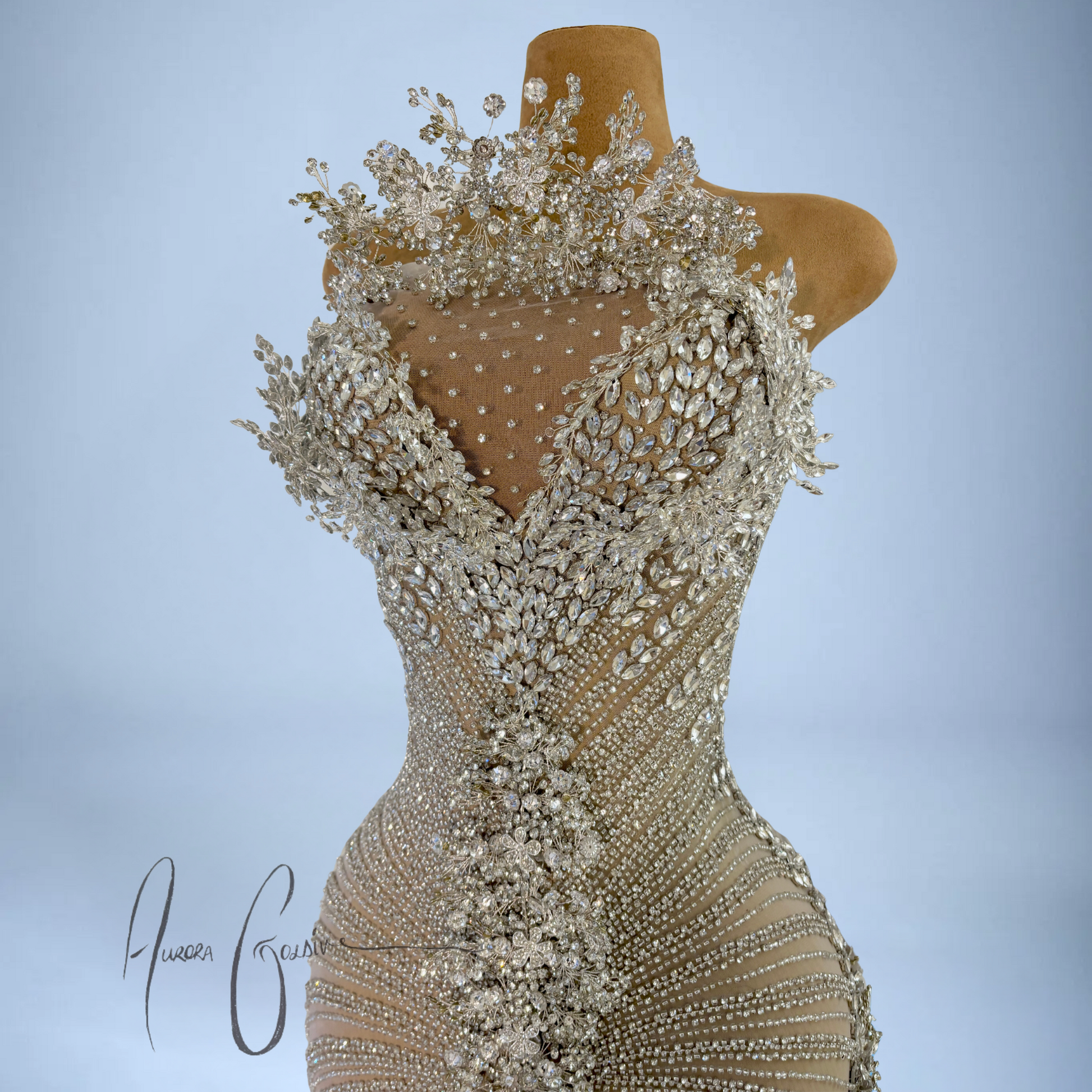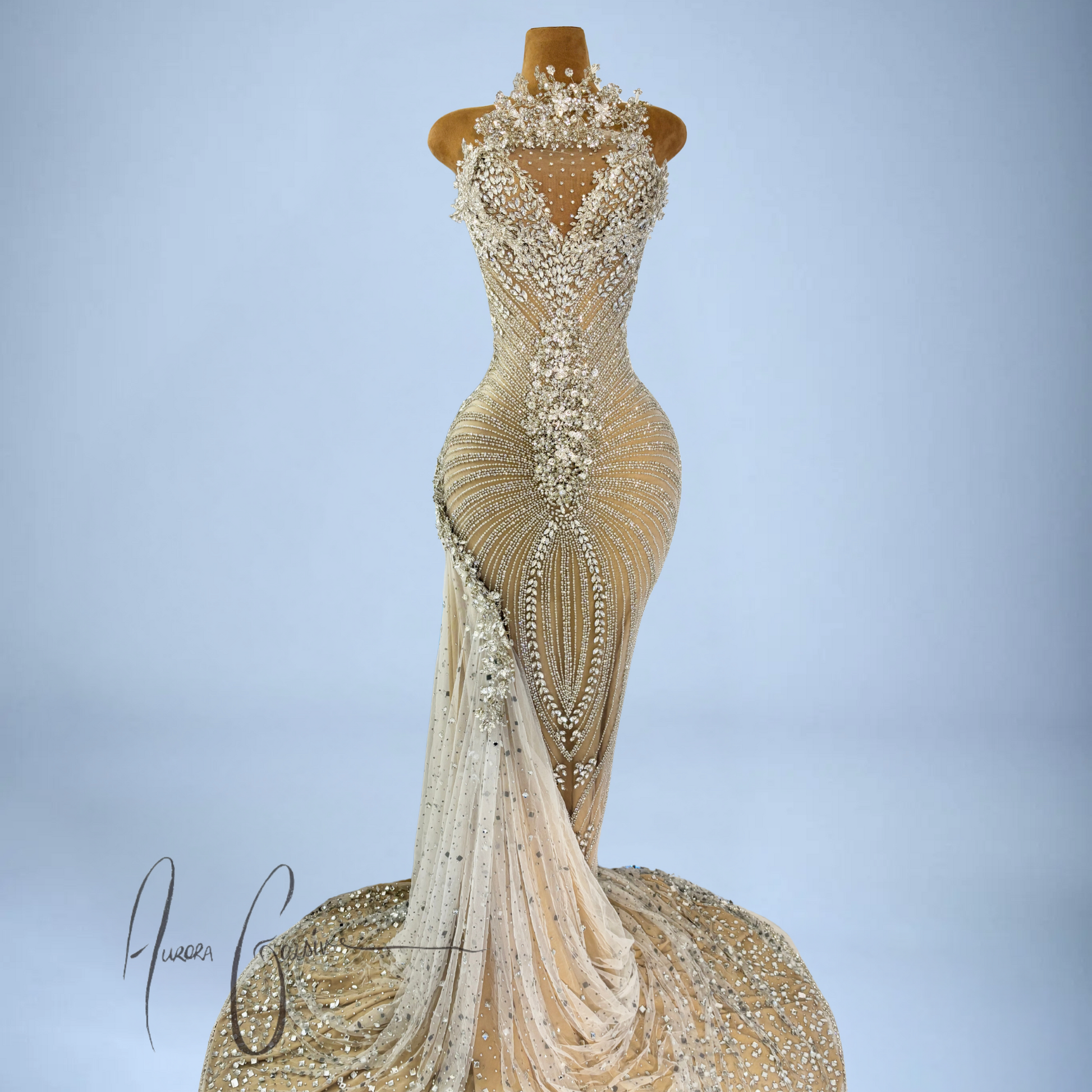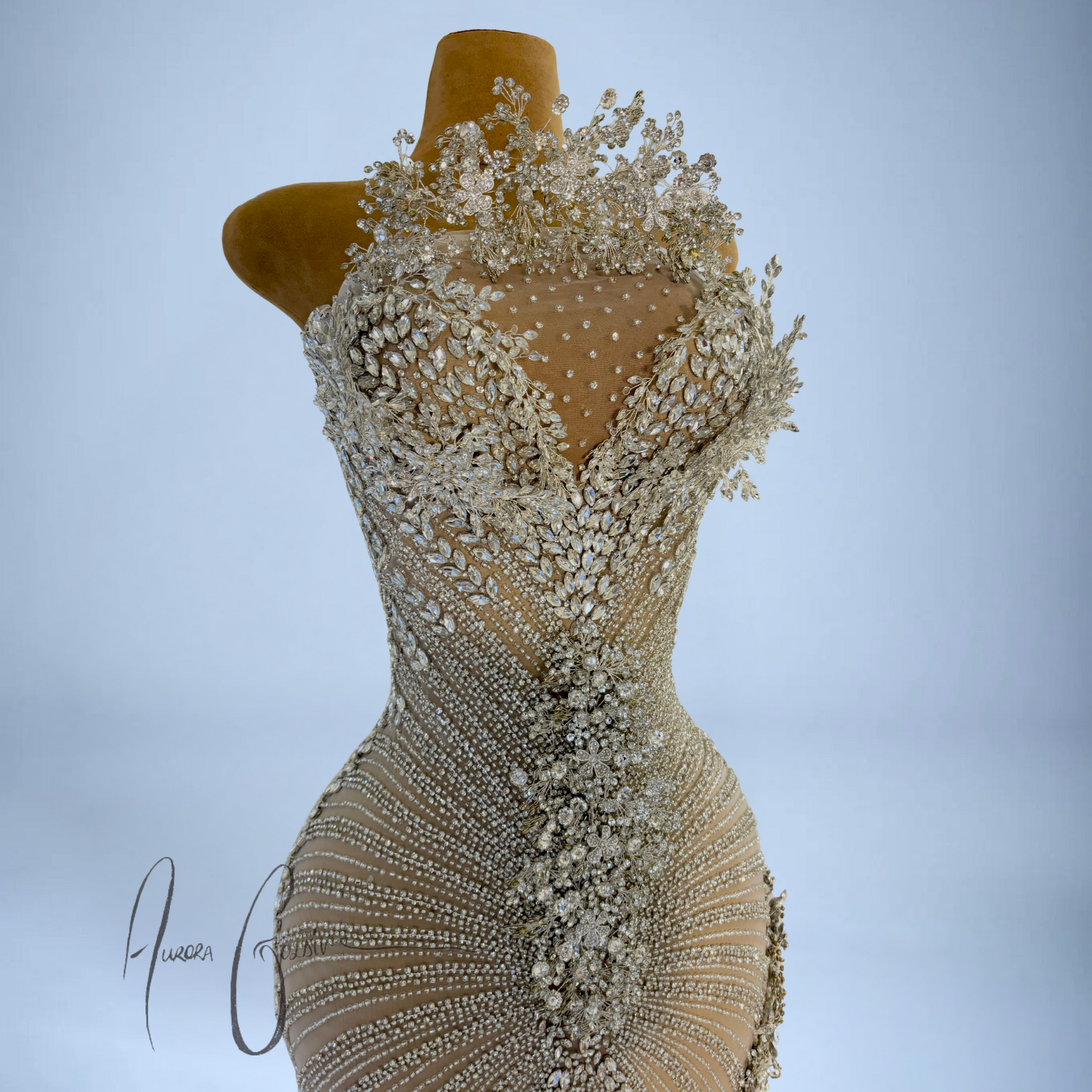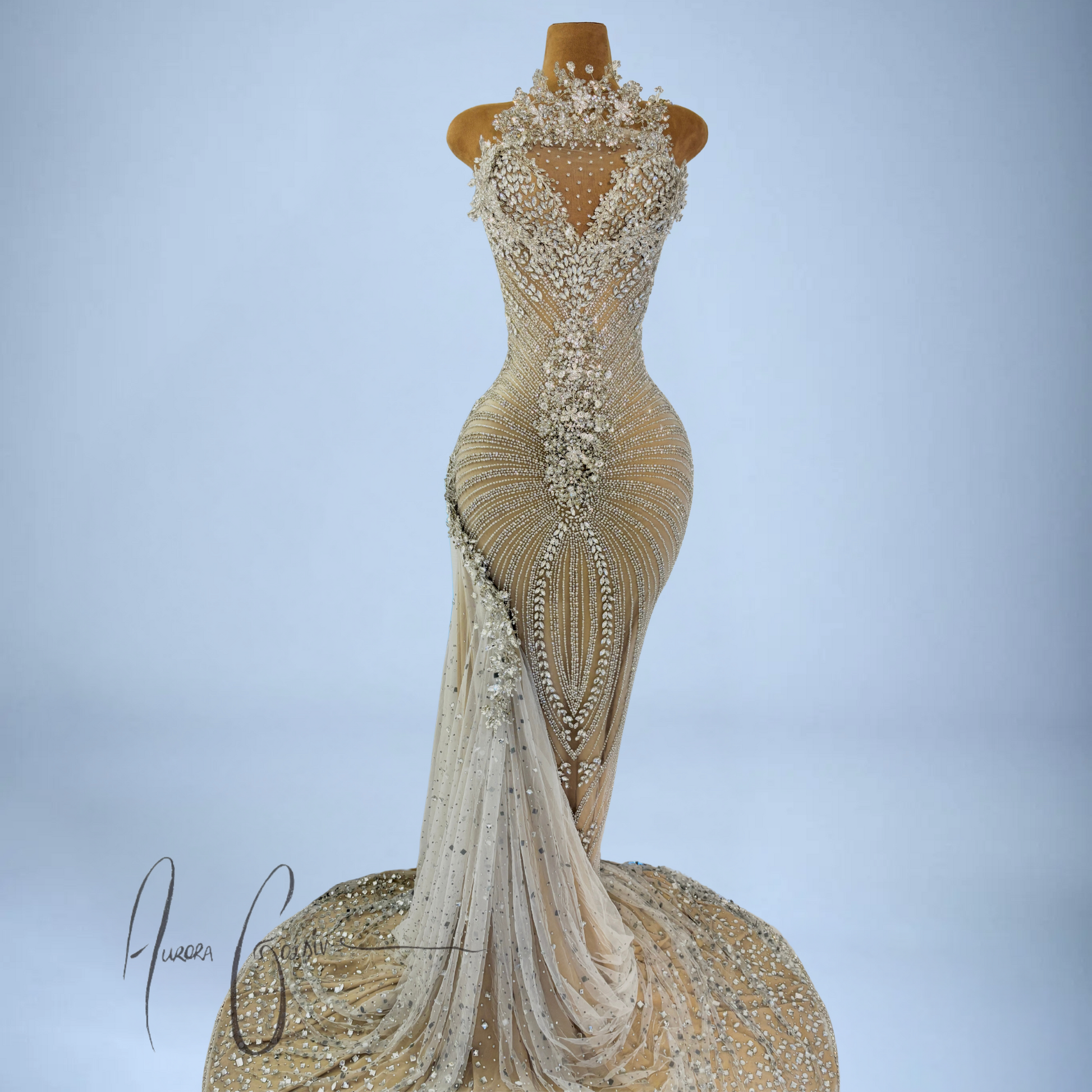Richly sculpted and exquisitely adorned, the Courtney Gown is a celebration of opulence, femininity, and couture craftsmanship. Designed with a striking hourglass mermaid silhouette, it perfectly contours the body before flaring into a sparkling train that cascades to the floor with graceful elegance.