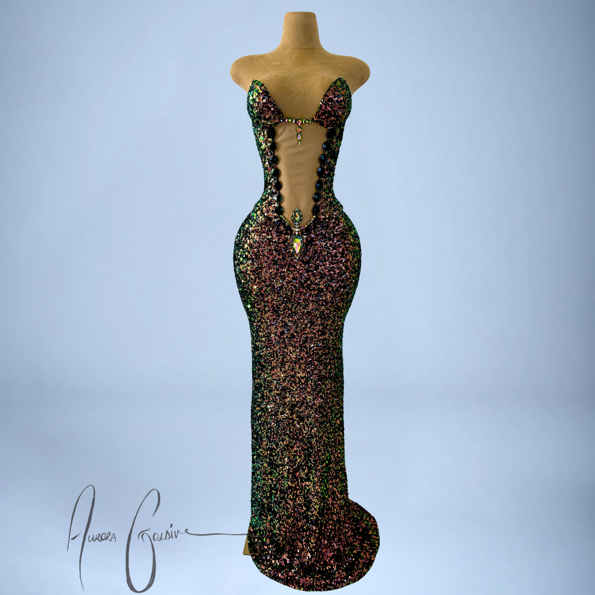 Step into the spotlight with the Elena Gown, a breathtaking masterpiece designed to capture attention and dazzle at any event. Crafted from luxurious reflective Spandex sequin, skin tone tulle, rhinestones, and intricate glass beadwork, this gown is a perfect blend of elegance and modern glamour. The multi-toned reflective sequins shimmer and change in the light, giving the gown an ethereal glow that makes it ideal for evening occasions.