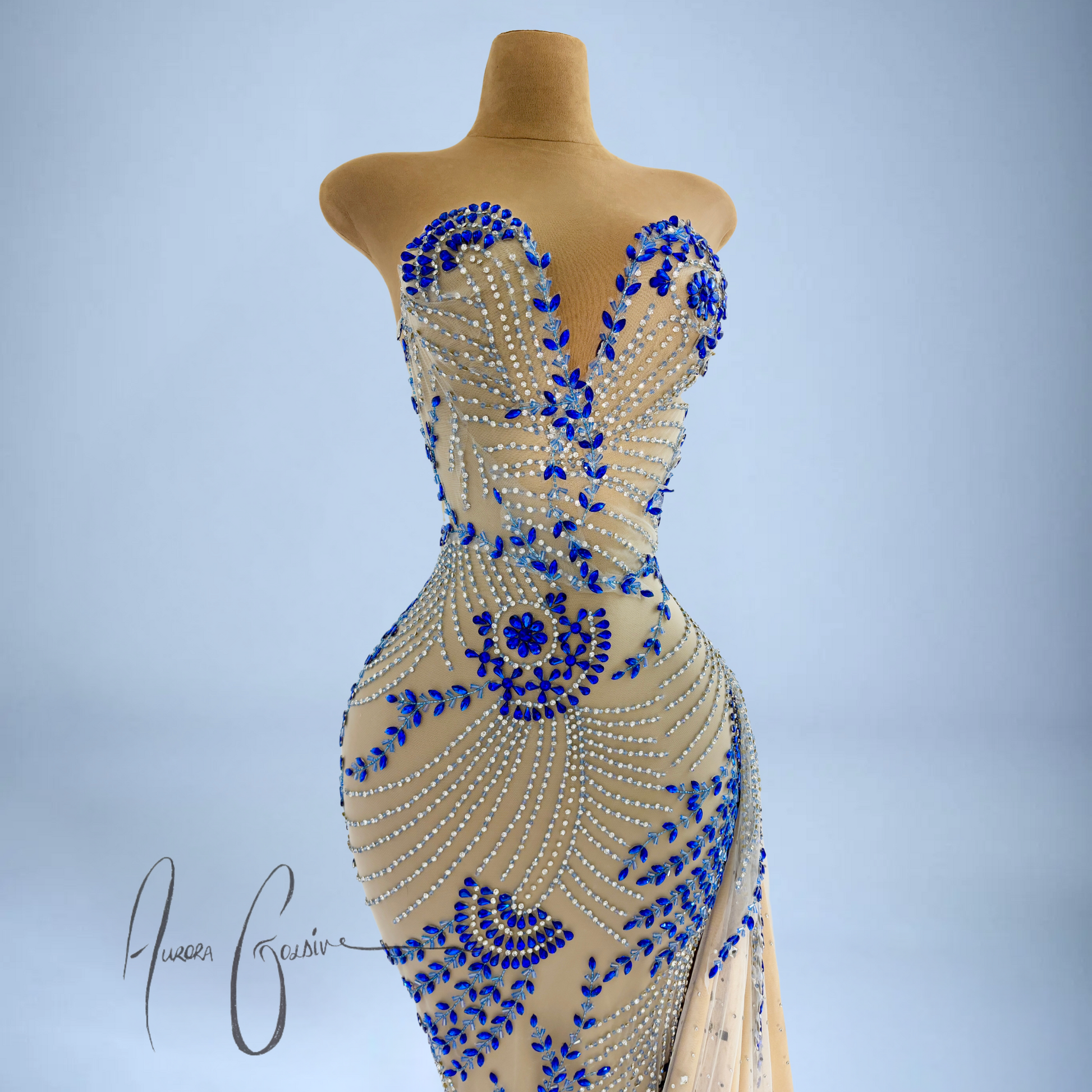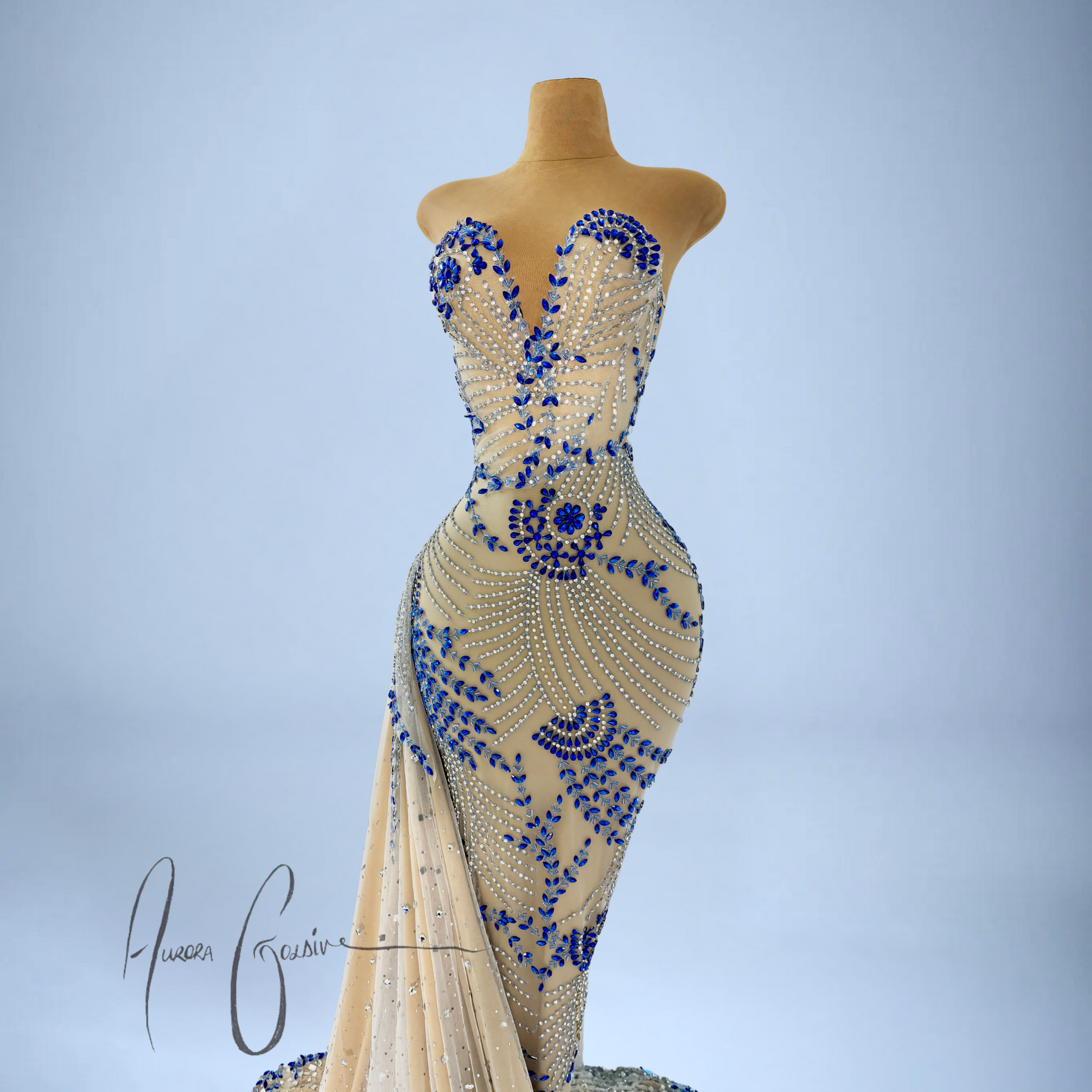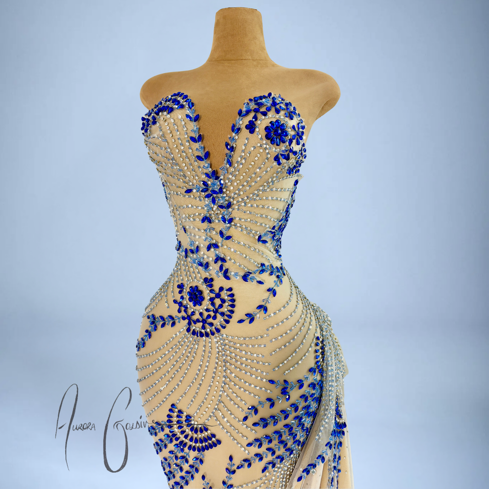 Elegance and sparkle meets regal design in this indescribable masterpiece . Designed to make an unforgettable impression, this mermaid silhouette stuns with its intricate royal blue and baby blue gemstone detailing, delicately layered over a soft power mesh base.