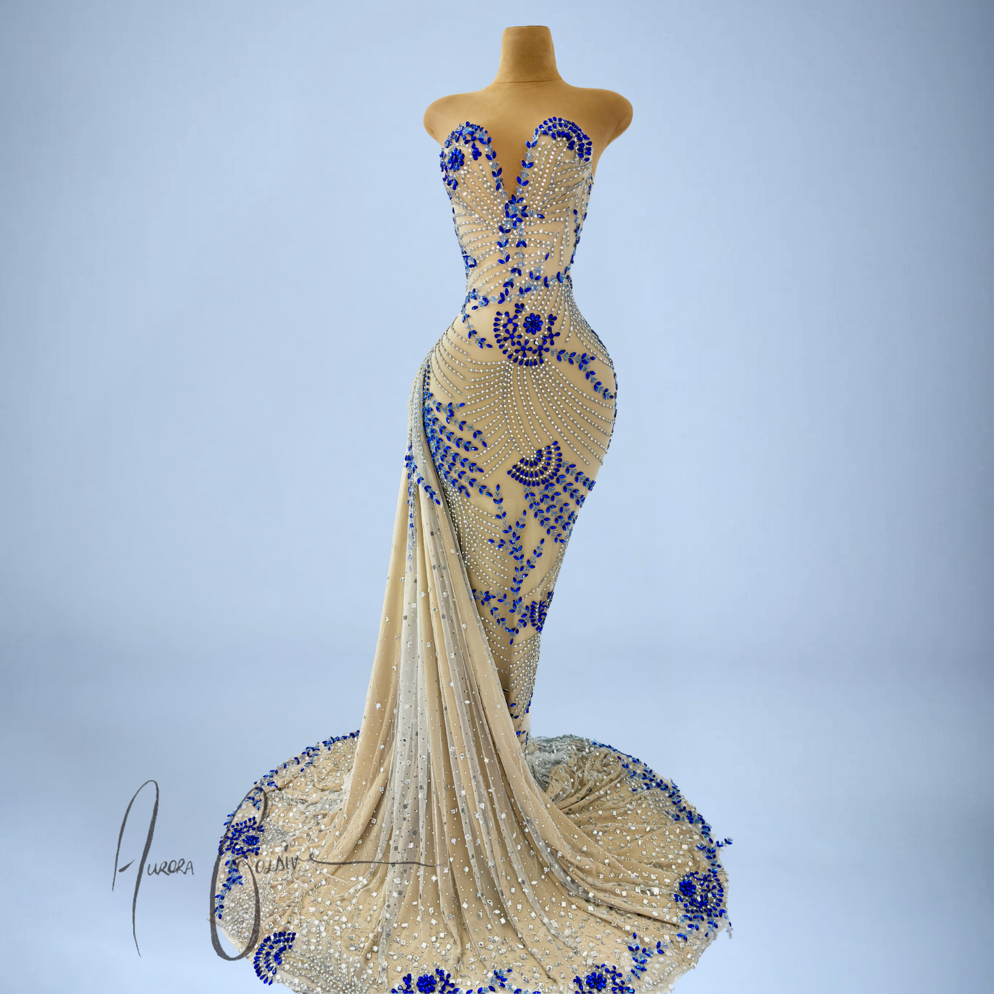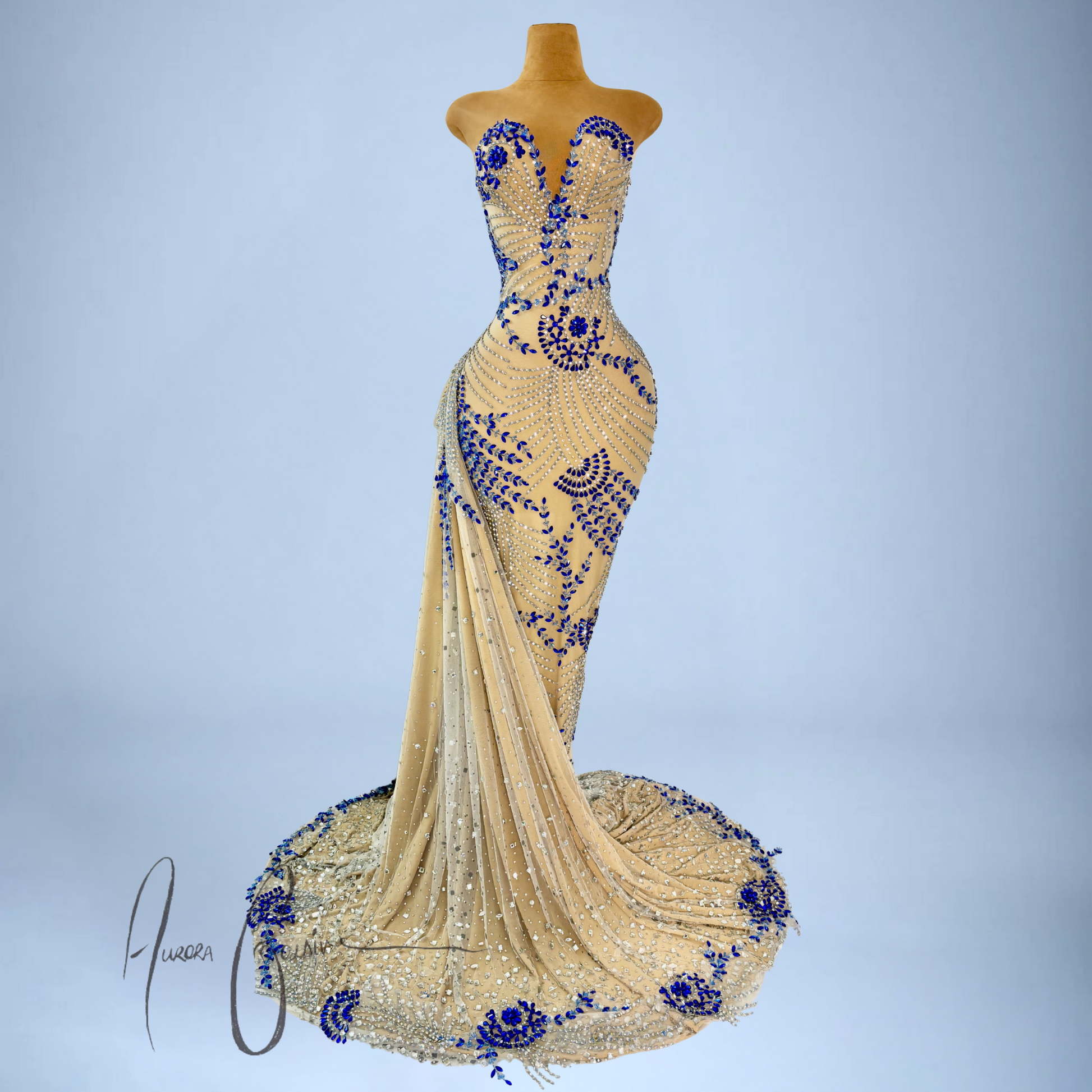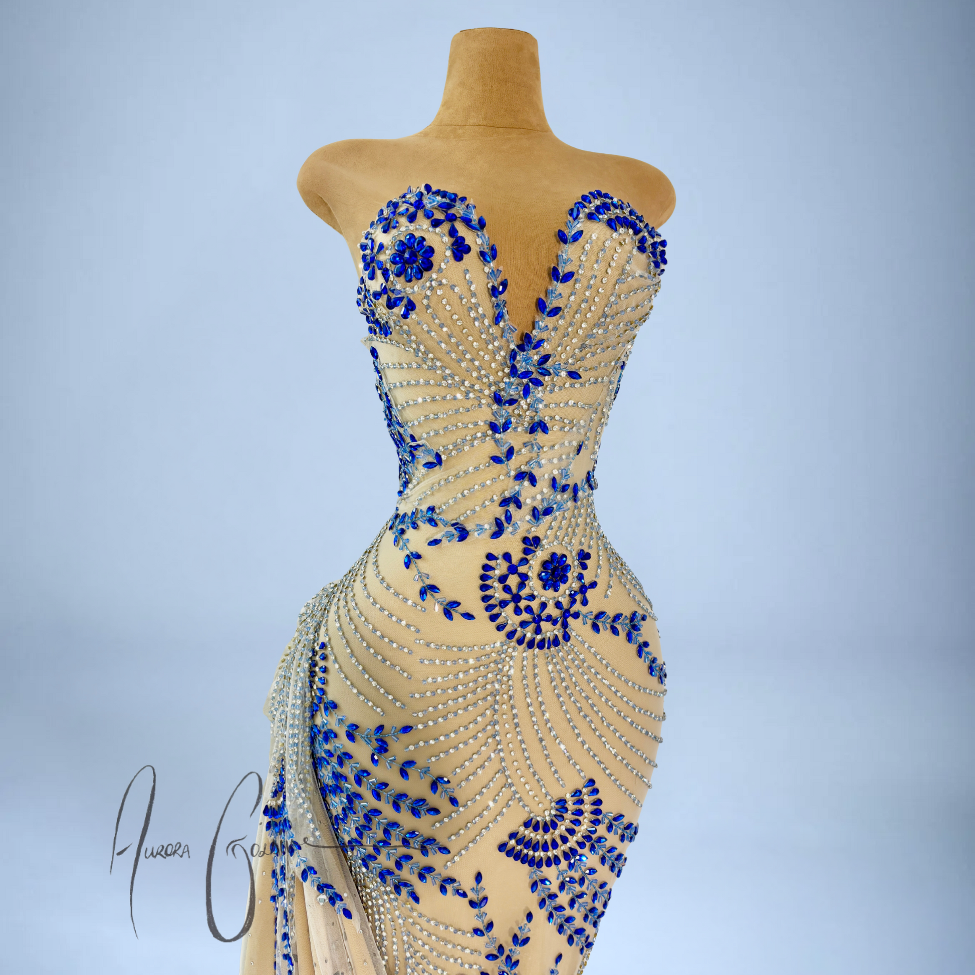 Elegance and sparkle meets regal design in this indescribable masterpiece . Designed to make an unforgettable impression, this mermaid silhouette stuns with its intricate royal blue and baby blue gemstone detailing, delicately layered over a soft power mesh base.