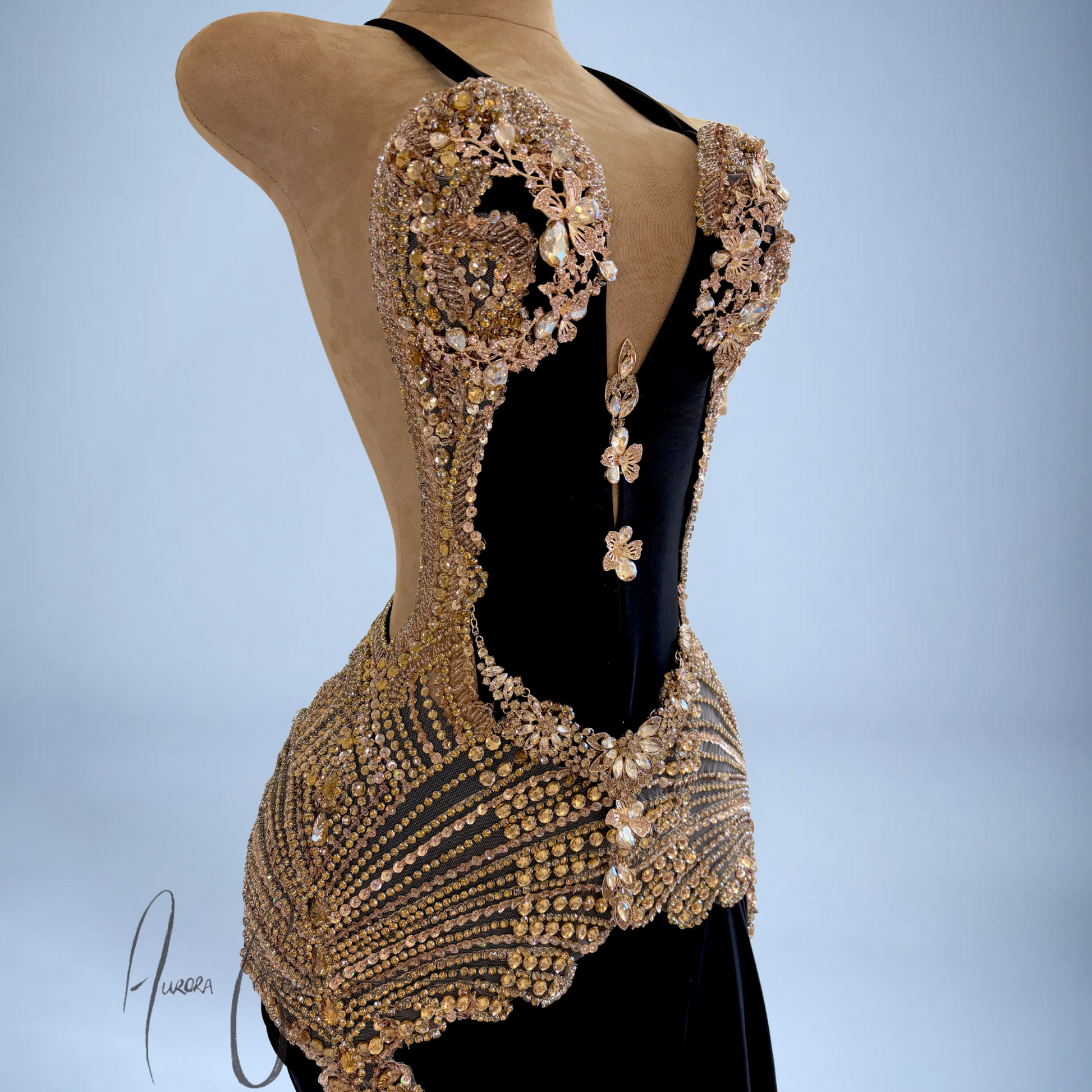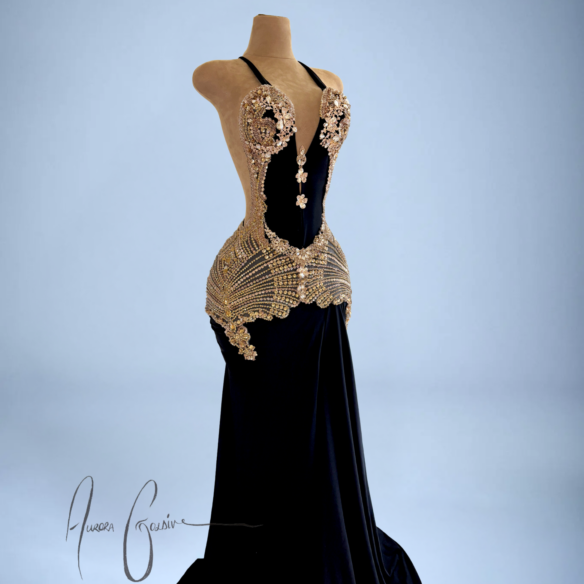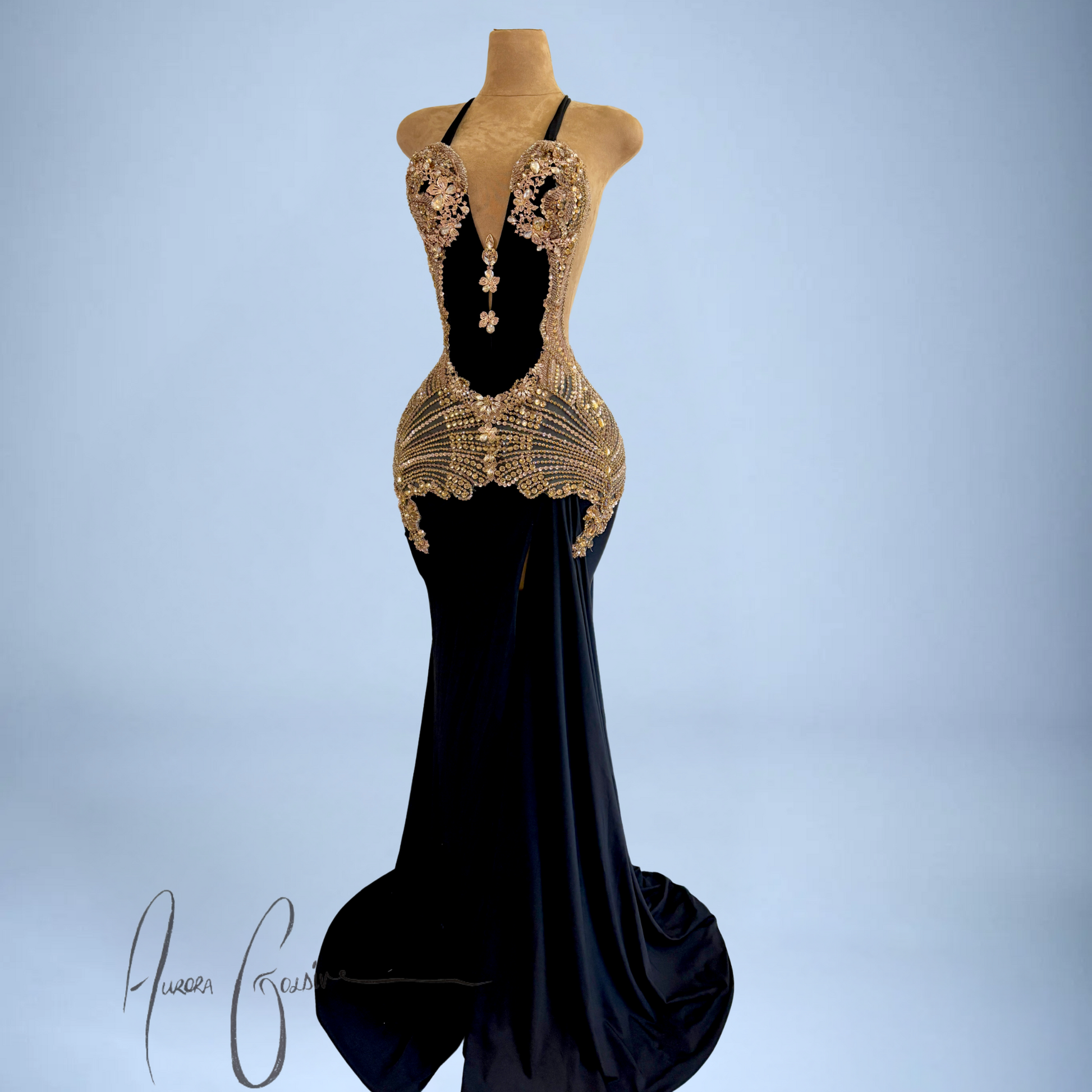 Luxurious fabric meets sophisticated details, the Keasia Gown is a sleek and alluring statement piece. Crafted from black spandex, this gown contours to the body, creating a stunning hourglass silhouette. The gold gemstone embellishments are meticulously arranged in a sculptural pattern, enhancing the neckline and hips with elevated detail.