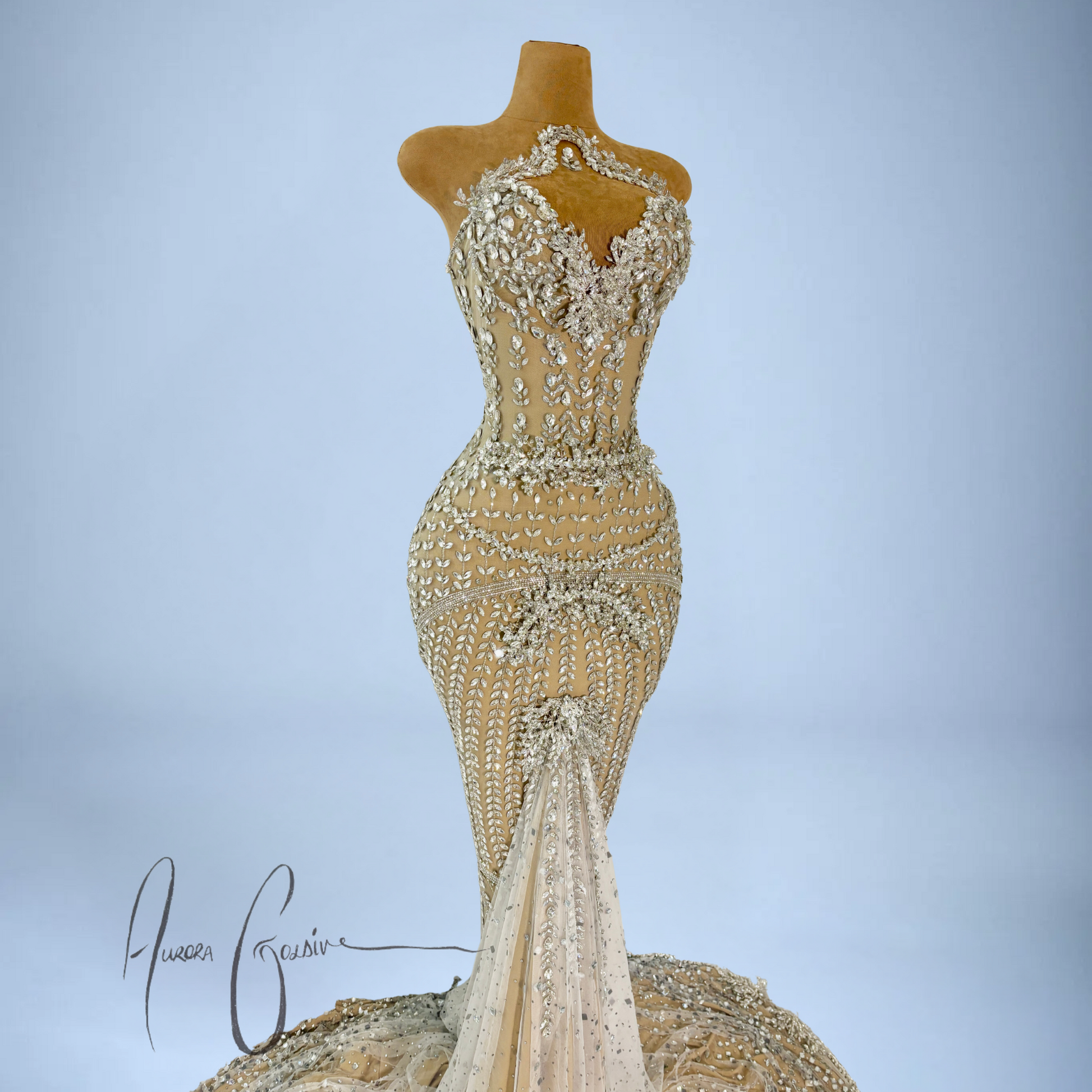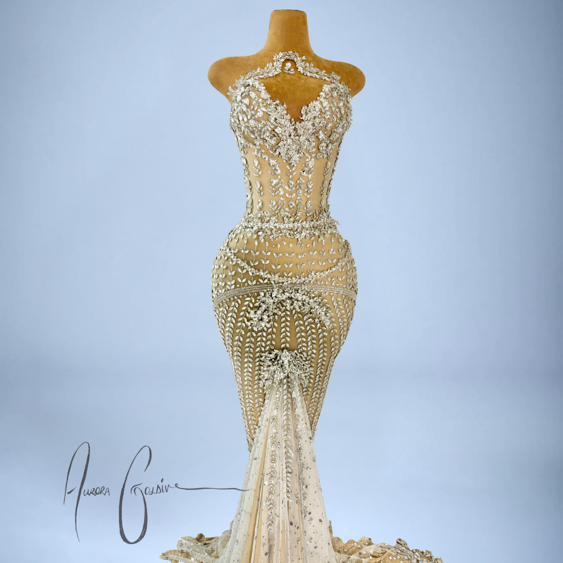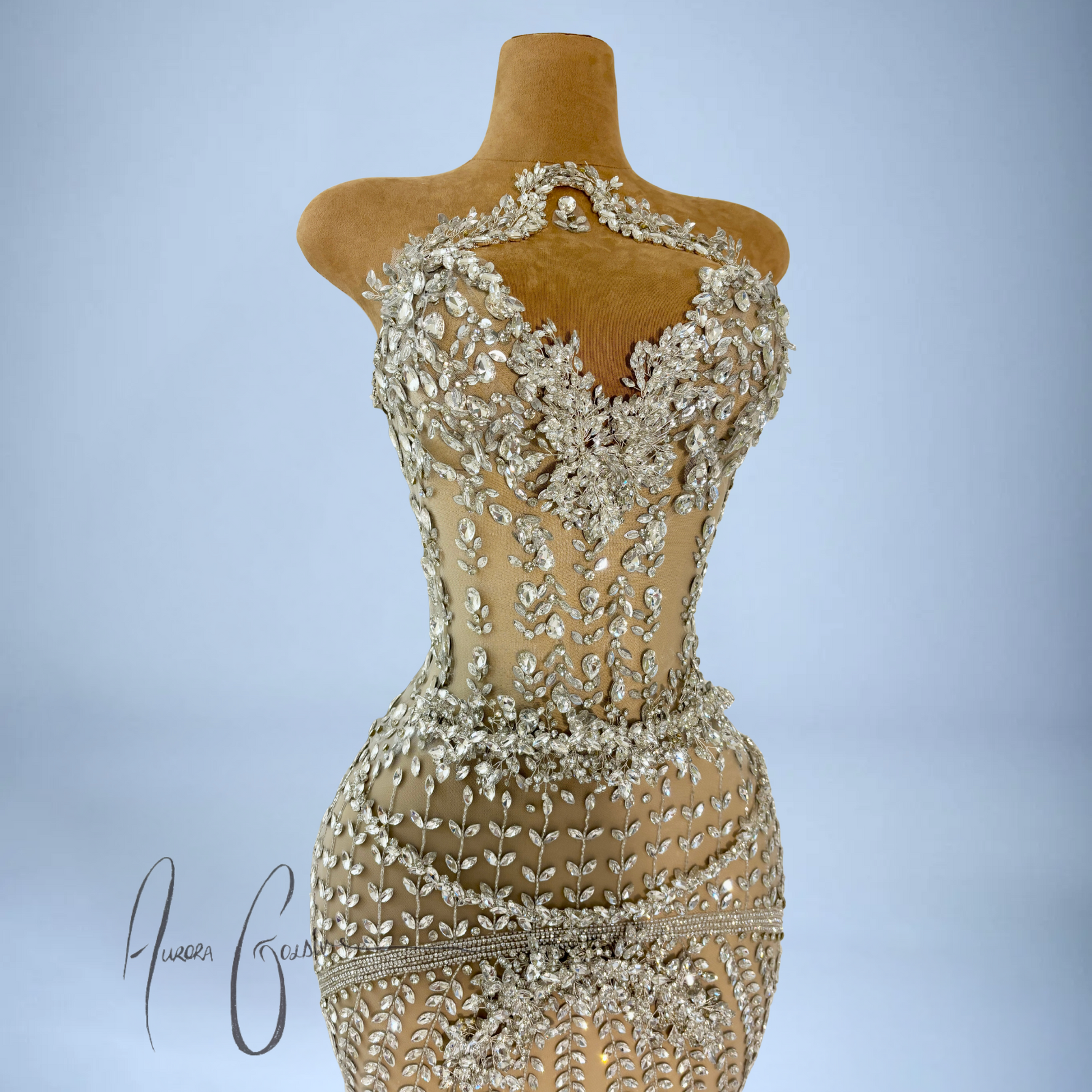 This treasure is the truth of couture. The Kelly Gown is designed for the woman who embraces elegance with an edge of extravagance. This spectacular piece features a sculpted mermaid silhouette layered in silver gemstone embellishments, carefully arranged over a sheer base to create the illusion of floating diamonds.