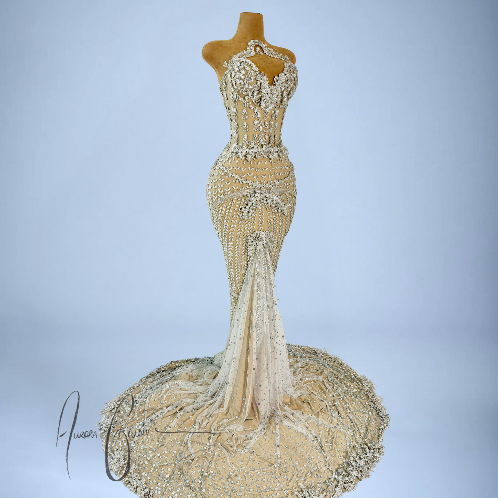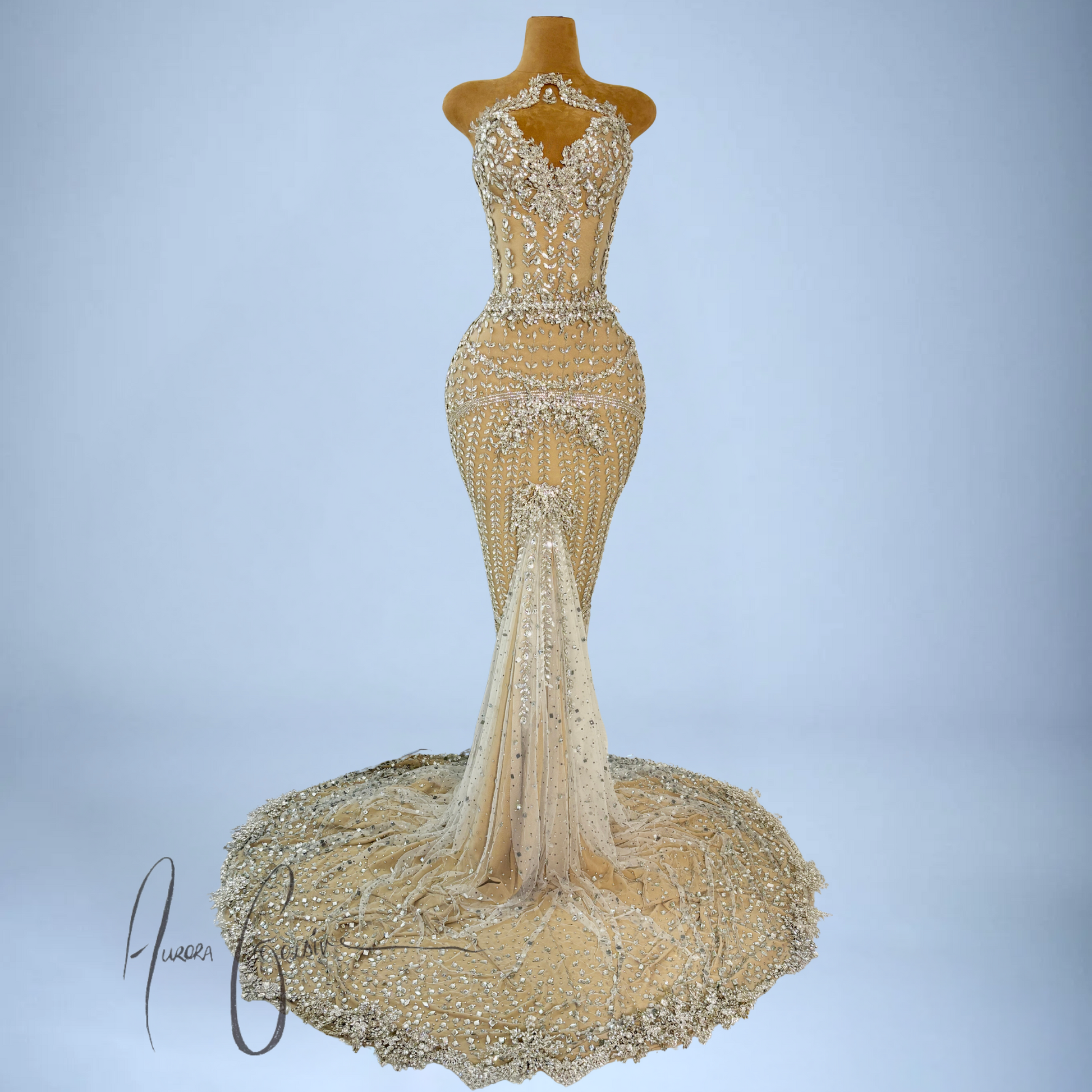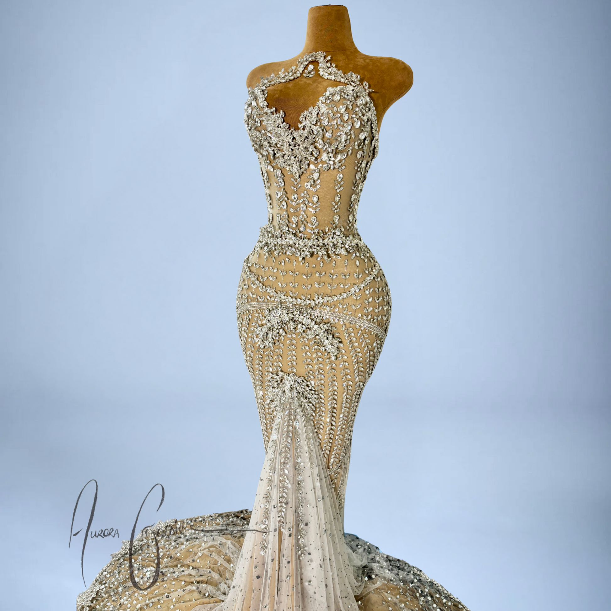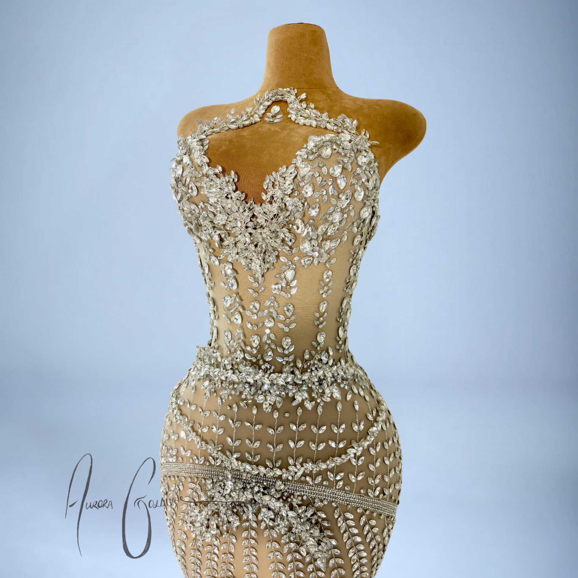 This treasure is the truth of couture. The Kelly Gown is designed for the woman who embraces elegance with an edge of extravagance. This spectacular piece features a sculpted mermaid silhouette layered in silver gemstone embellishments, carefully arranged over a sheer base to create the illusion of floating diamonds.