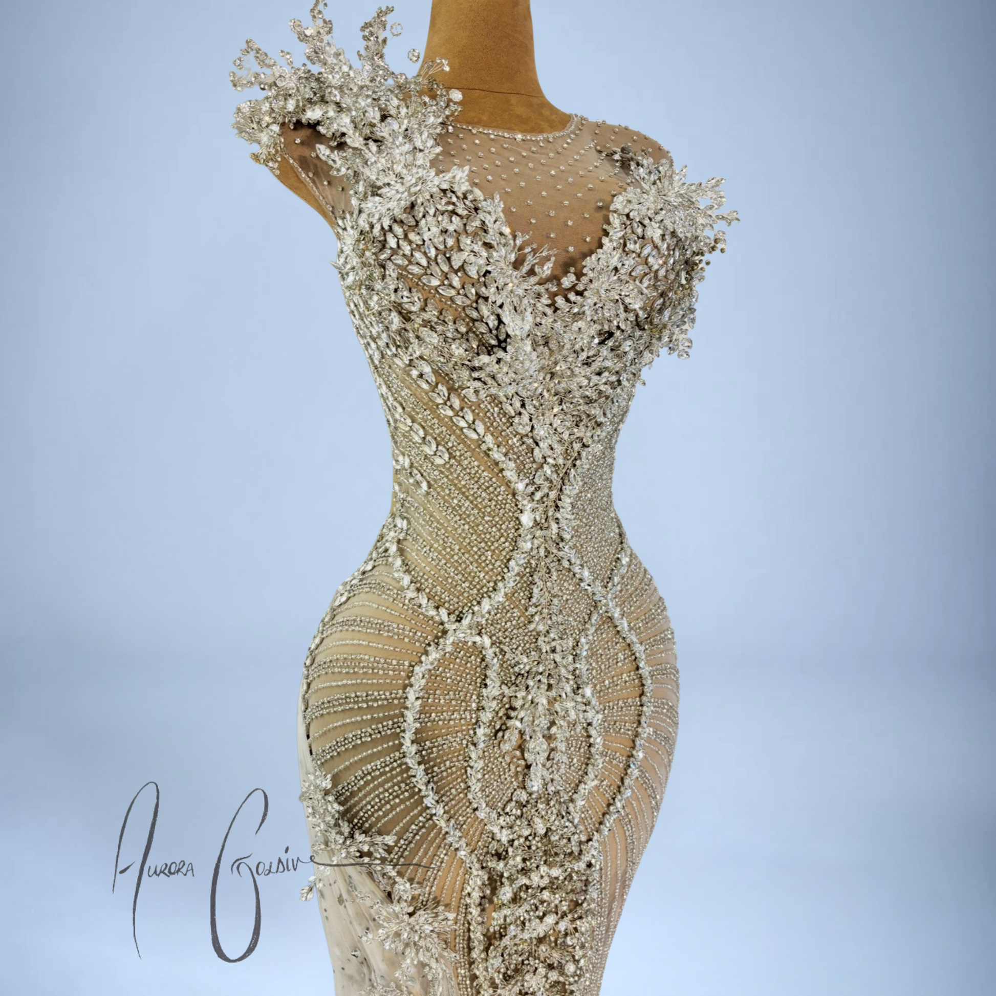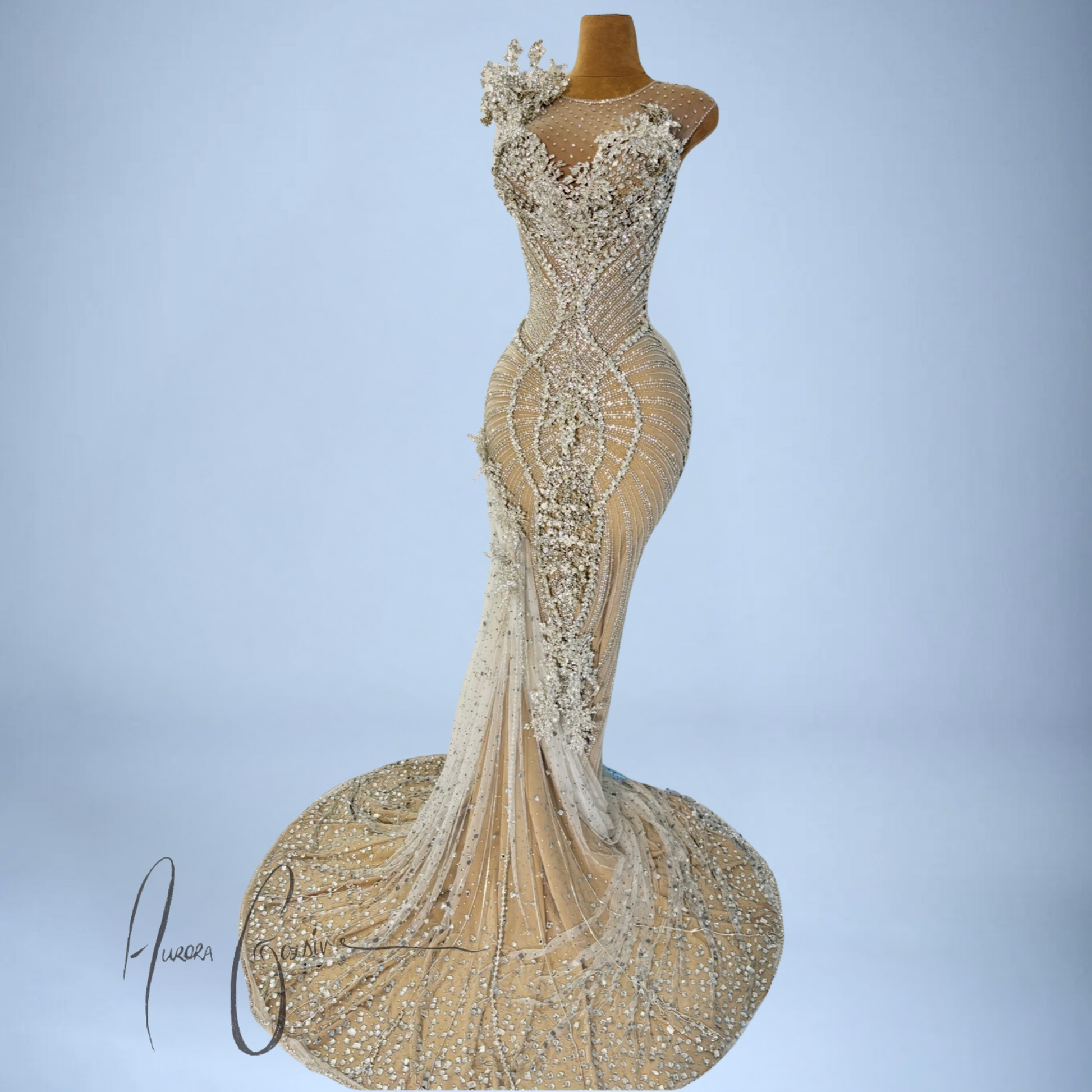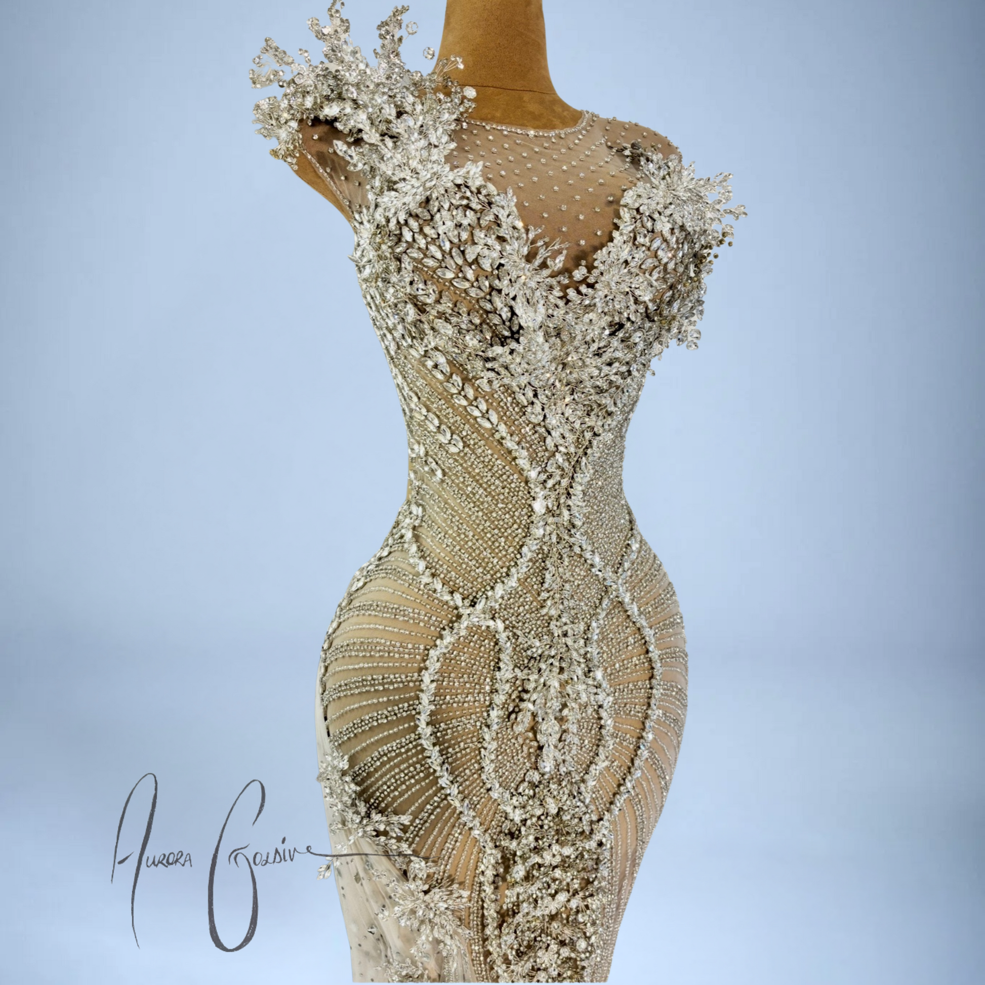 The Keyona gown is an exquisite, statement of couture artistry and modern femininity. Designed in a sculpted hourglass mermaid silhouette, this gown contours the body with artistic precision before flowing into a softly draped side train that creates movement that is graceful with every step.