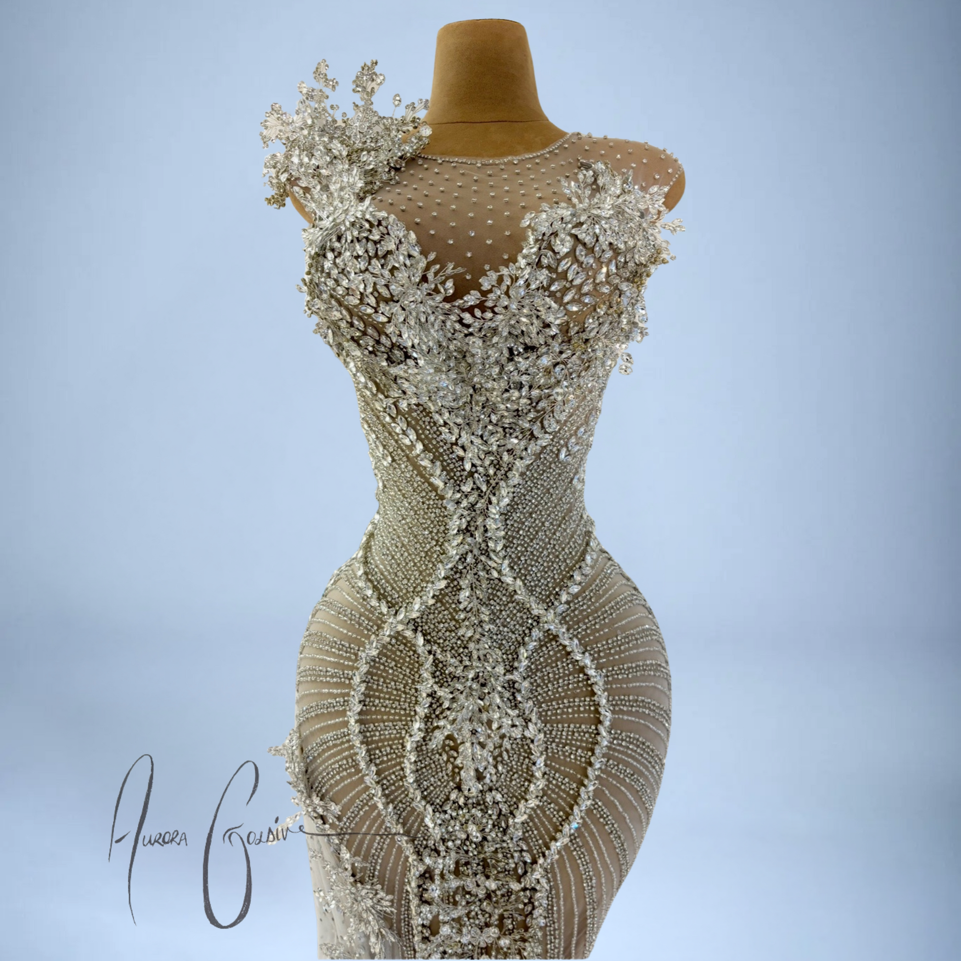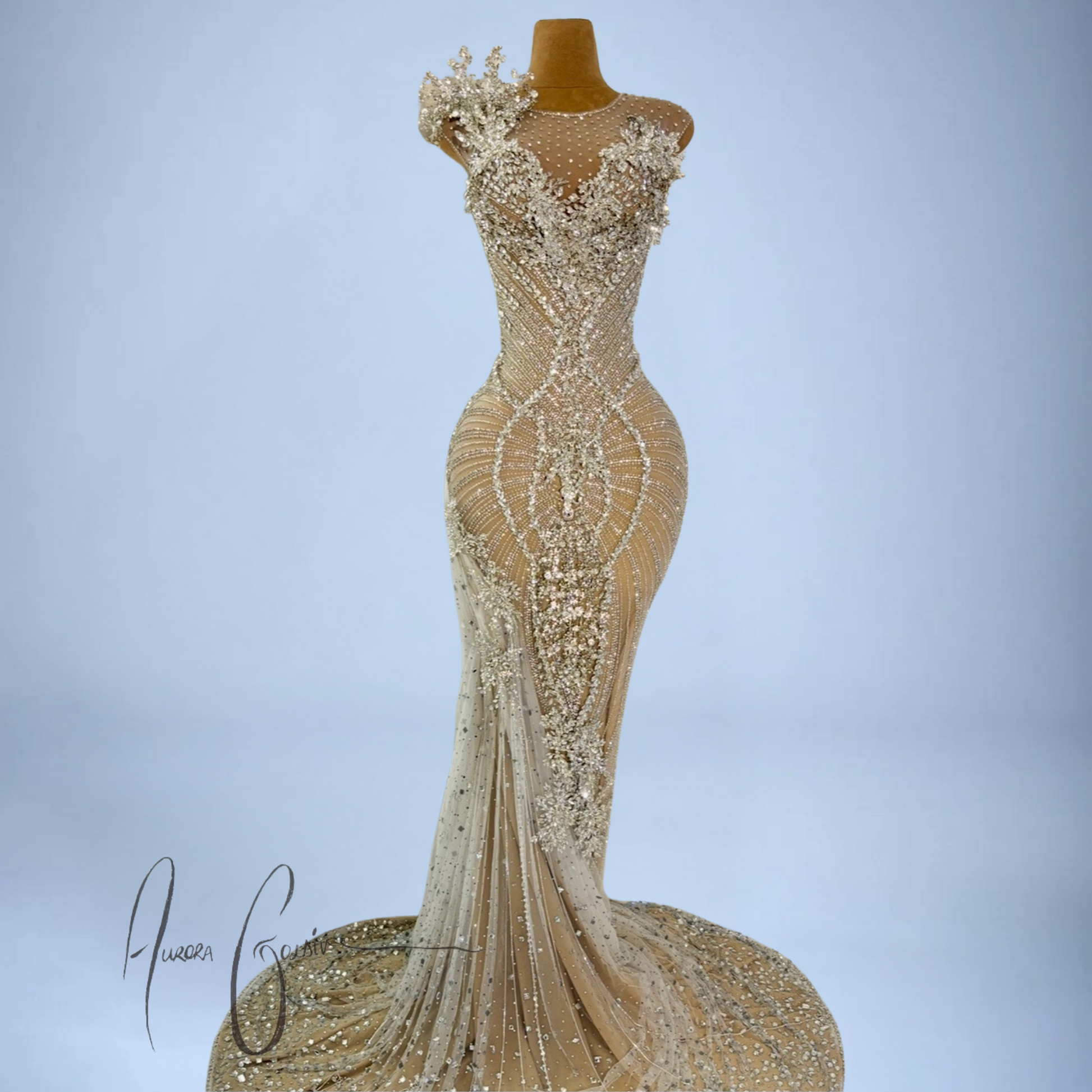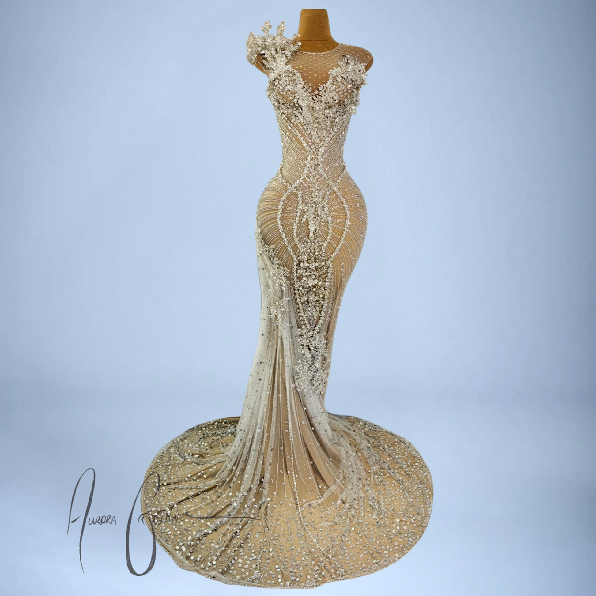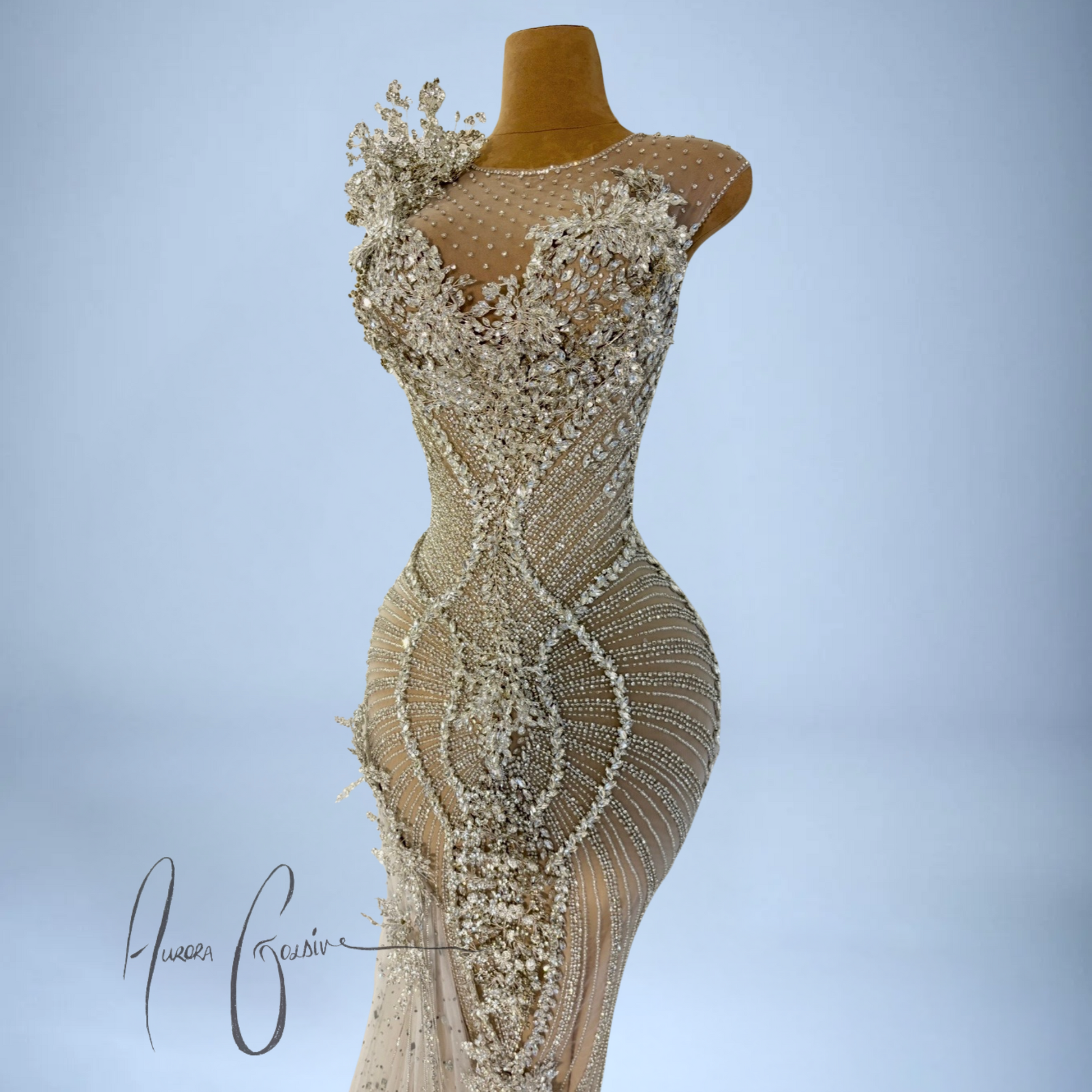 The Keyona gown is an exquisite, statement of couture artistry and modern femininity. Designed in a sculpted hourglass mermaid silhouette, this gown contours the body with artistic precision before flowing into a softly draped side train that creates movement that is graceful with every step.
