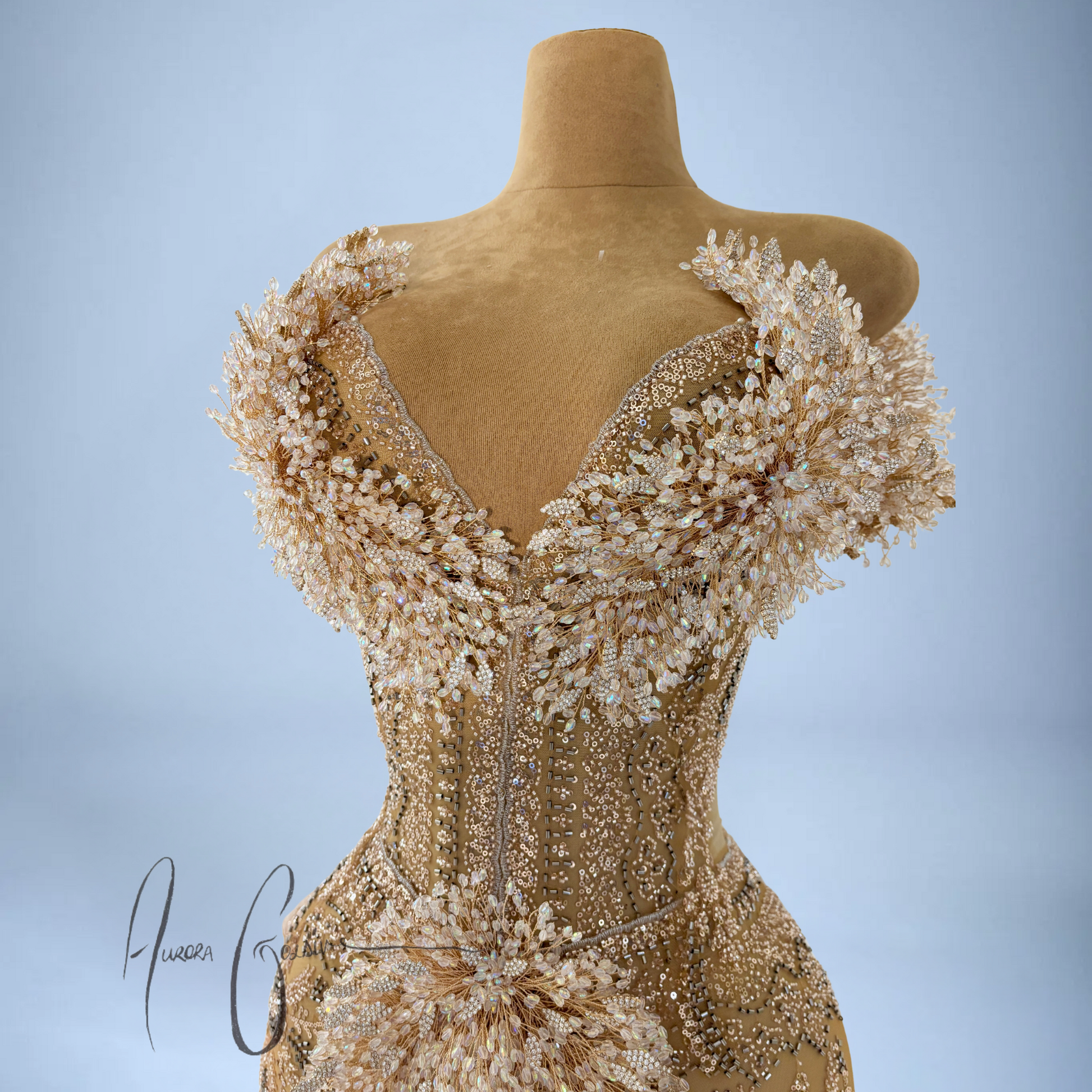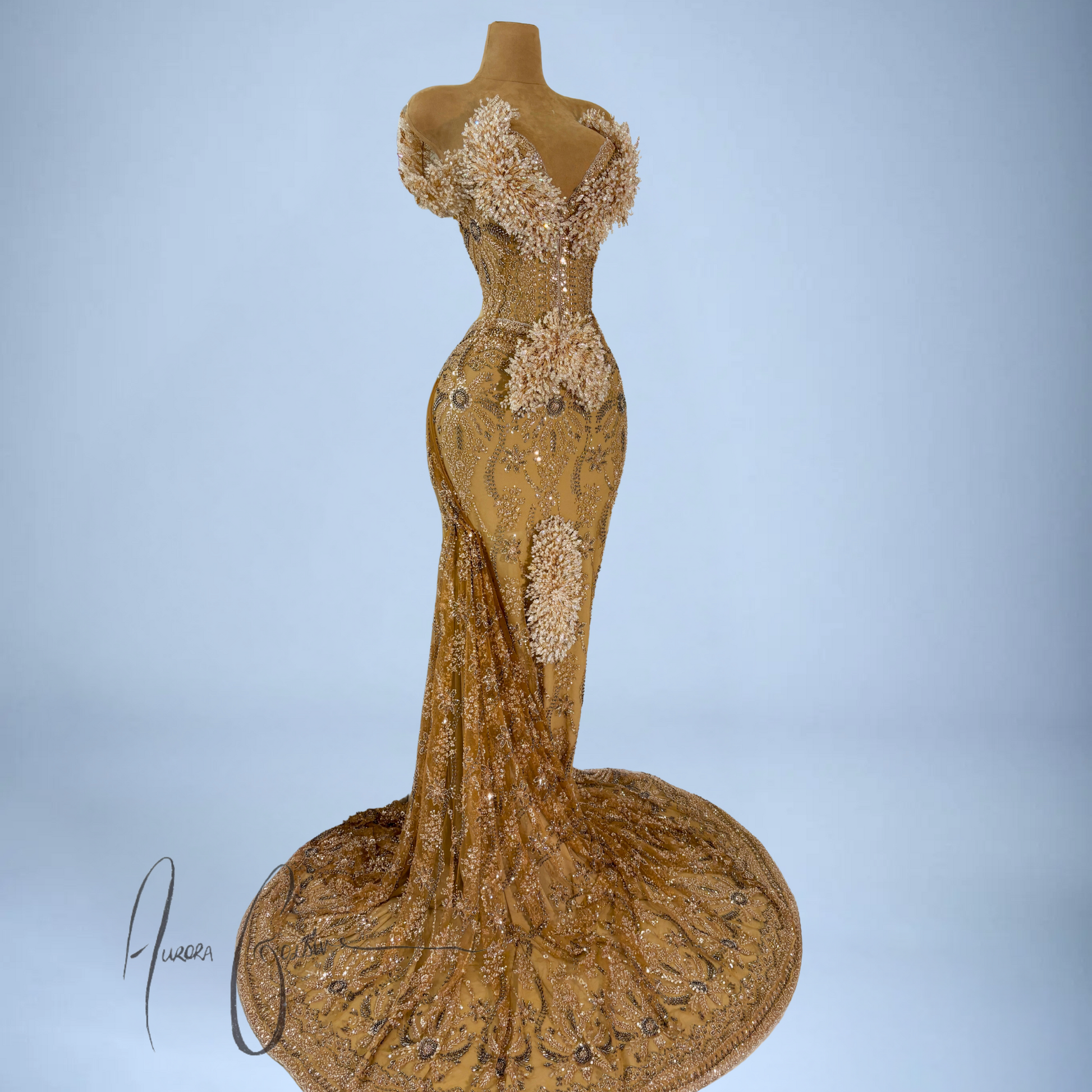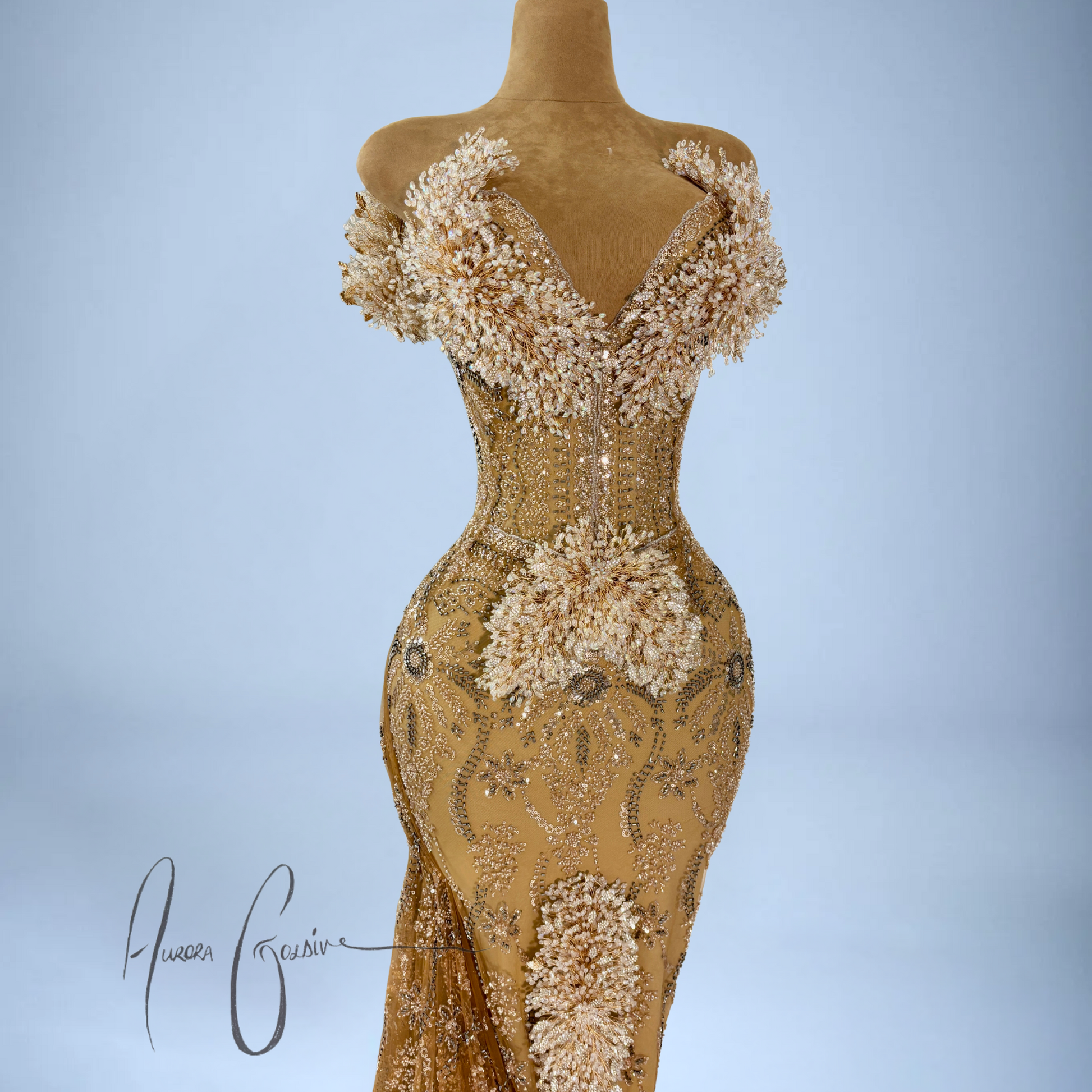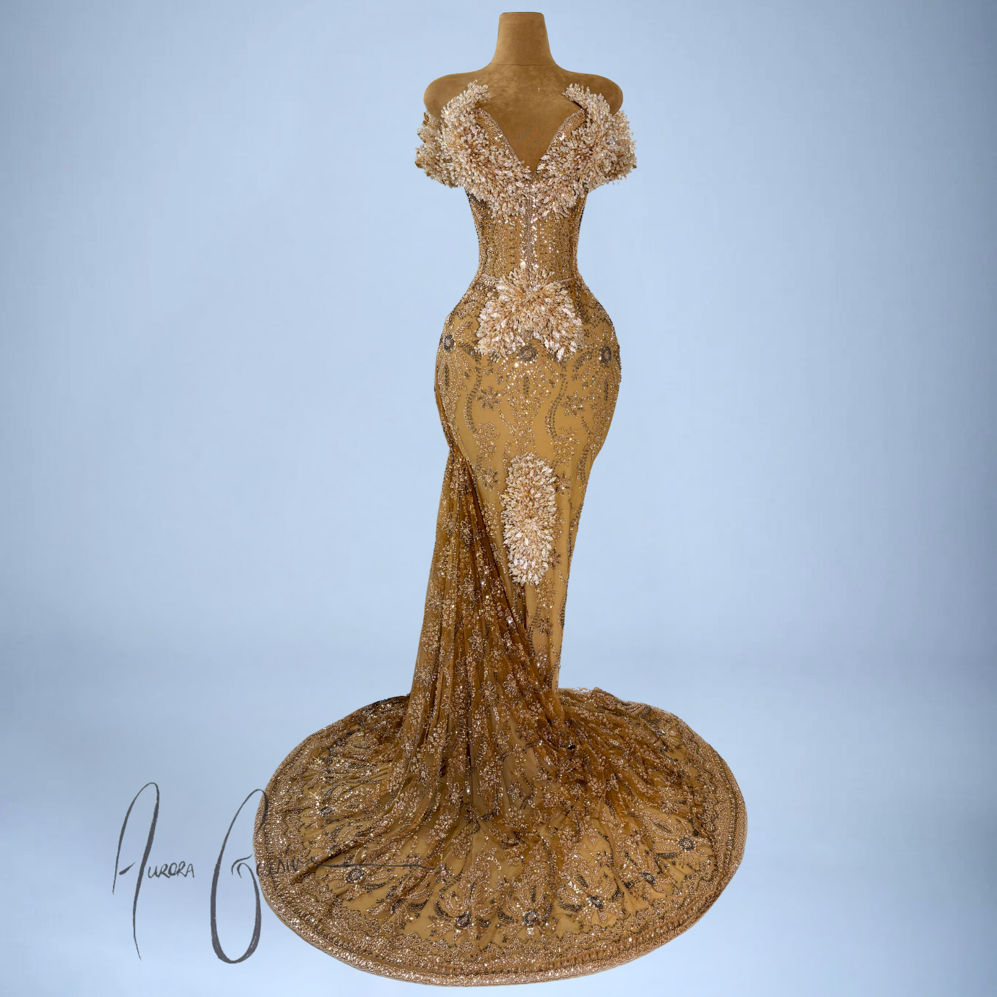 The neckline enhances the décolletage, while sculpted beadwork contours the body, leading into a shimmering copper and brown-toned train. Every detail is placed with intention to display opulence and shimmer. The layered textures and metallic hues make Sheba ideal for evening wear that calls for both bling and high fashion.