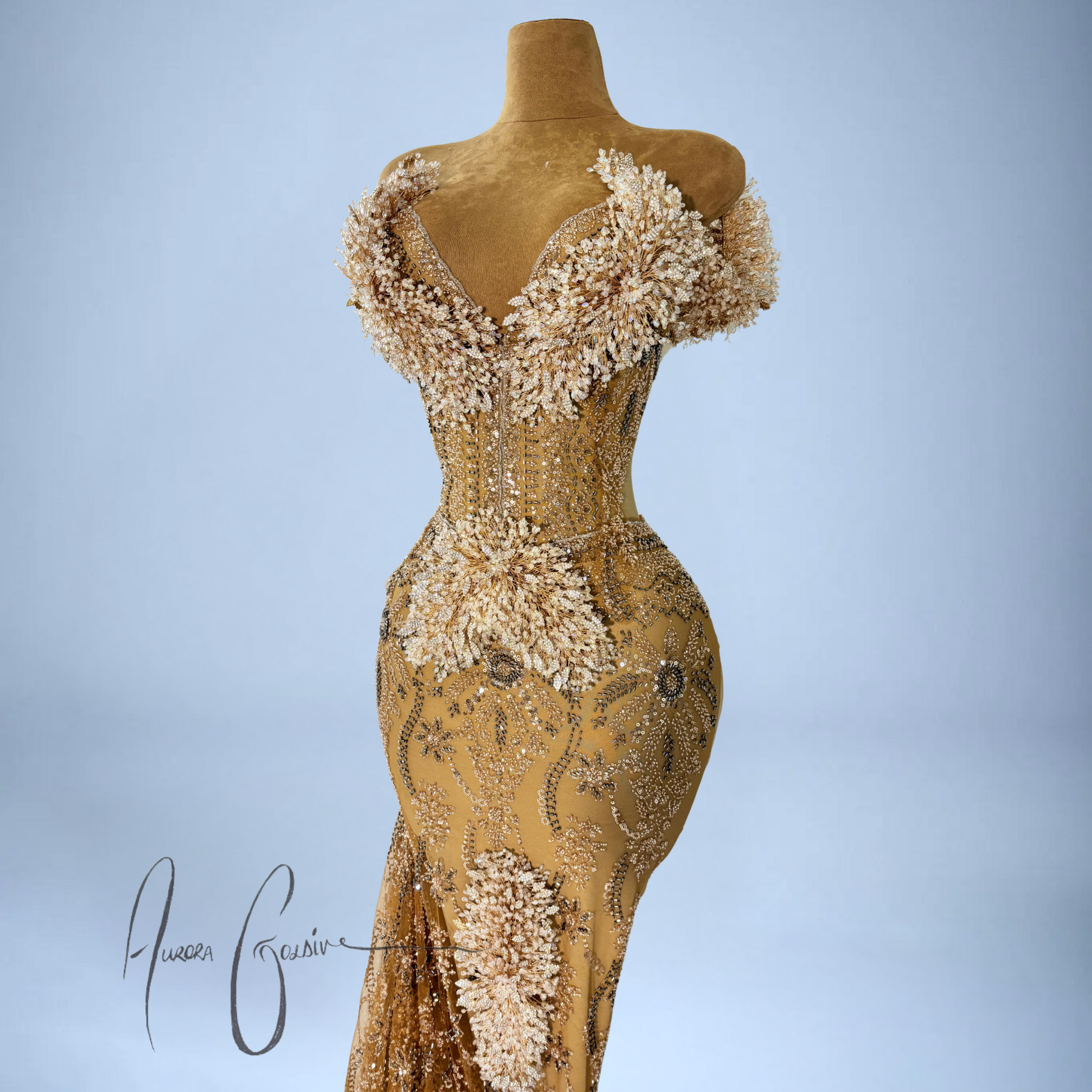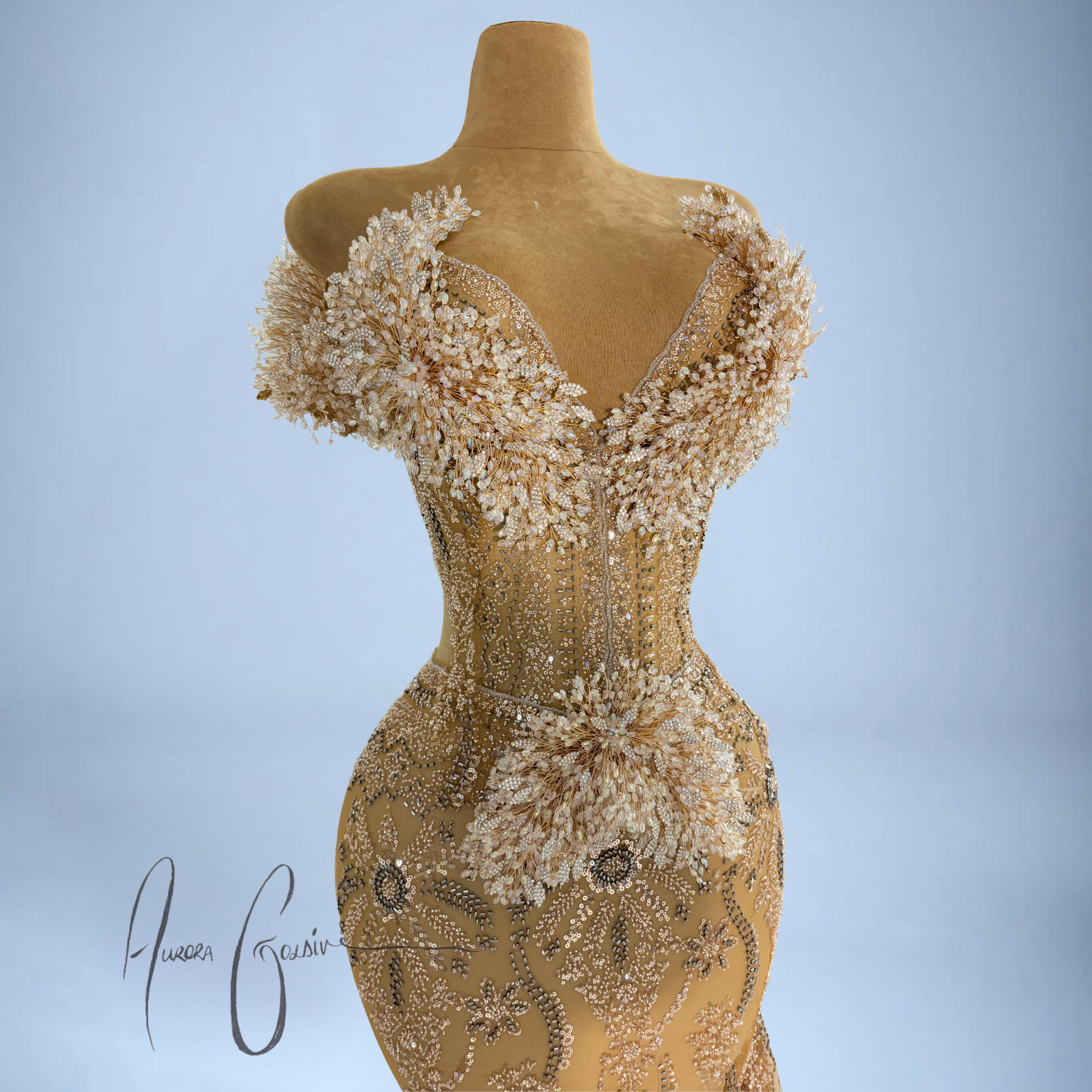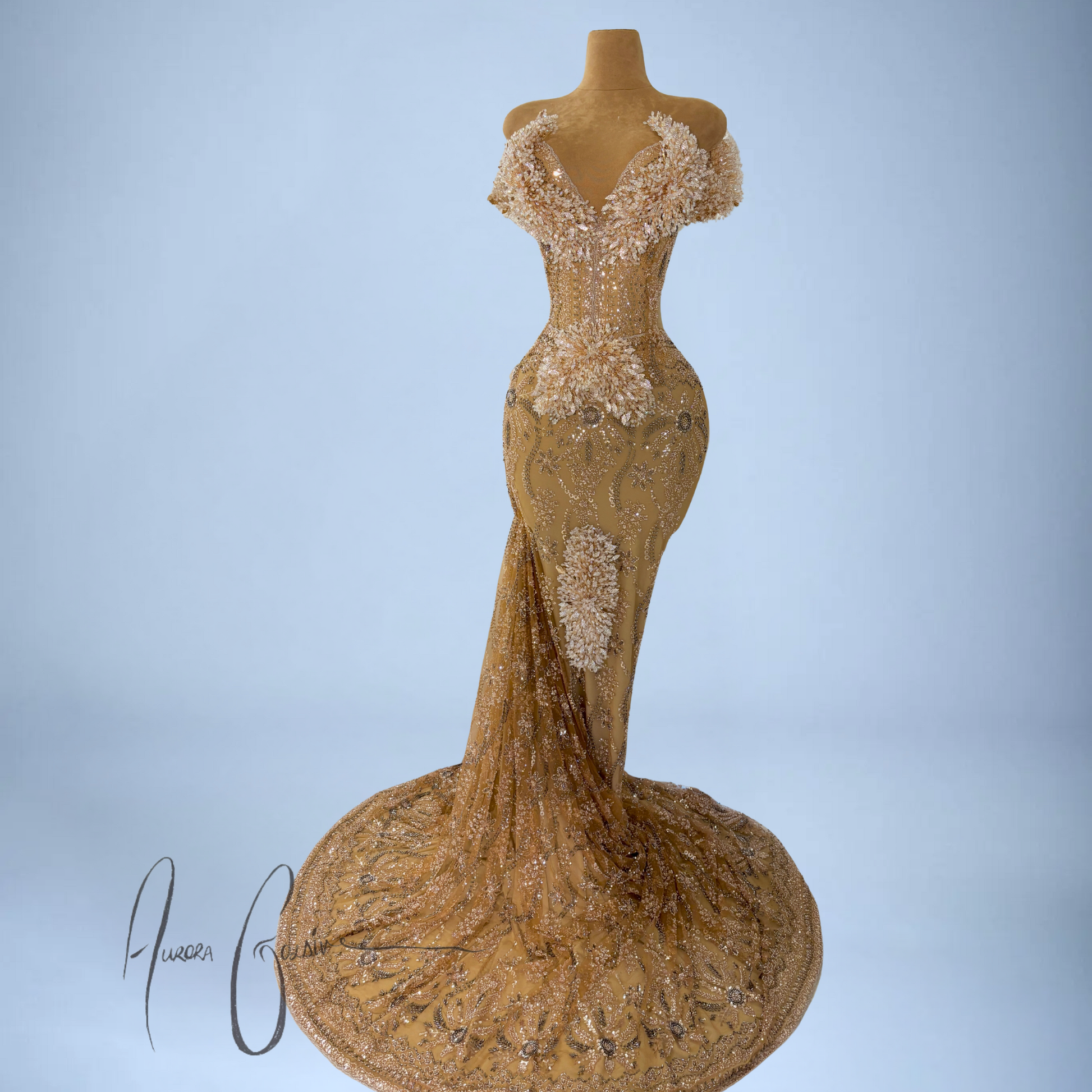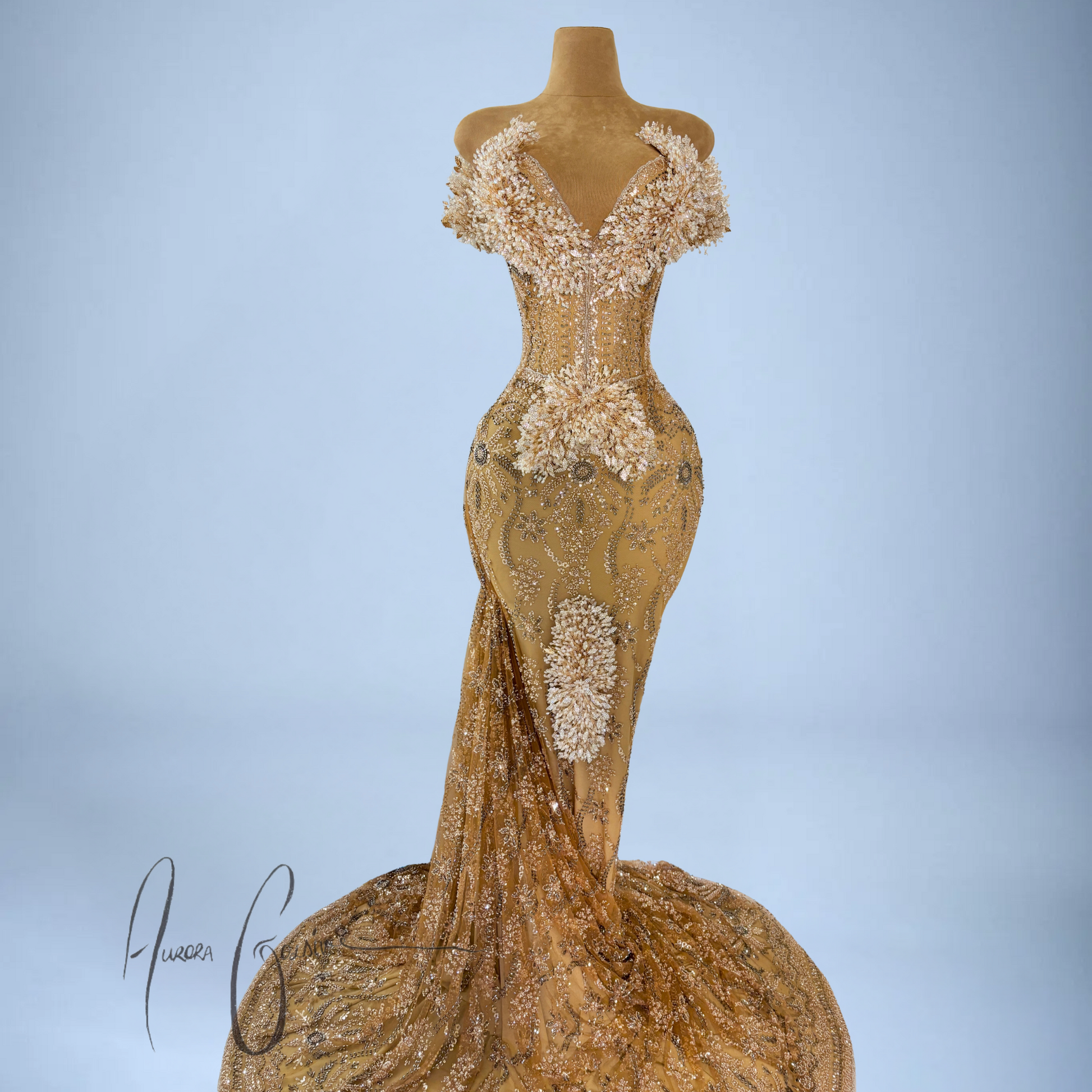 The neckline enhances the décolletage, while sculpted beadwork contours the body, leading into a shimmering copper and brown-toned train. Every detail is placed with intention to display opulence and shimmer. The layered textures and metallic hues make Sheba ideal for evening wear that calls for both bling and high fashion.