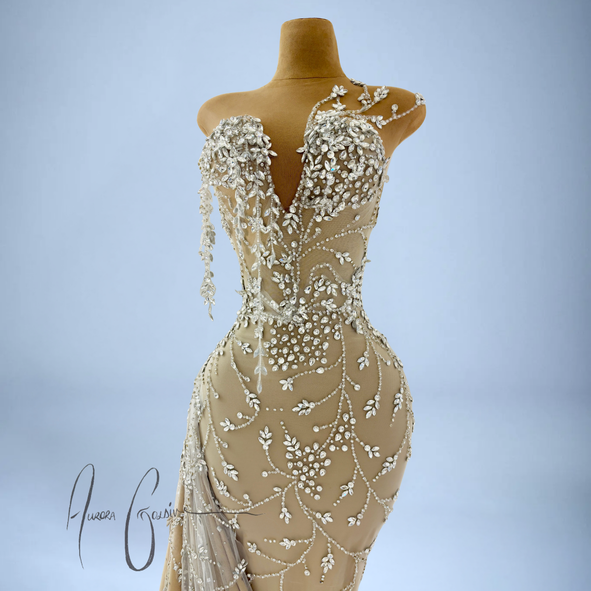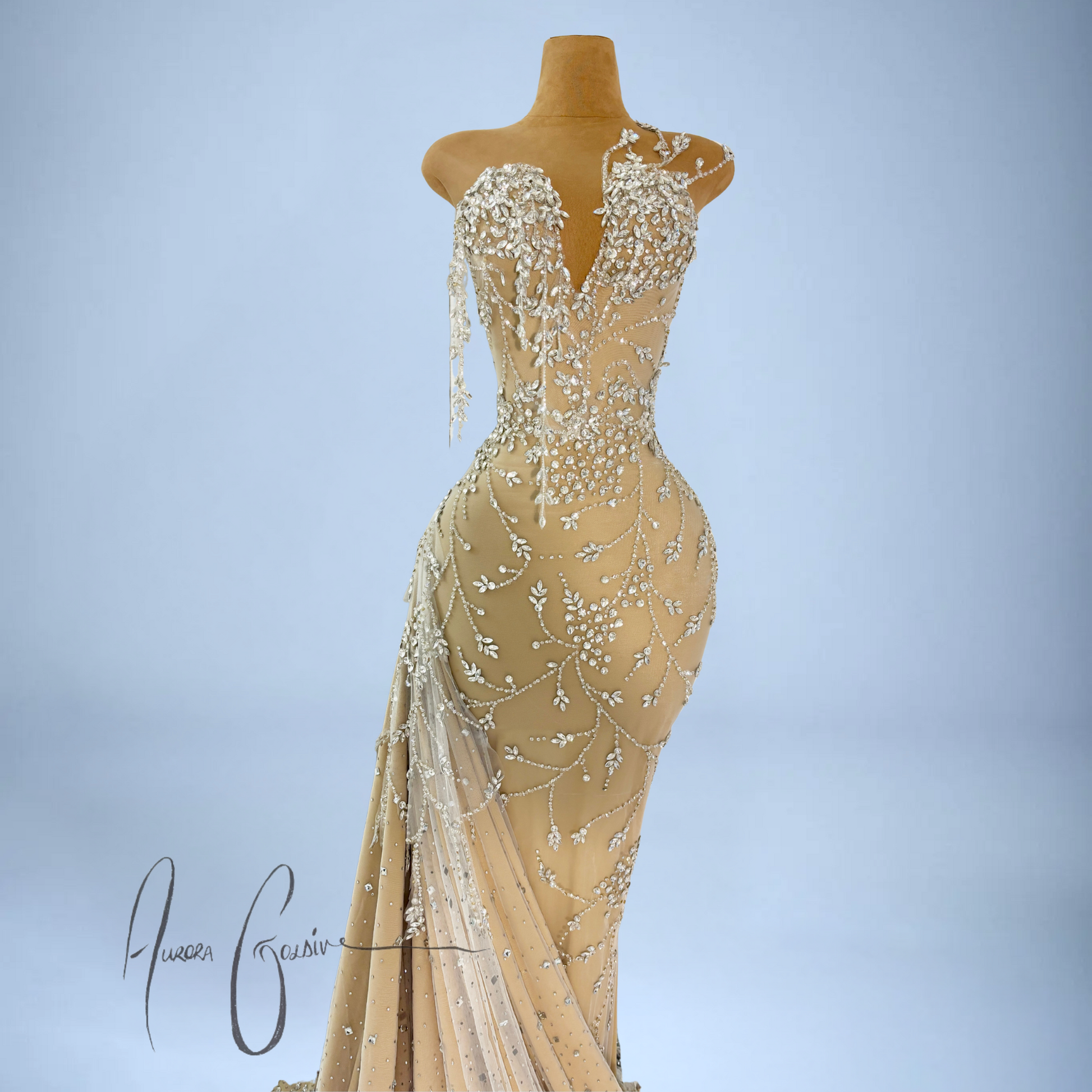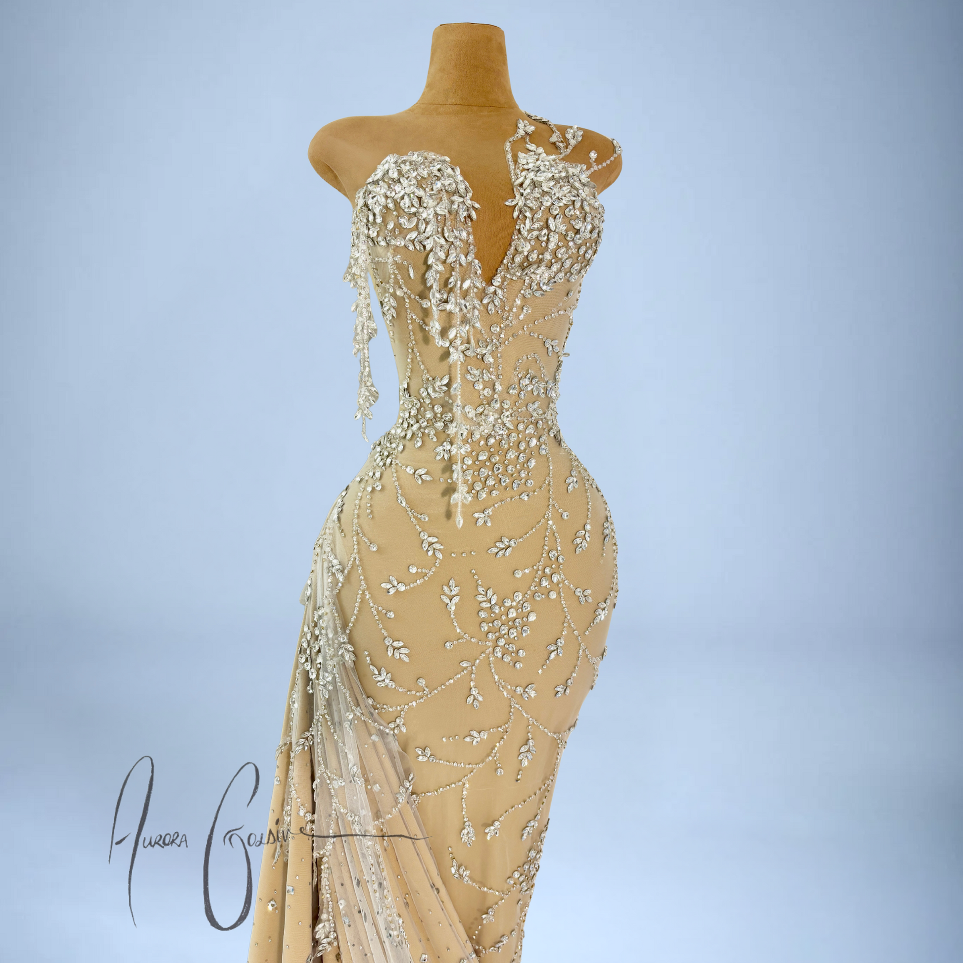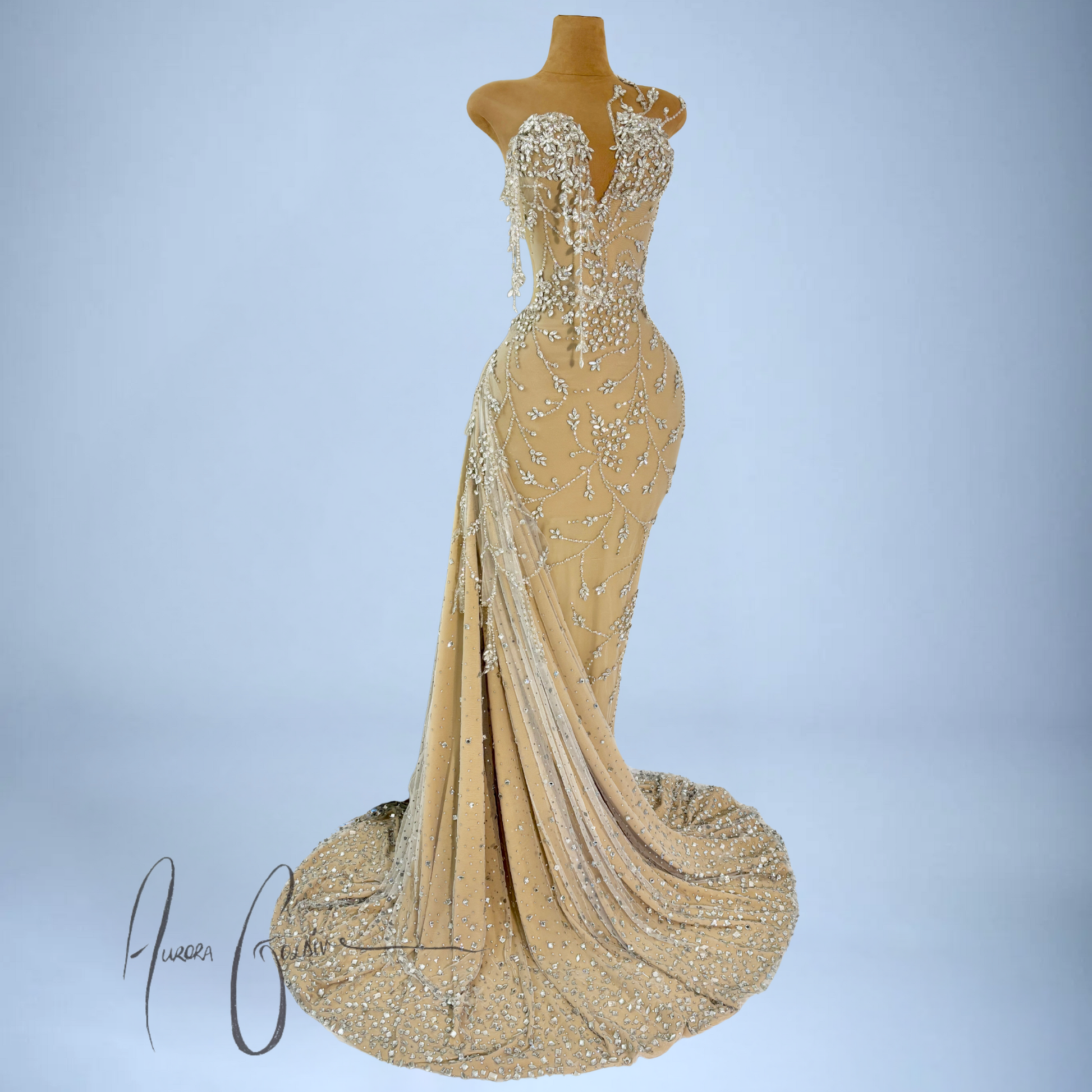 The fitted bodice features a deep V-neckline with cascading silver floral beadwork, shaped to envision blooming vines. Subtle asymmetry at the neckline adds depth, while the bodice cascades into a flowing skirt with a draped crystal-train. Each bead and gemstone is hand-applied, creating a graceful pattern that flatters and elongates the frame.