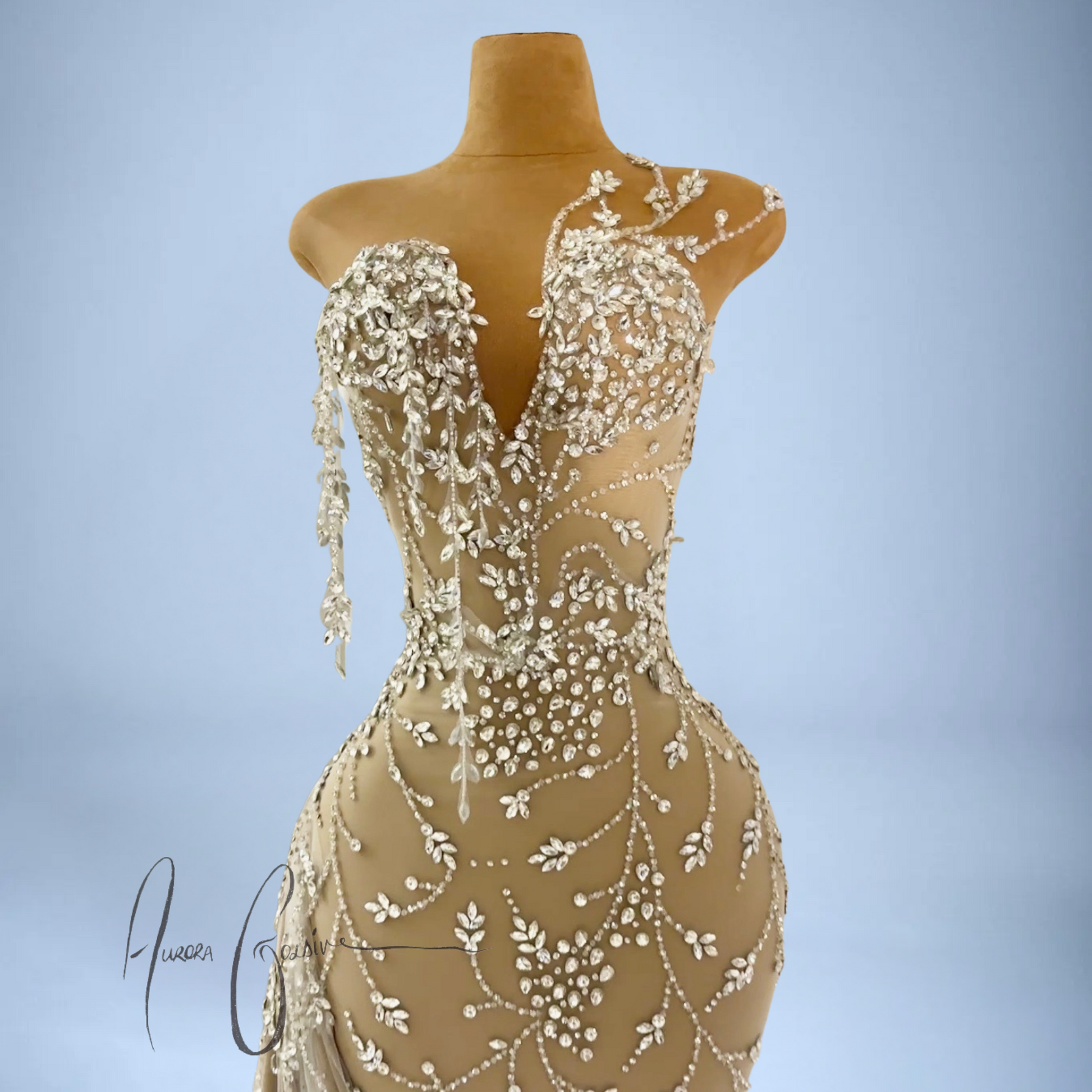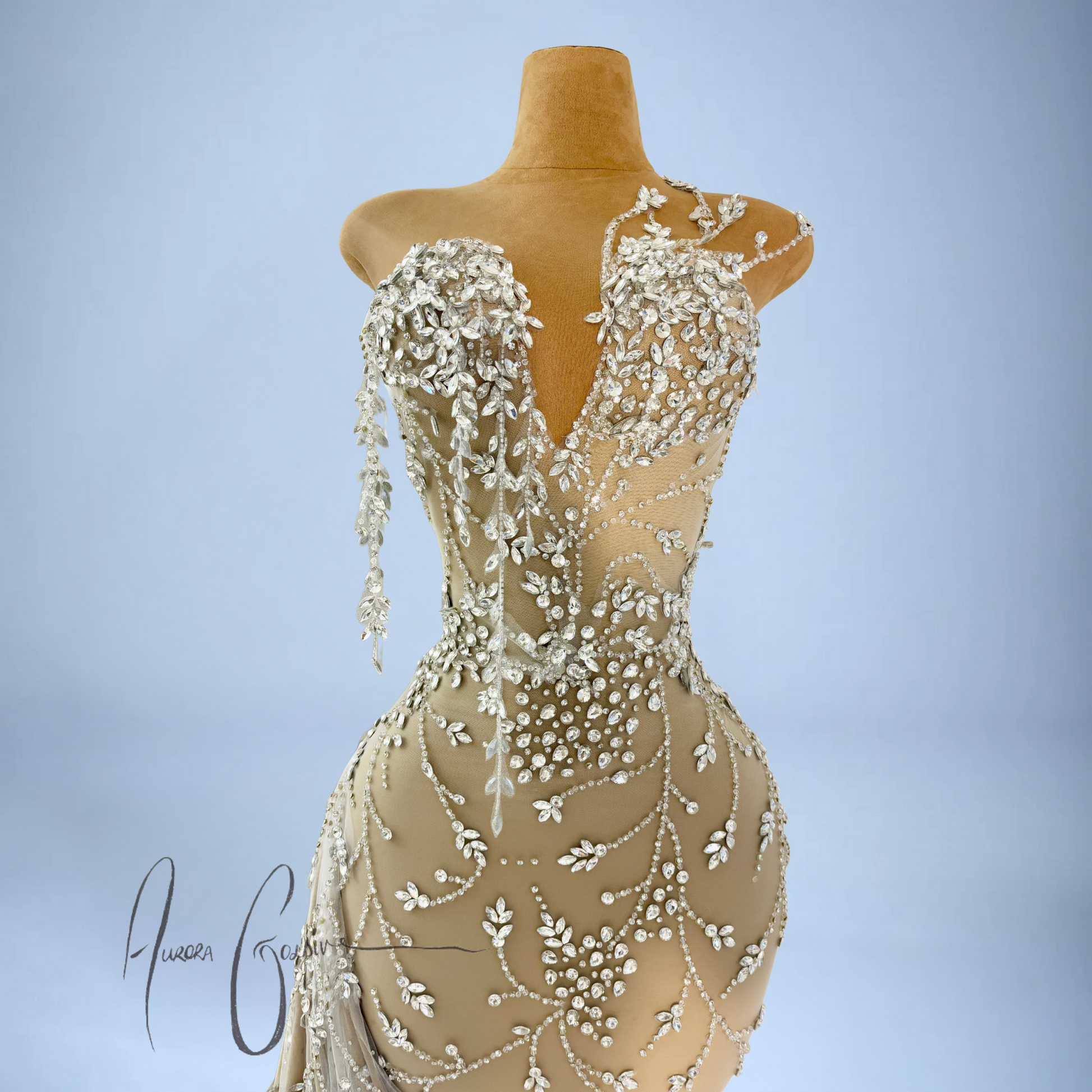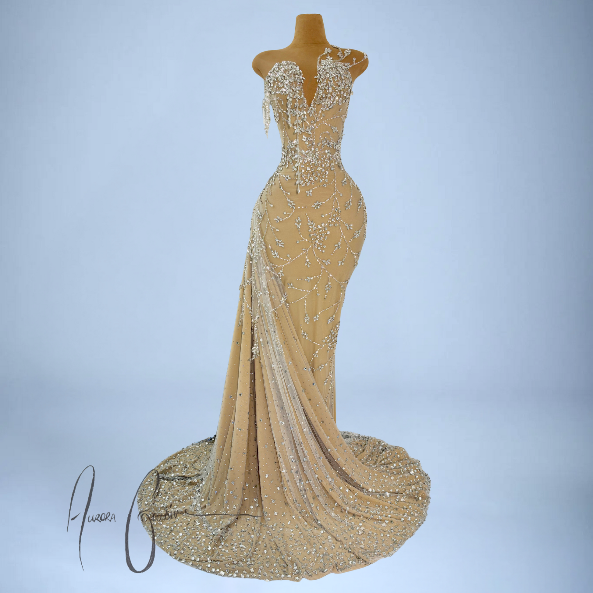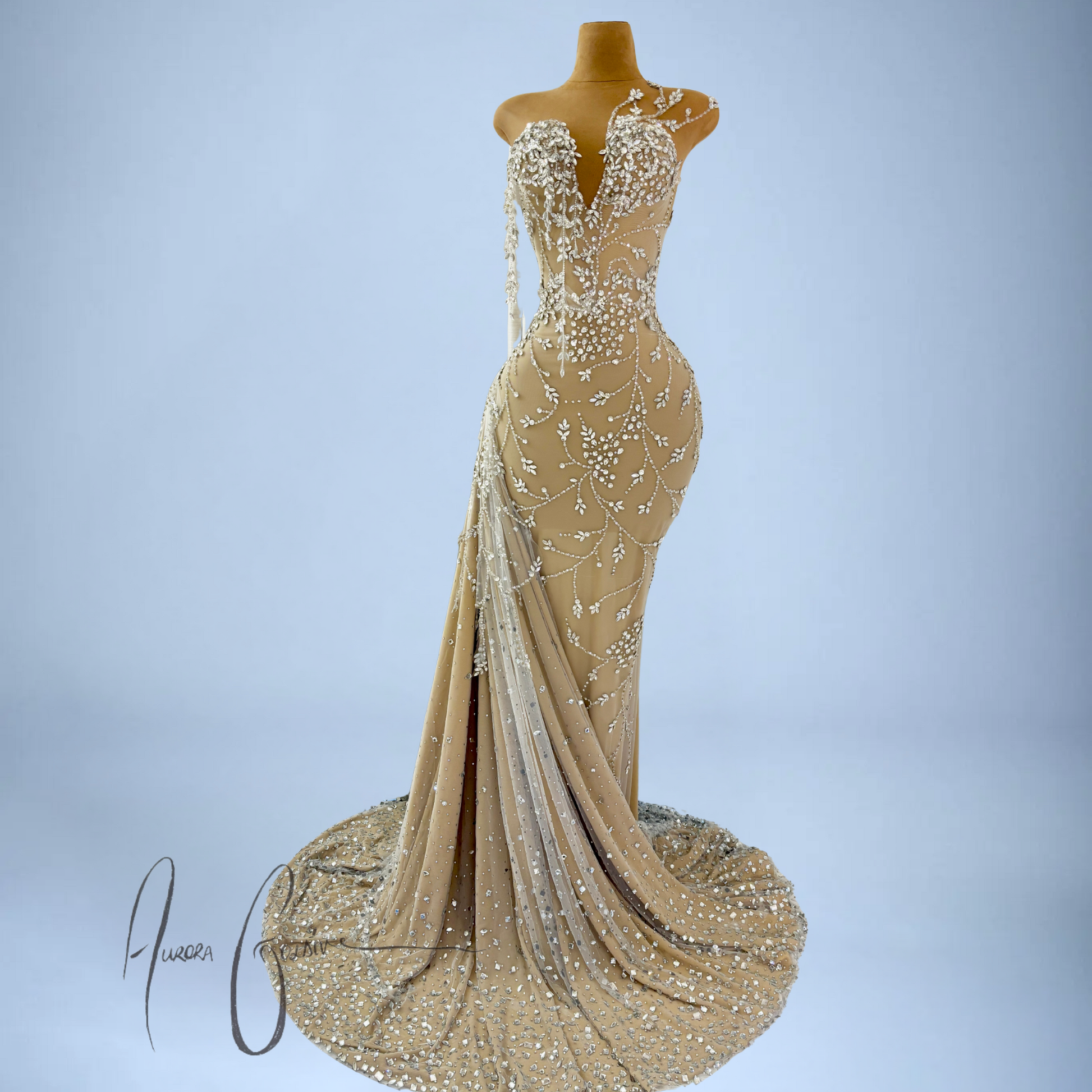 The fitted bodice features a deep V-neckline with cascading silver floral beadwork, shaped to envision blooming vines. Subtle asymmetry at the neckline adds depth, while the bodice cascades into a flowing skirt with a draped crystal-train. Each bead and gemstone is hand-applied, creating a graceful pattern that flatters and elongates the frame.