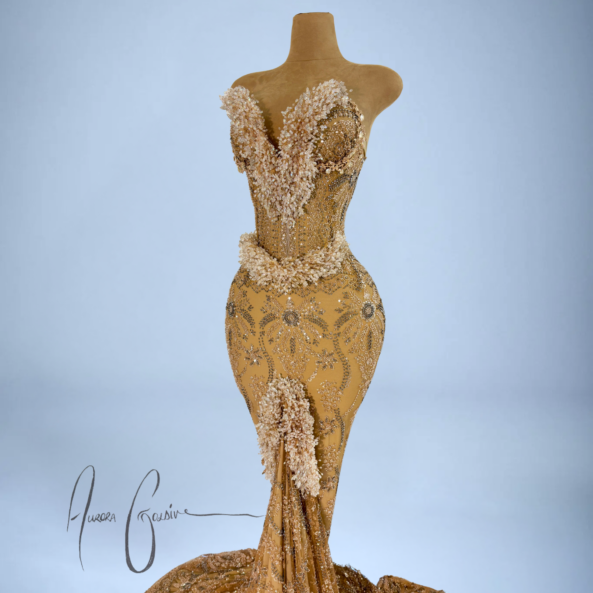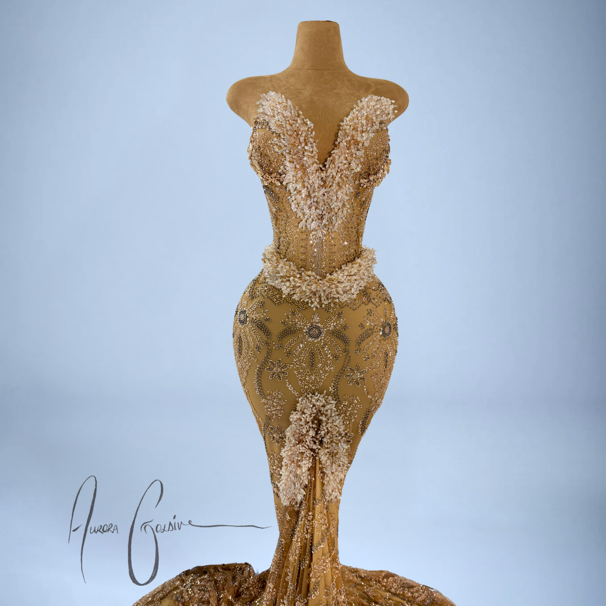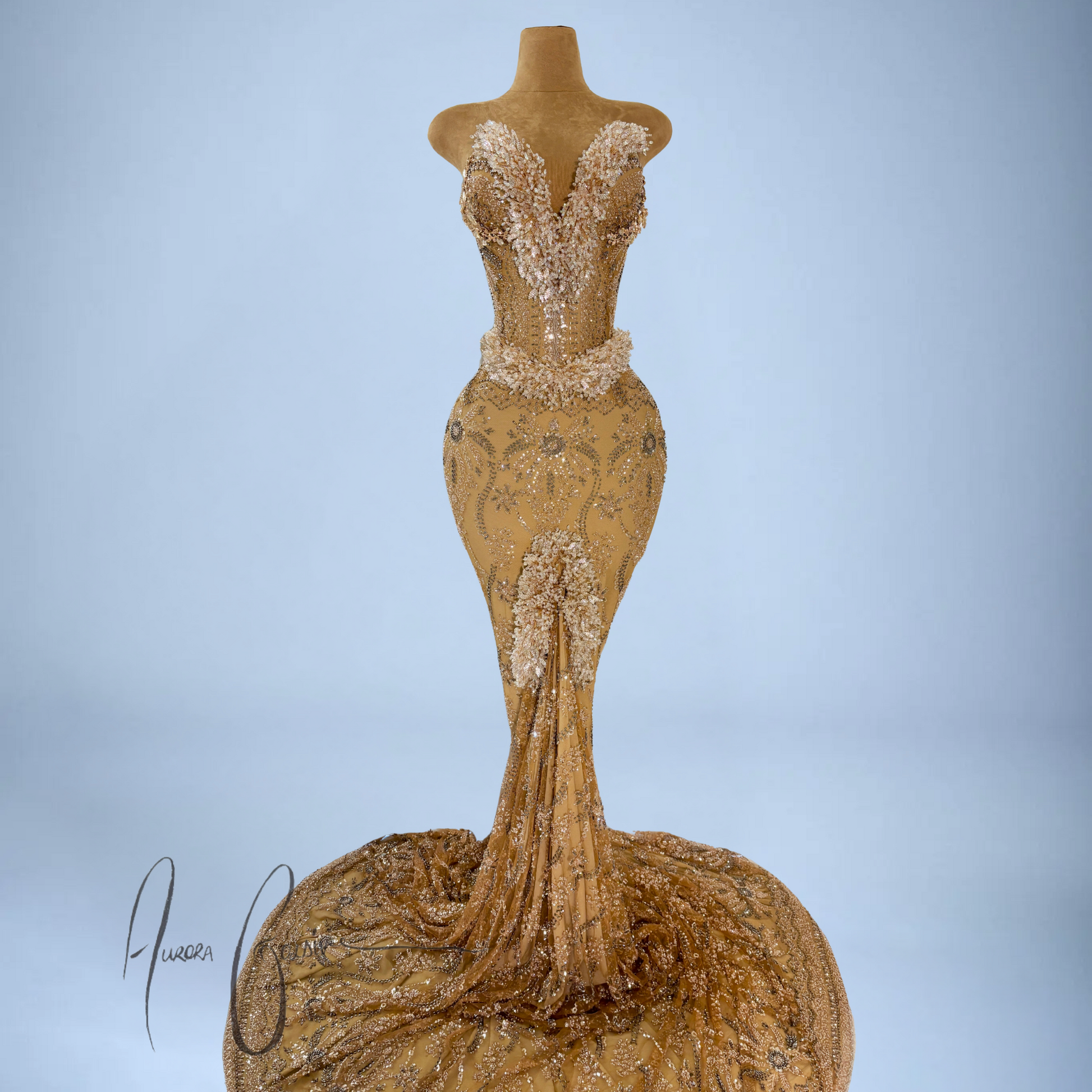 The Winnie Gown is a true work of couture with rich craftsmanship and detail, sculpted into form, and made to give a lasting impression. Designed in a structured mermaid silhouette, this gown features a lavish blend of copper, rose gold, and brown sequin embroidery intricately woven into a nude base.