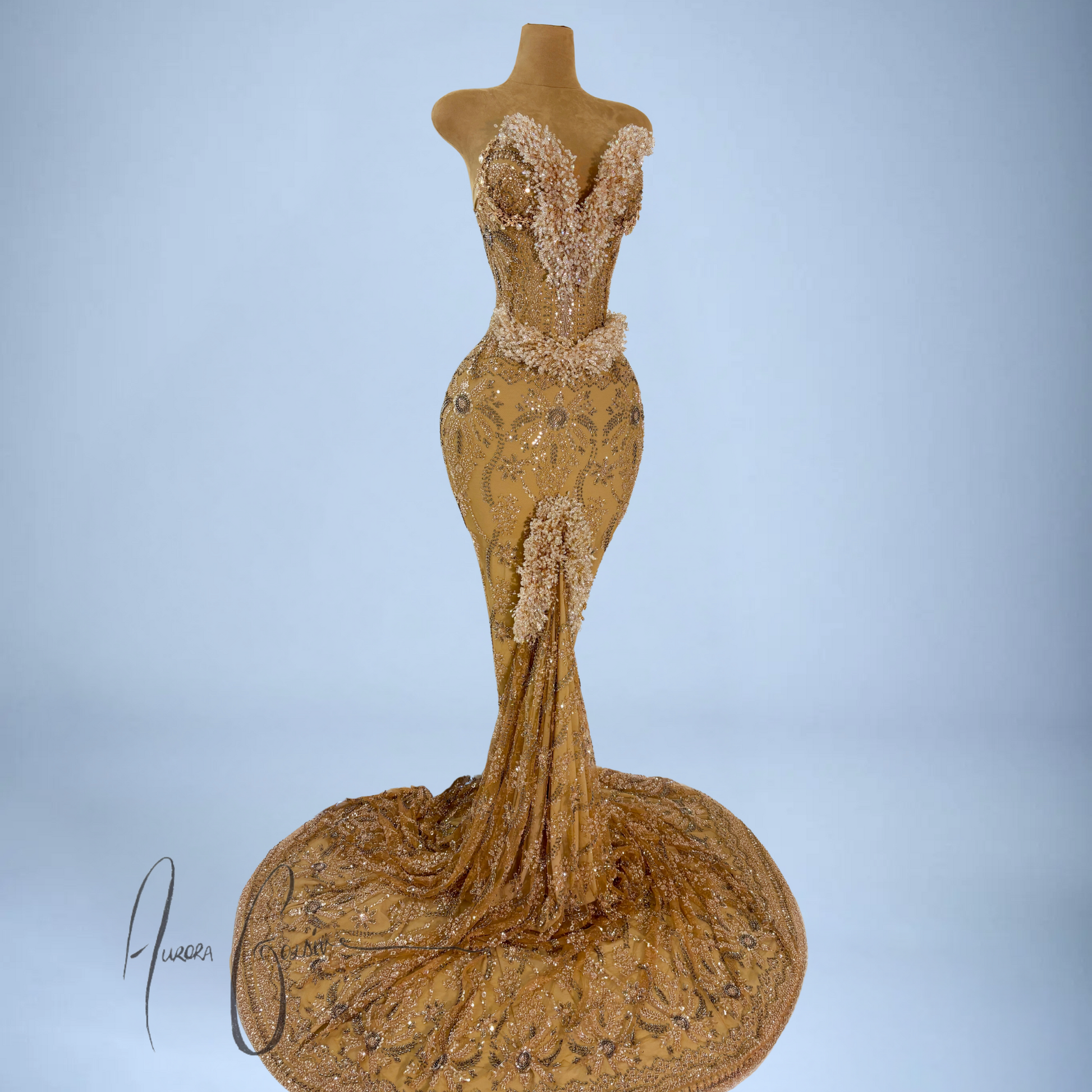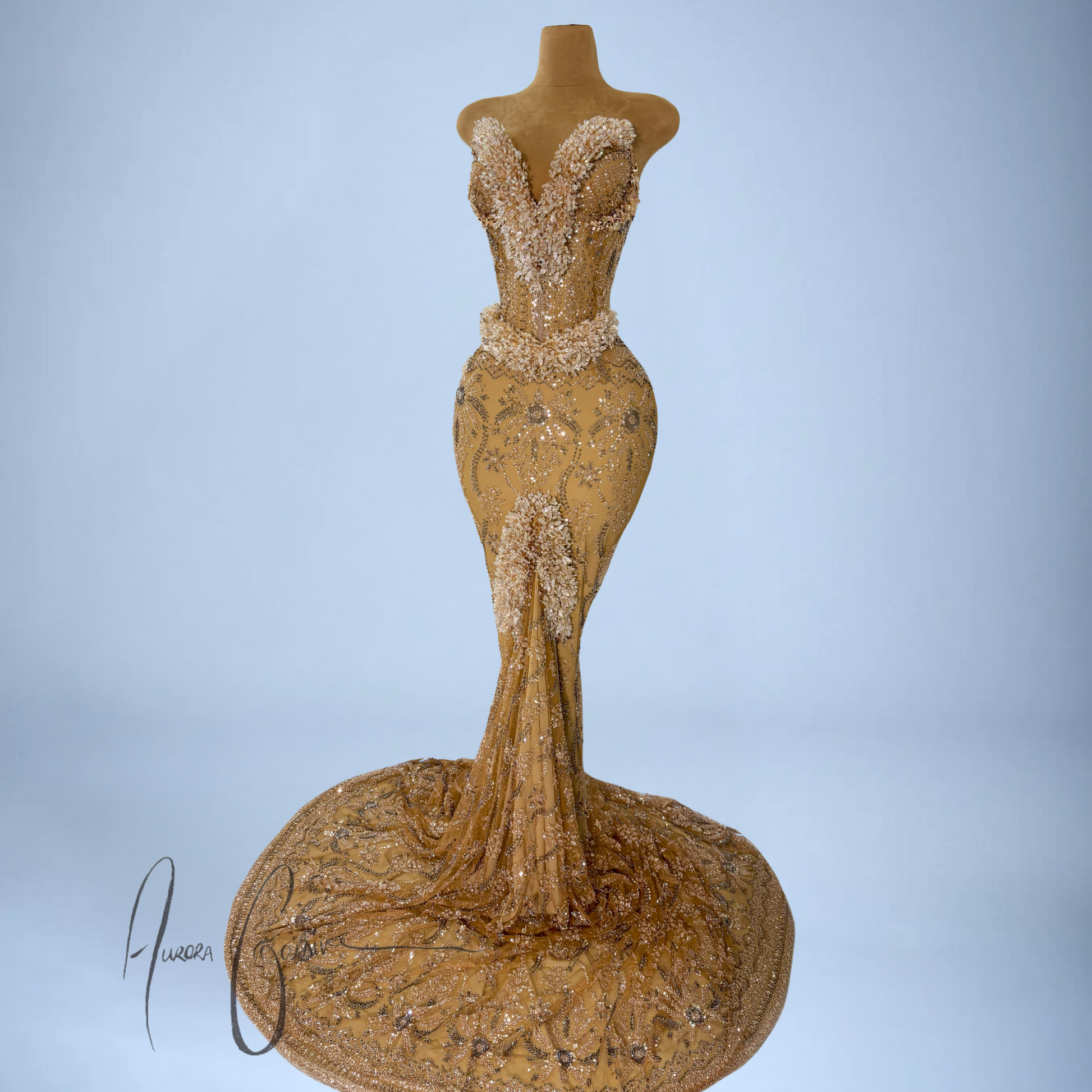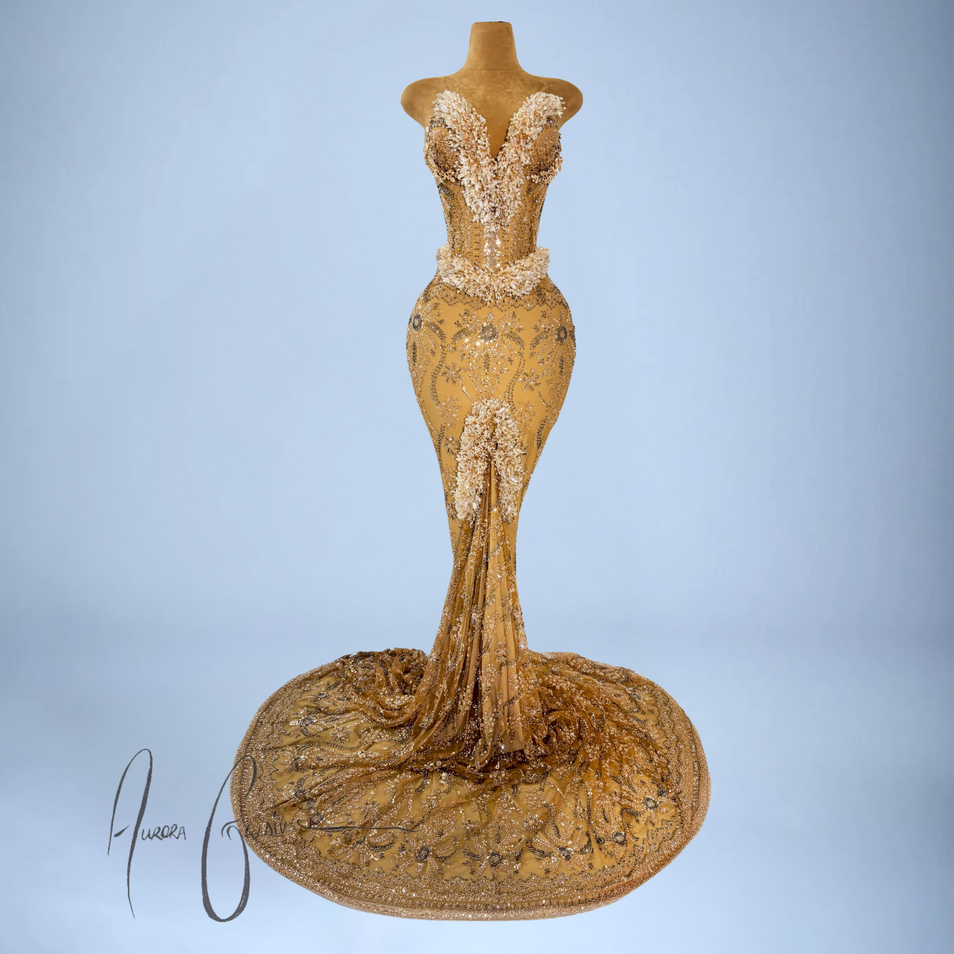 The Winnie Gown is a true work of couture with rich craftsmanship and detail, sculpted into form, and made to give a lasting impression. Designed in a structured mermaid silhouette, this gown features a lavish blend of copper, rose gold, and brown sequin embroidery intricately woven into a nude base.