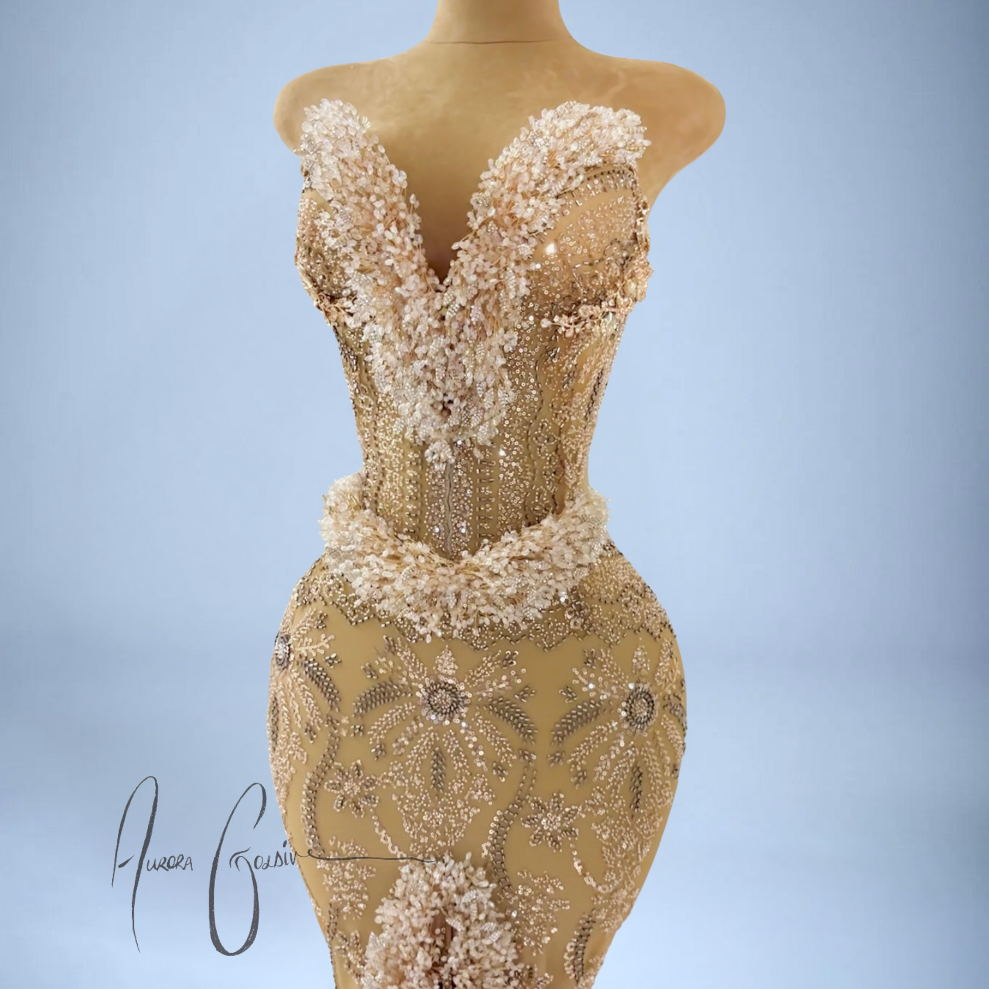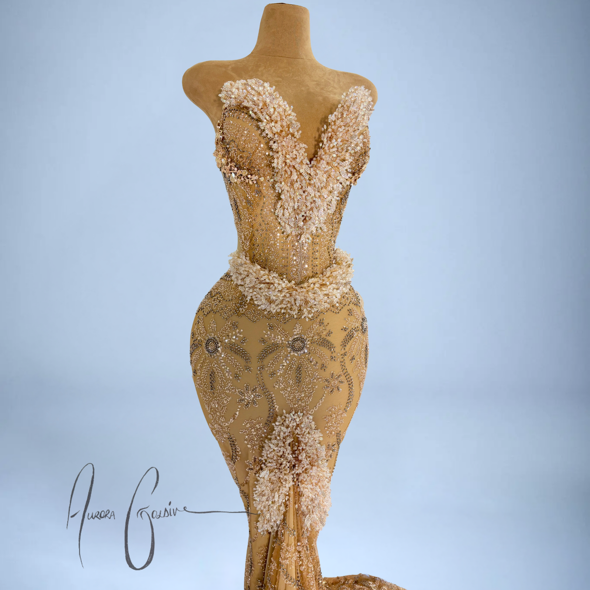 The corset-inspired bodice is adorned with lavish 3D hand-beaded florals that sparkle across the bust and cinch the waist, enhancing the hourglass shape. The design flares into a fully embellished tulle train, creating captivating texture and movement from every angle. Gleaming gemstones and sequins add a subtle shimmer, while maintaining a refined and artistic flow.